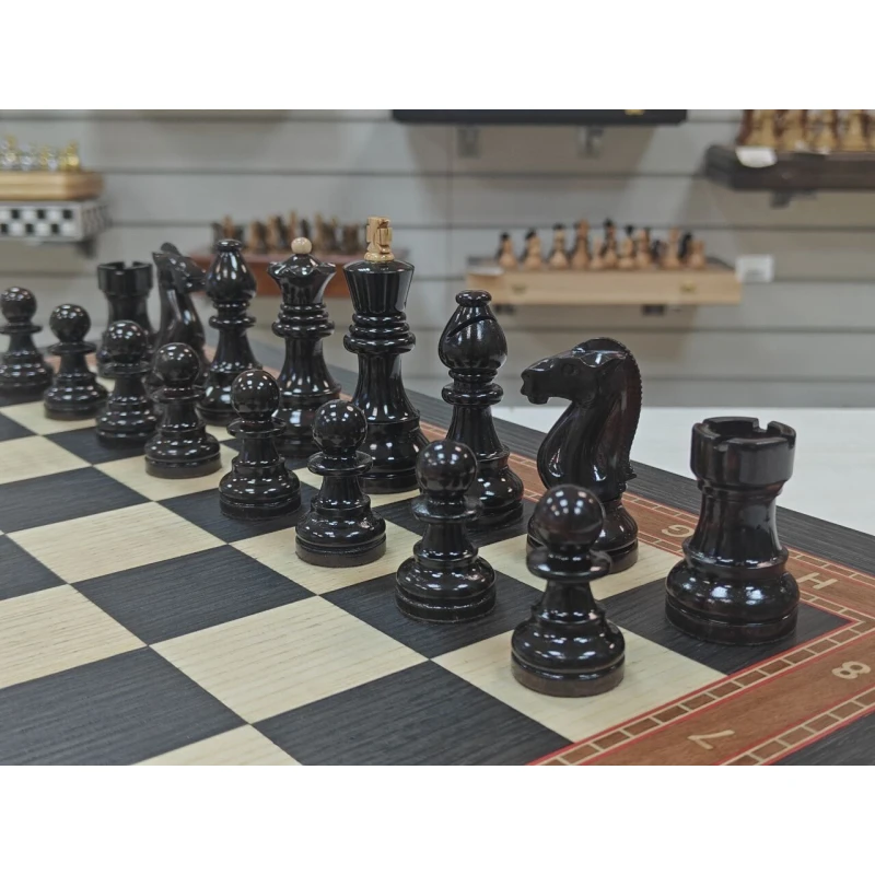 Размер доски 47 на 47 см. Размер клетки 4.5 см. Шахматные фигуры выполнены в классическом стиле Стаунтон и сделаны из карельской березы, покрыты глянцевым лаком.