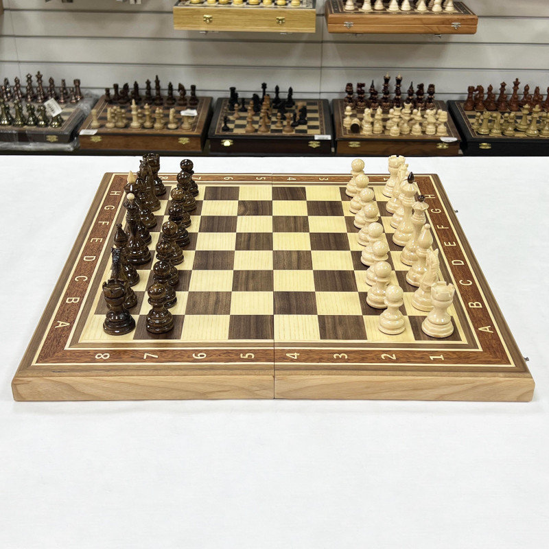 Размер доски в разложенном виде 50 на 50 см. Высота короля 9.5 см, высота пешки 5 см. Фигуры с утяжелением и подклейкой. Внутри доска покрыта ткань. Материал доски орех, ясень, бук. Закрывается доска на 2 замочка. Размер клетки 5 на 5 см. Ручная работа.
