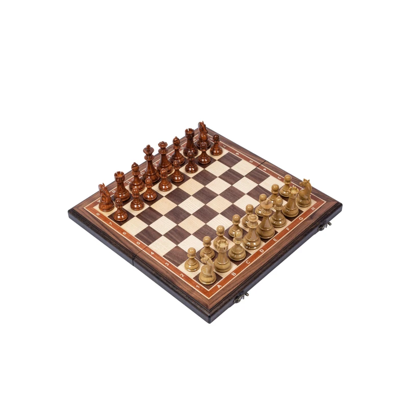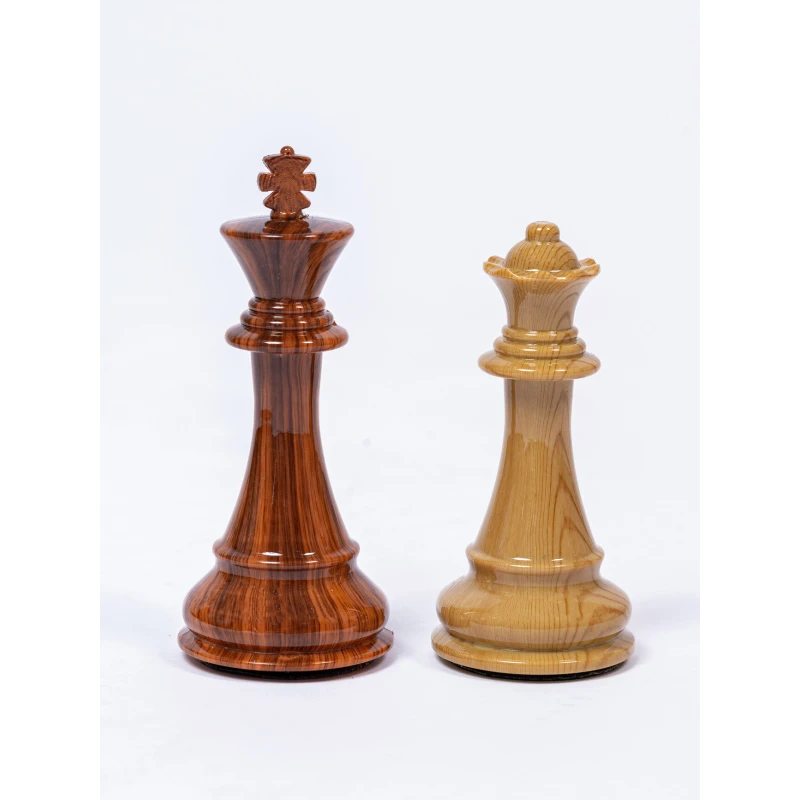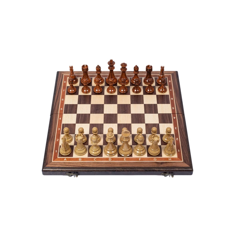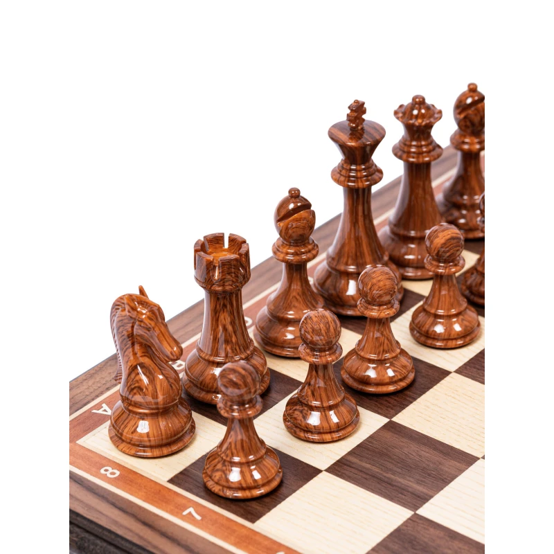 Большие турнирные шахматы с очень утяжеленными фигурами и с красивыми конем. Шахматная доска большого размера 50 на 50 см. Размер клетки 5 на 5 см, диаметр основания короля 4.7 см. Внутри доска покрыта барзатом, петли защищены, что бы не царапать стол. В основании шахматных фигур есть подкейка из эко кожи. Материал фигур композит, очень прочных и тактильно приятный. Шахматные фигуры выполнены в классическом дизайне Стаунтон, при этом с высокой детализацией коня.