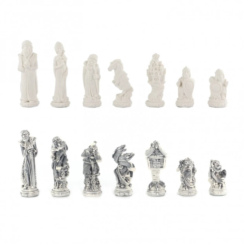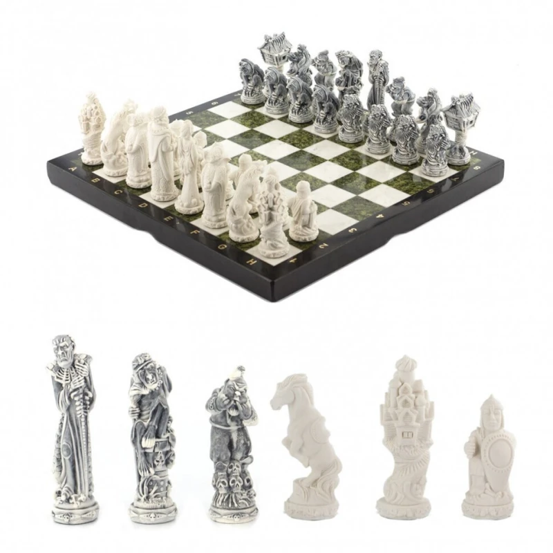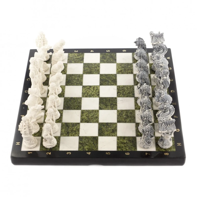 Подарочные шахматы из камня с фигурами Русские сказки. Размер доски 40 на 40 см. Высота короля 11.5 см. Подойдут в подарок взрослым и детям. Сделаны в России. Светлая клетка из мрамора, темная клетка из змеевика. Упакованы в чемодан.