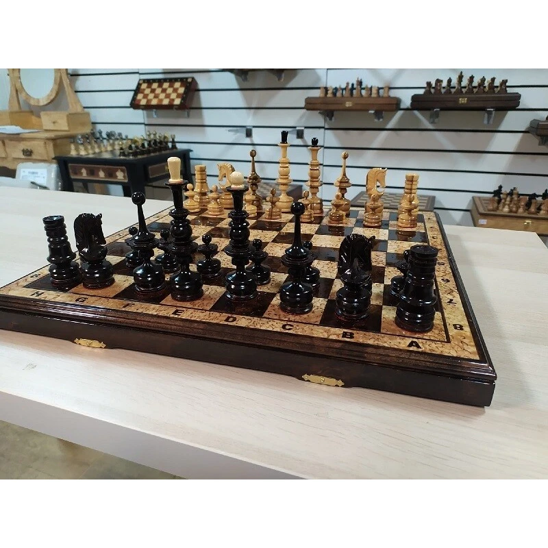 Эксклюзивные шахматы ручной работы. Доска сделана из карельской березы, фигуры из клена. Размер доски 45 на 45 см. Производство Россия.