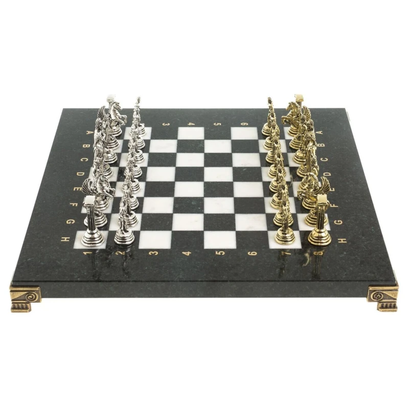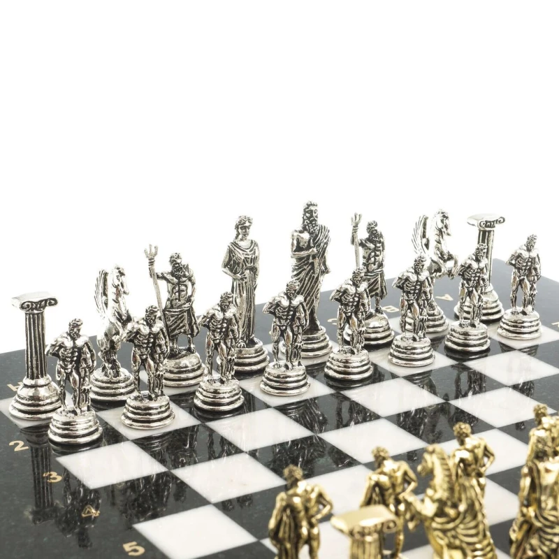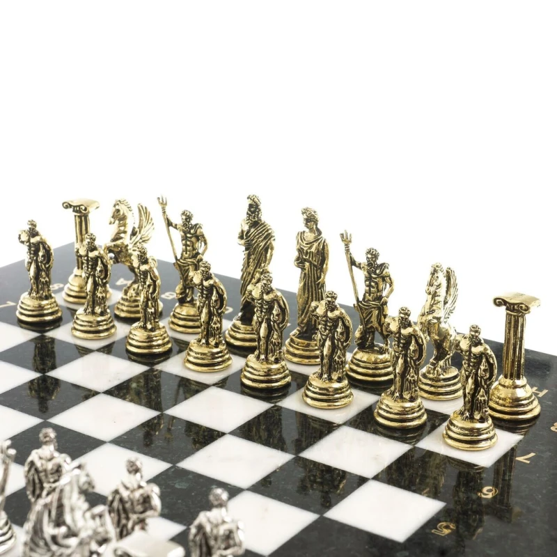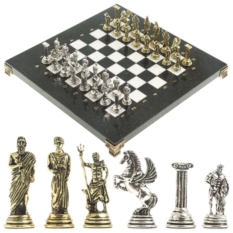 Шахматы выполнены вручную из природного камня, фигурки тематические Подвиги Геракла из металла с покрытием под золото и серебро, имеют размеры: доска 28х28х3 см, клетка 2,5х2,5 см, высота фигур: пешка 4 см, король 5,5 см и весят 6650 г. Настольные шахматы из камня с эксклюзивными фигурами станут отличным подарком на юбилей отцу, шахматисту или просто любителю игры. В наборе футляр из экокожи.