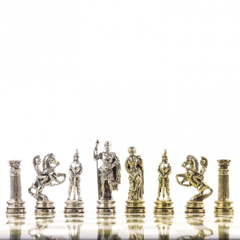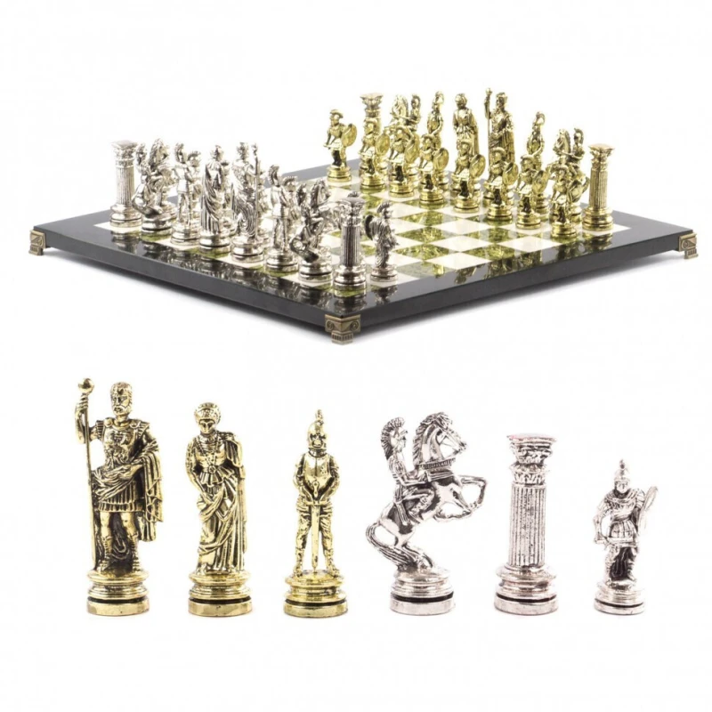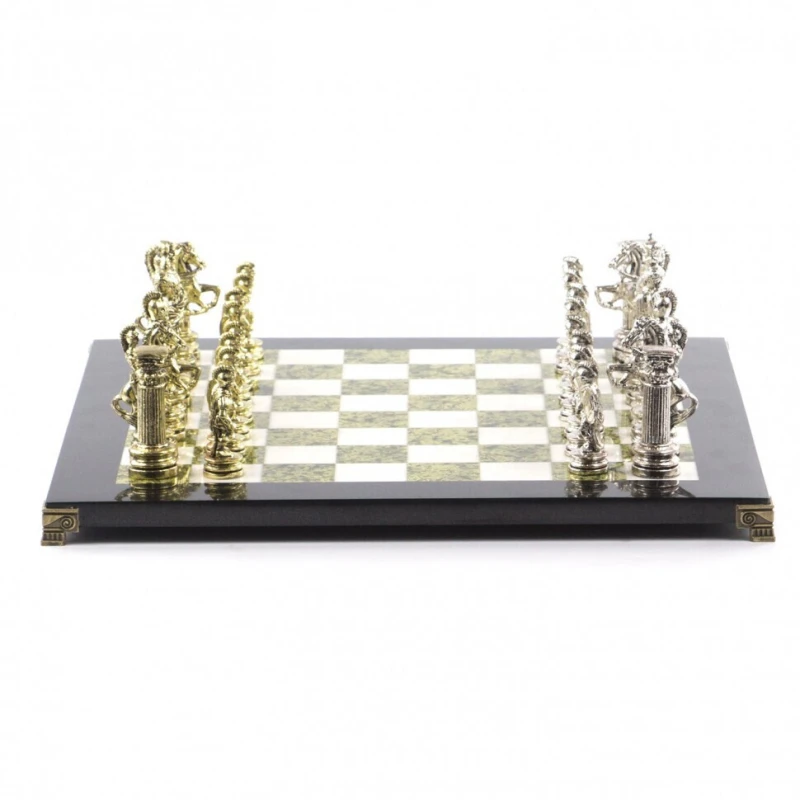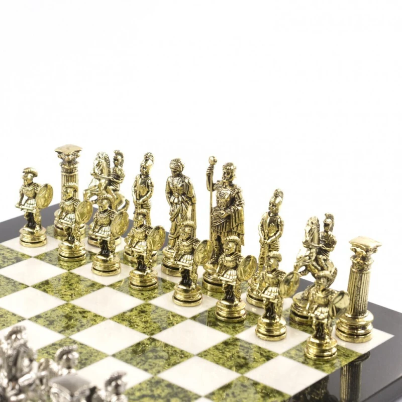 Эксклюзивные шахматы из камня змеевик и мрамор с металлическими фигурами. Размер доски 44 на 44 см. Шахматы упакованы в чемодан. Высота короля 9.5 см. Высота пешки 6.7 см. Фигуры с подклейкой.