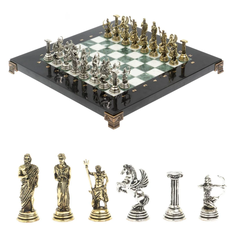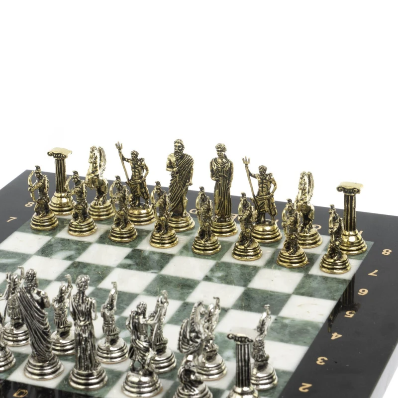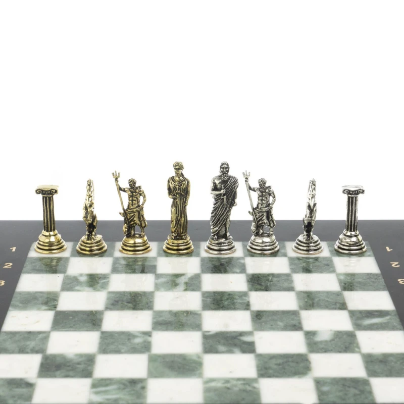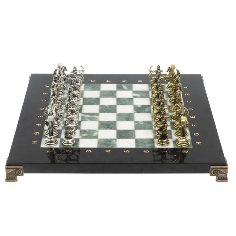 Набор для игры в шахматы "Римские лучники" изготовлен вручную, доска из натурального камня, фигуры из металла в цвете золото и серебро. Характеристики: • доска 28х28х2,5 см • клетка 2,5х2,5 см • высота фигур: пешка 3,7 см, король 5,3 см • упаковка: подарочный кейс из экокожи • вес 6300 г.