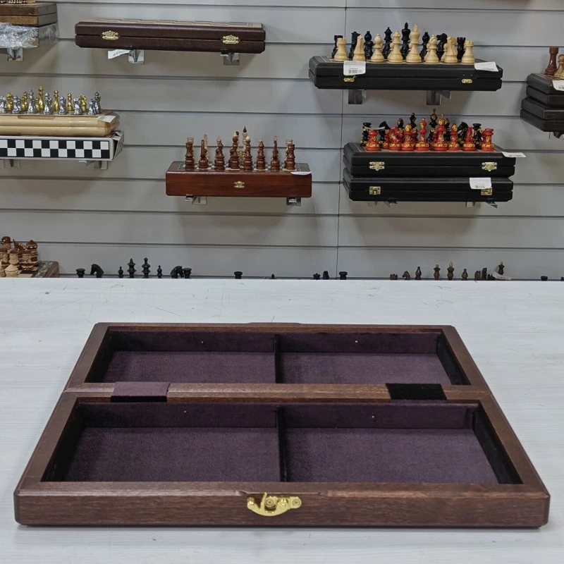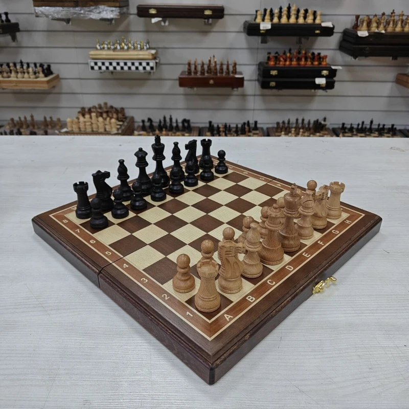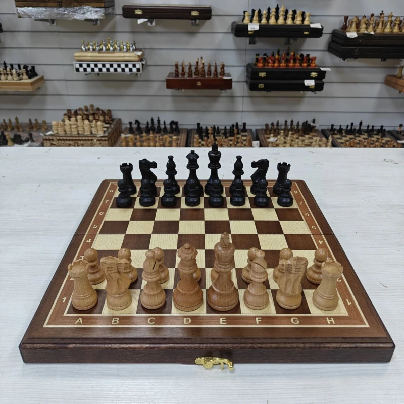 Турнирные шахматы ручной работы из дерева. Размер доски в разложенном виде 40 на 40 см. Материал доски красное дерево, ясень, береза. Шахматное поле собирается вручную в технике маркетри. Высота короля 9.5 см, высота пешки 4.5 см, фигуры с утяжелением. Форма фигур классический Стаунтон. Сделаны в России.