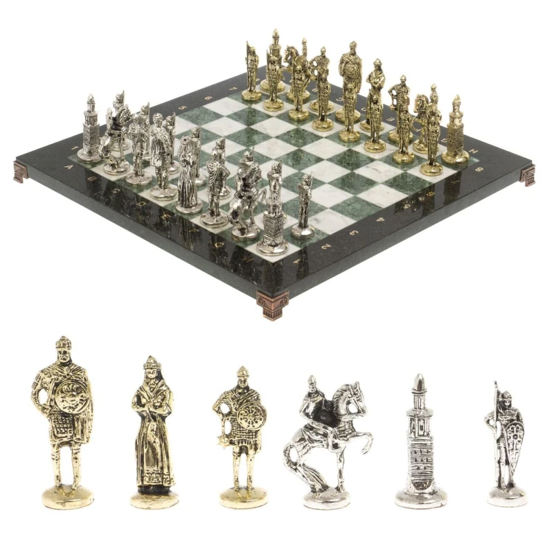 Красивые статусные шахматы в кабинет или загородный дом. Подарочные шахматы с каменной доской и металлическими фигурами. Размер доски 40 на 40 см. Упакованы в чемодан покрытый эко кожей. Подойдут в подарок для взрослых и детей. Шахматная доска нескладная. Темная клетка змеевик, светлая мрамор. Сделаны в России.