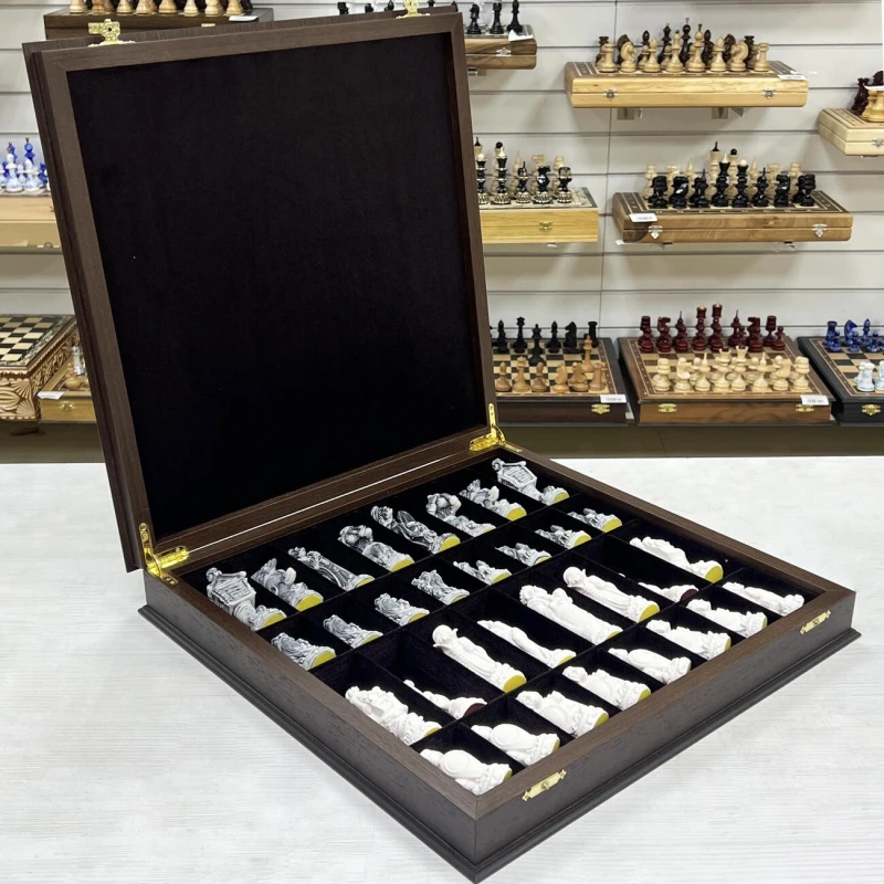 Размер доски 45 на 45 см. Высота короля 11.5 см, высота пешки 6 см. Материал фигур литьевой мрамор. Материал доски черное дерево, ясень. Внутри доски есть ячейки для каждой фигуры. Доска закрывается на 2 замочка.