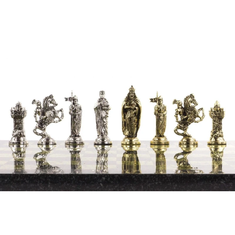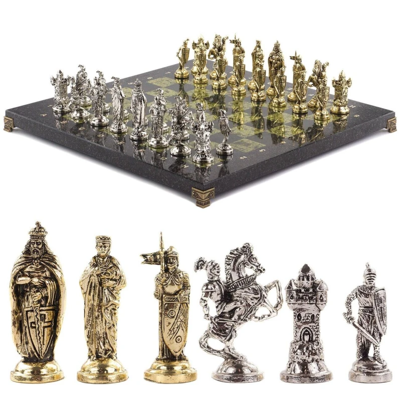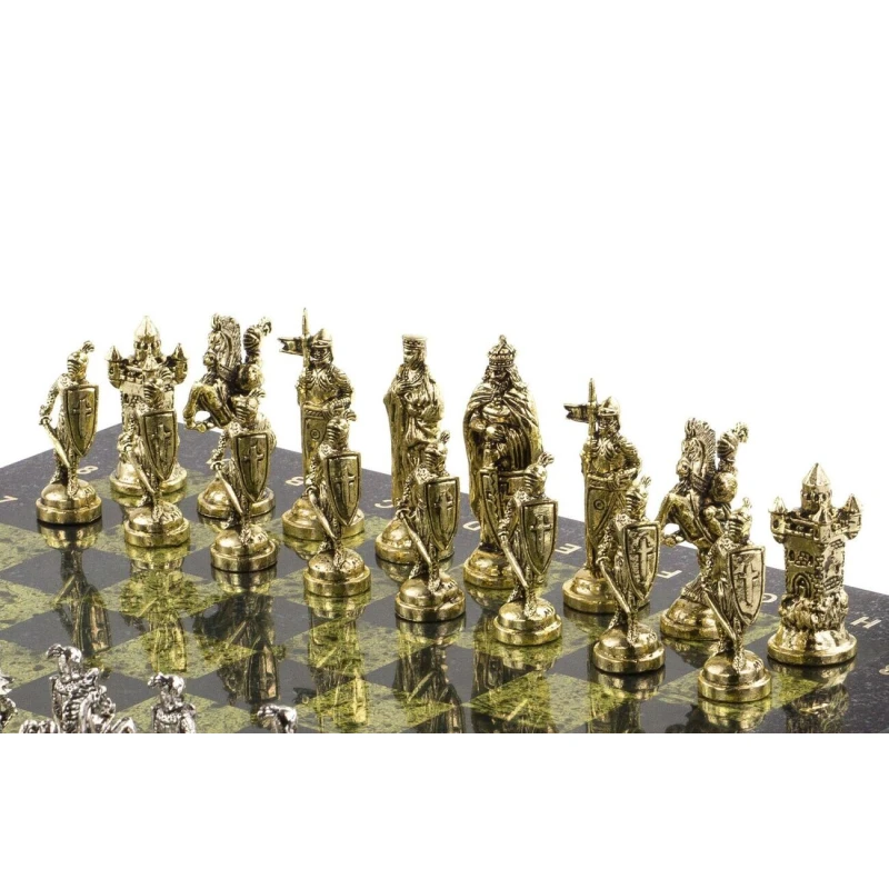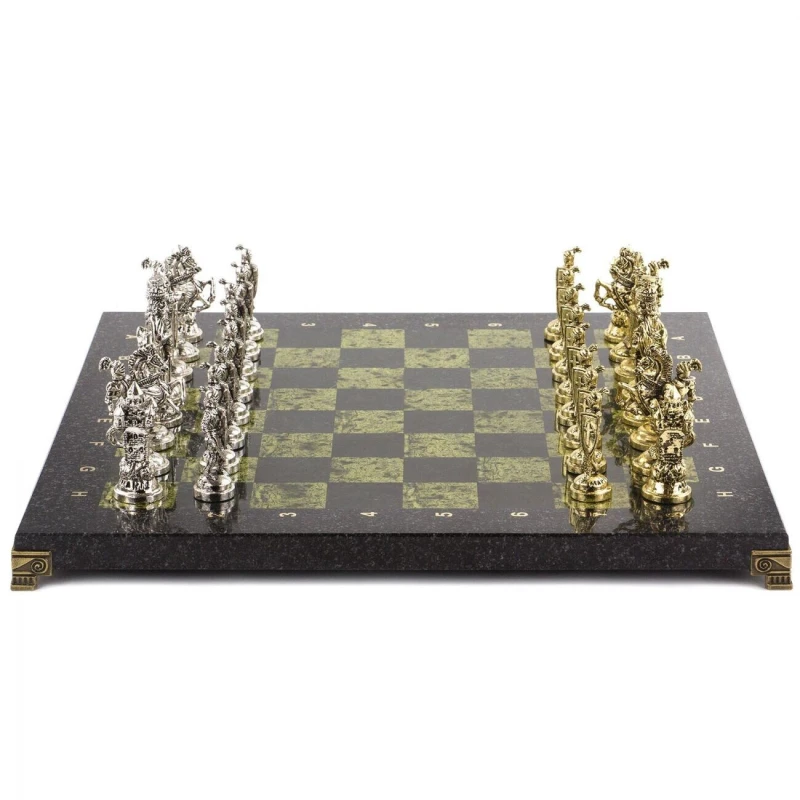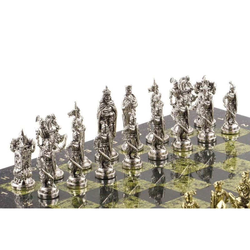 Шахматы выполнены из натурального зеленого и черного змеевика, фигуры из металла в цвете золото и серебро, имеют размеры доски 44х44х3 см и весят 14500 г. Высотка короля -9 см, высота пешки - 6.6см. Подарочные шахматы из камня с эксклюзивными фигурами станут отличным подарком на день рождения мужчине, шахматисту или просто любителю игры. В комплекте кейс из экокожи. Сделано в России.