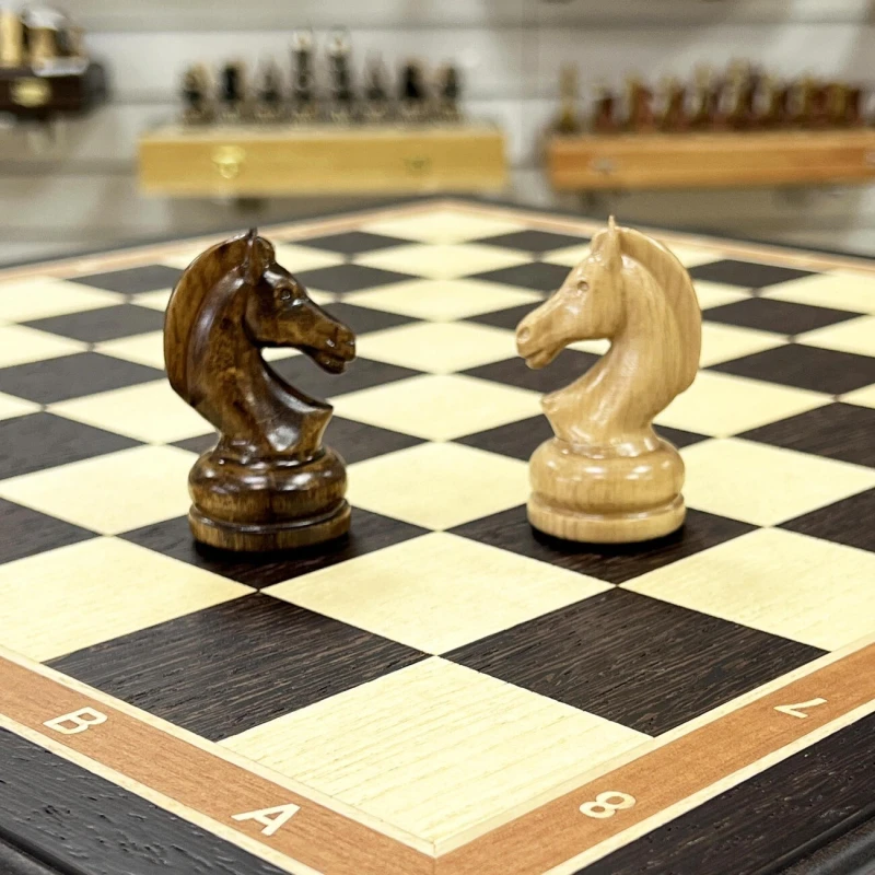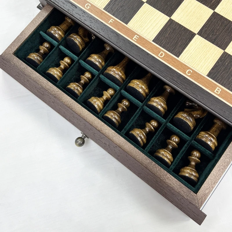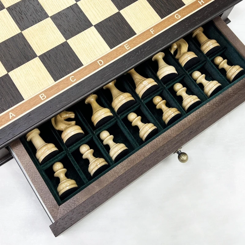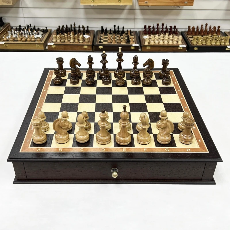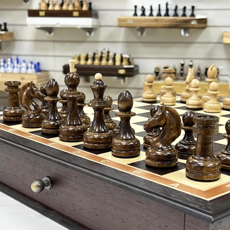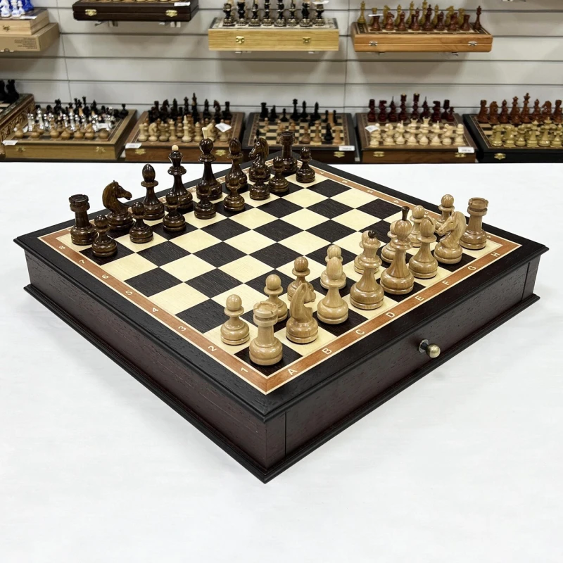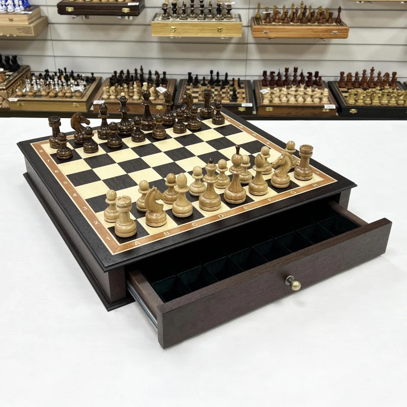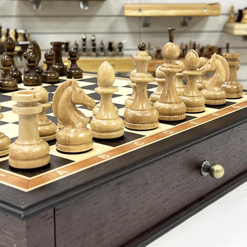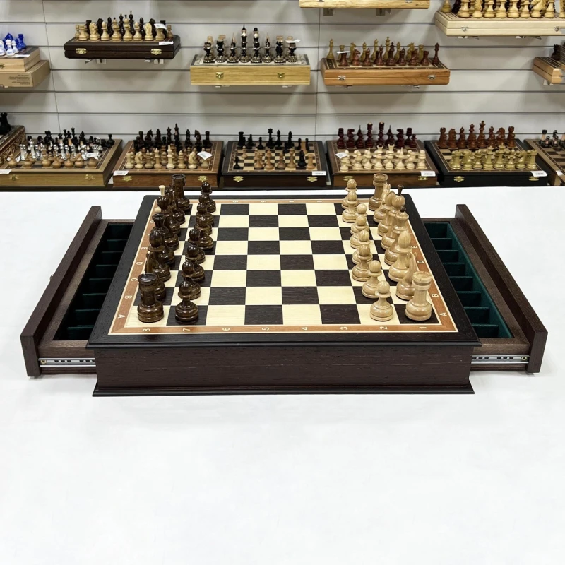 Большие деревянные шахматы с утяжеленными фигурами и с удобными выдвижными ящиками для бережного хранения фигур. Размер доски 48 на 48 см. Размер клетки 5 на 5 см. Высота короля 10 см, высота пешки 5 см. Шахматное поле собирается в технике маркетри из венге и ясеня. Хороший подарочный набор шахмат для ценителей качественных и красивых изделей.