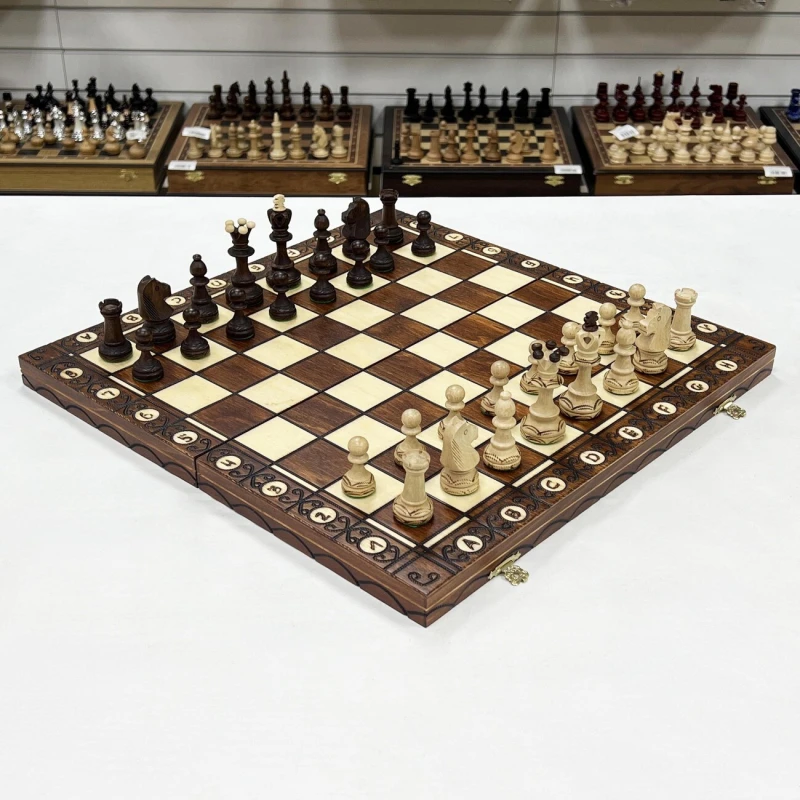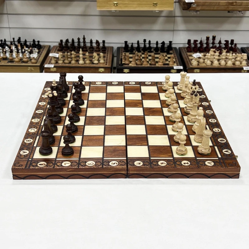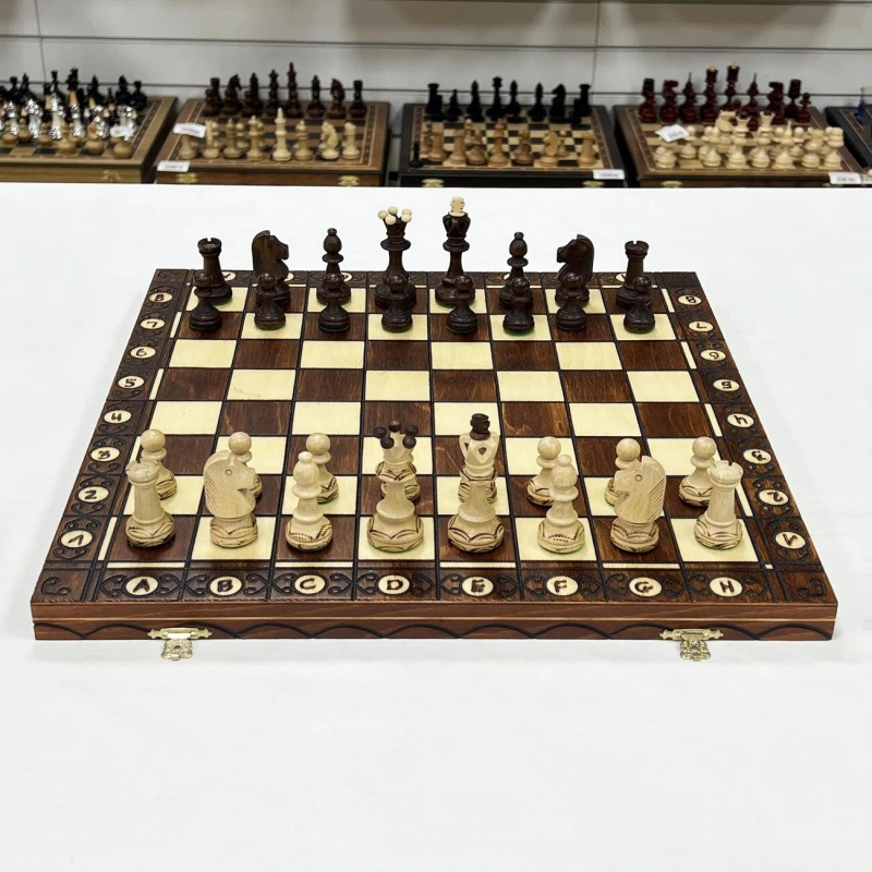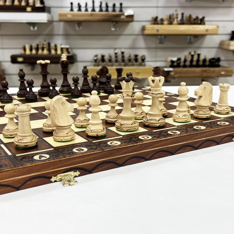 Шахматы "Сенатор", Wegiel – коллекционный набор классической настольной игры, изготовленный одним из лучших польских производителей. Элементы набора сделаны вручную из высококачественной натуральной липовой древесины. Каждая фигура украшена резьбой и выжиганием, а также покрыта защитным лаком. Массивная доска сделана из того же материала и дополнена медной фурнитурой. Это гарантирует ее износостойкость и устойчивость к активной эксплуатации. Внутренняя сторона доски выполнена в виде кейса с ячейками для хранения фигур. Под каждую фигуру предусмотрена своя индивидуальная ячейка, что обеспечивает их сохранность при хранении и транспортировке.