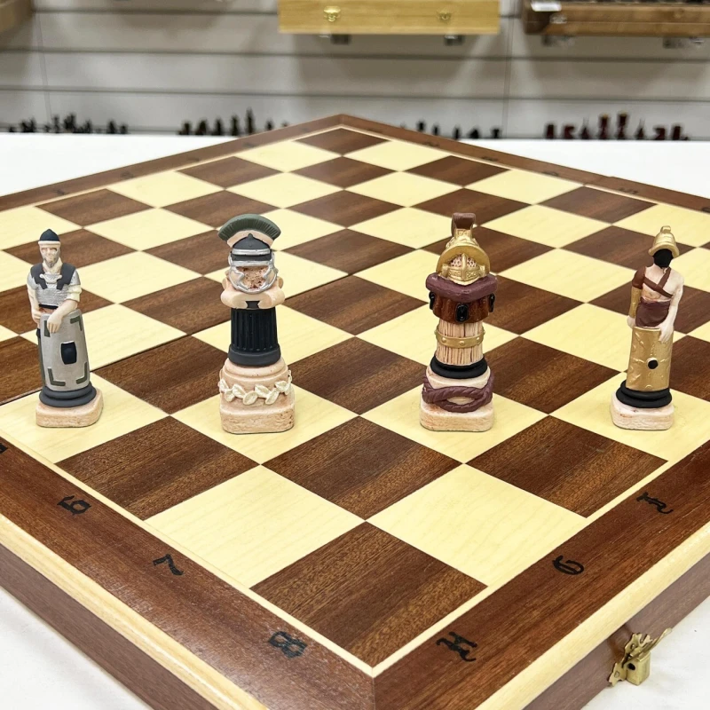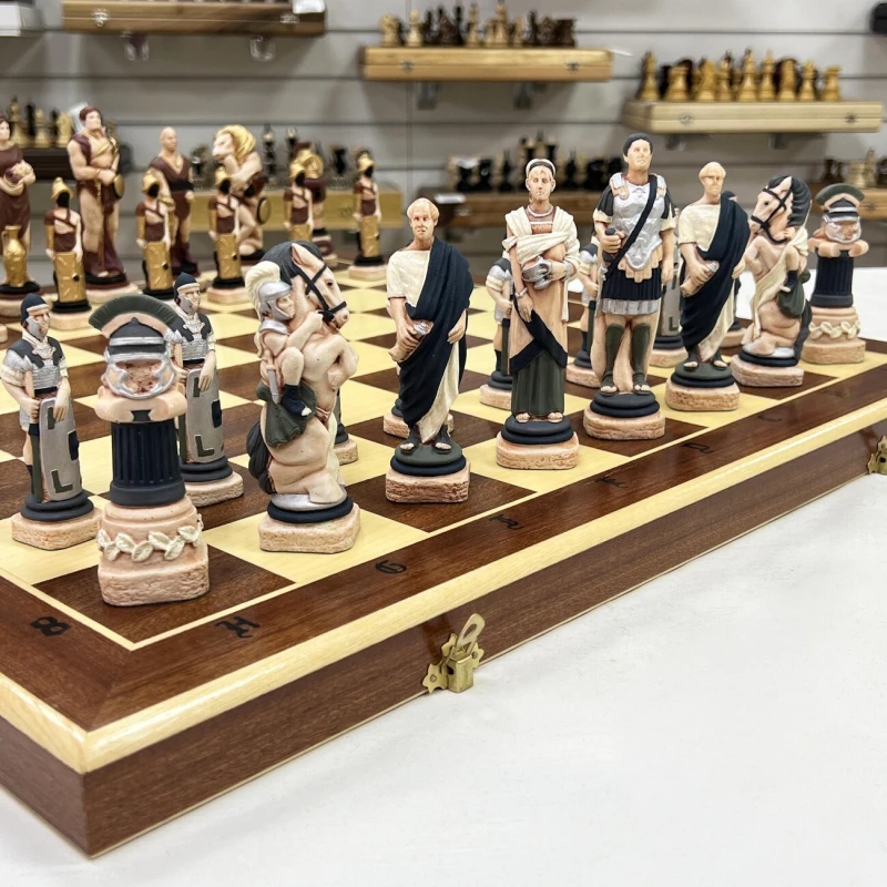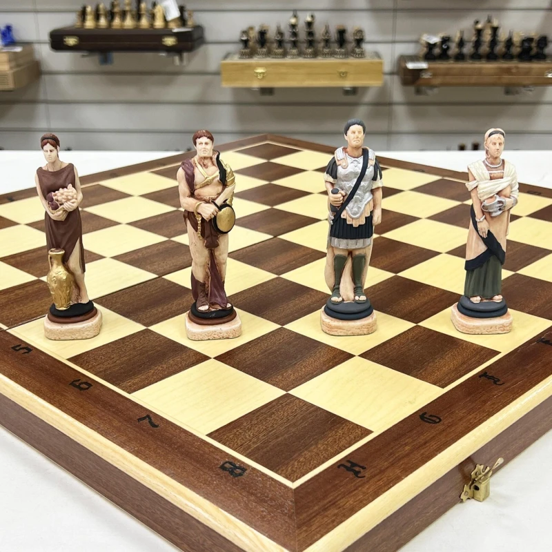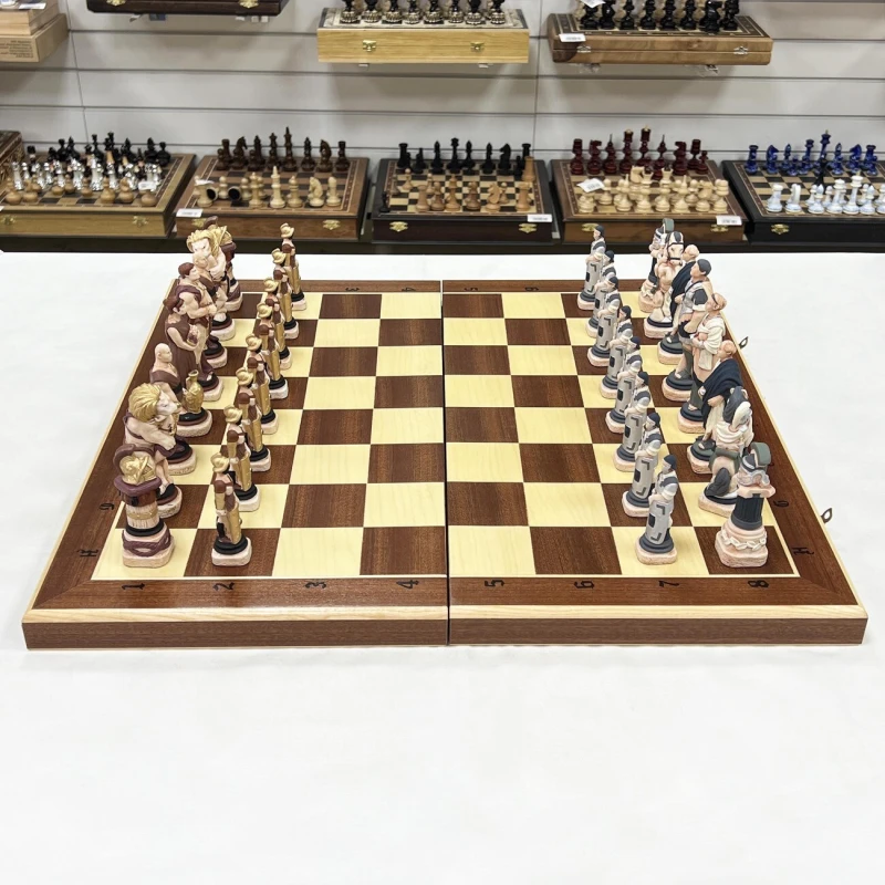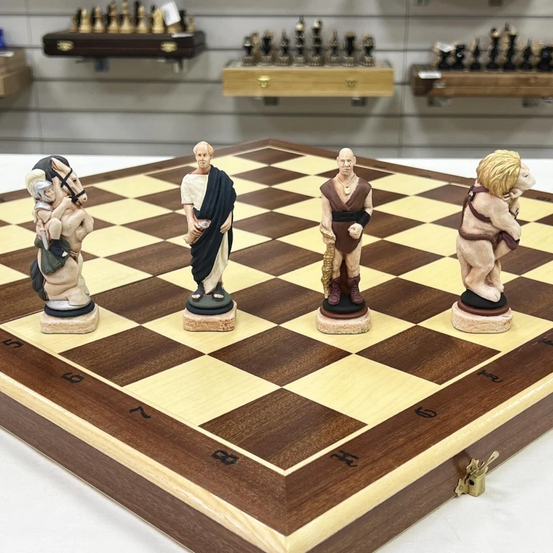 Шахматы с эксклюзивными фигурами ручной работы. Доска сделана из массива дерева, украшена шпоном в технике маркетри. Размер доски 60 х 60 см, клетка -6 см. Фигуры выполнены из искусственного камня в древне- римской тематике. Размер короля - 16 см, пешки -9 см. Фигуры утяжелены и подклеены у основания для защиты доски от царапин.