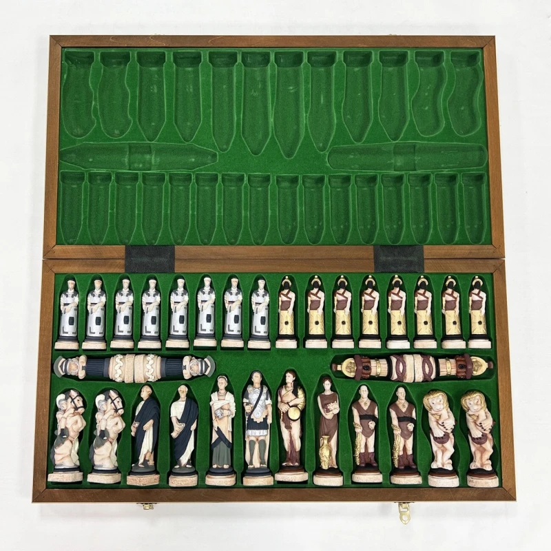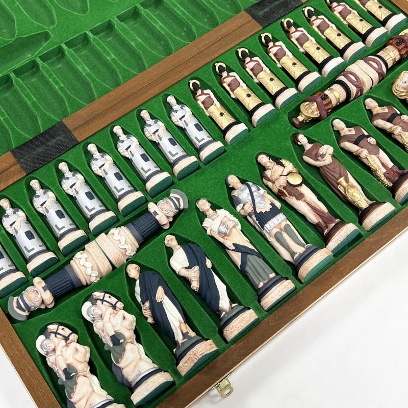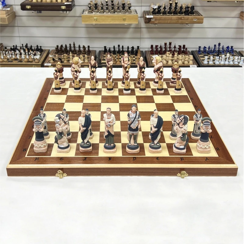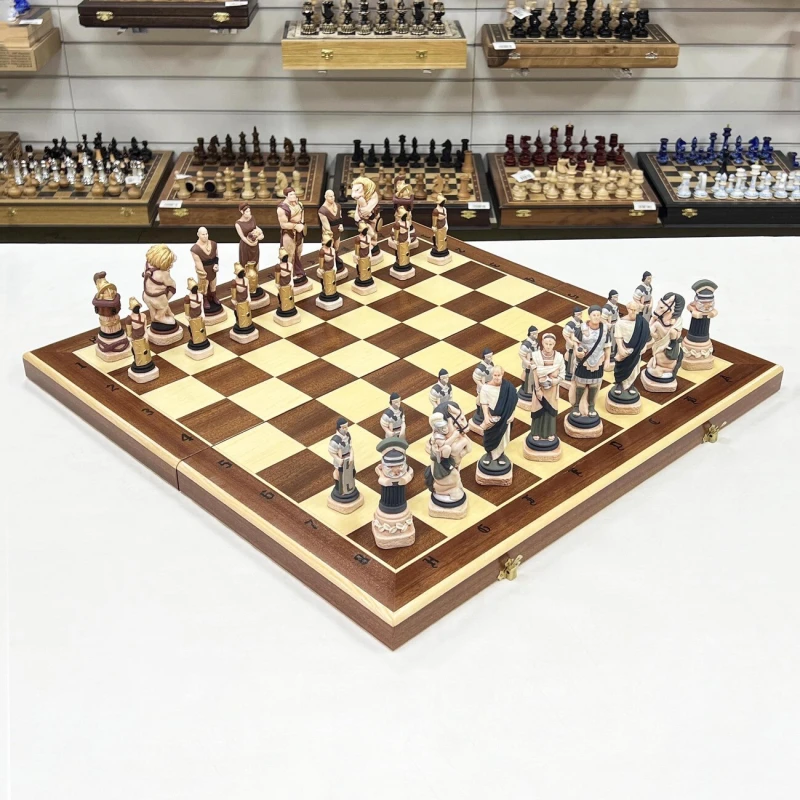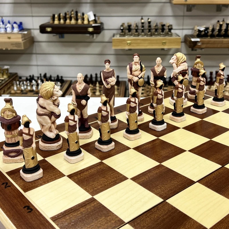 Шахматы с эксклюзивными фигурами ручной работы. Доска сделана из массива дерева, украшена шпоном в технике маркетри. Размер доски 60 х 60 см, клетка -6 см. Фигуры выполнены из искусственного камня в древне- римской тематике. Размер короля - 16 см, пешки -9 см. Фигуры утяжелены и подклеены у основания для защиты доски от царапин.