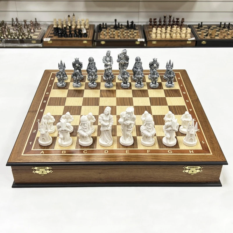 Эксклюзивные шахматы в деревянном ларце с детализированными фигурами в виде сказок. Размер доски 45 на 45 см. Внутри есть ячейки для хранения фигур. Отличный подарок для ценителей коллекционных шахмат. Подойдут в качестве интерьерного элемента в кабинет, в дом или в квартиру. Доска закрывается на 2 замочка. На первый взгляд может показаться, что фигуры сложно различить. В живую, когда шахматные фигуры выставлены на доске становится понятно какая фигура что обозначает. Проведите время с детьми за игрой в красивые шахматы в сказочном стиле.