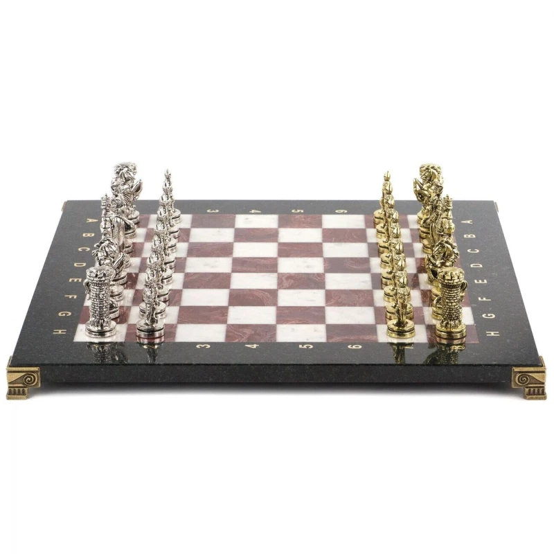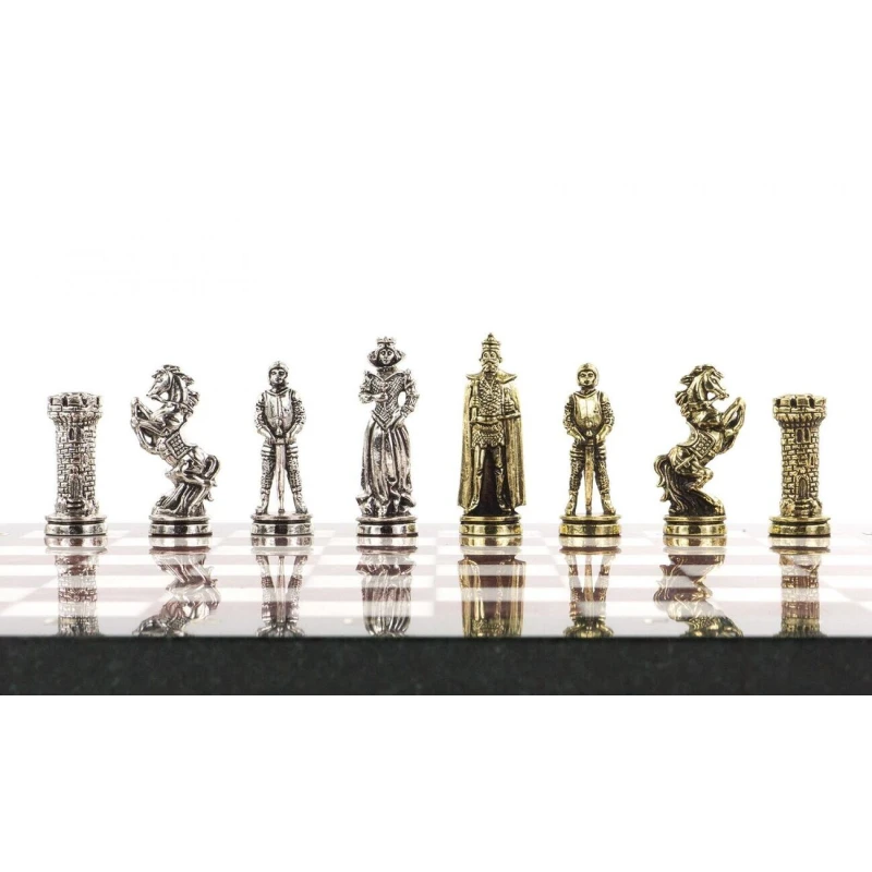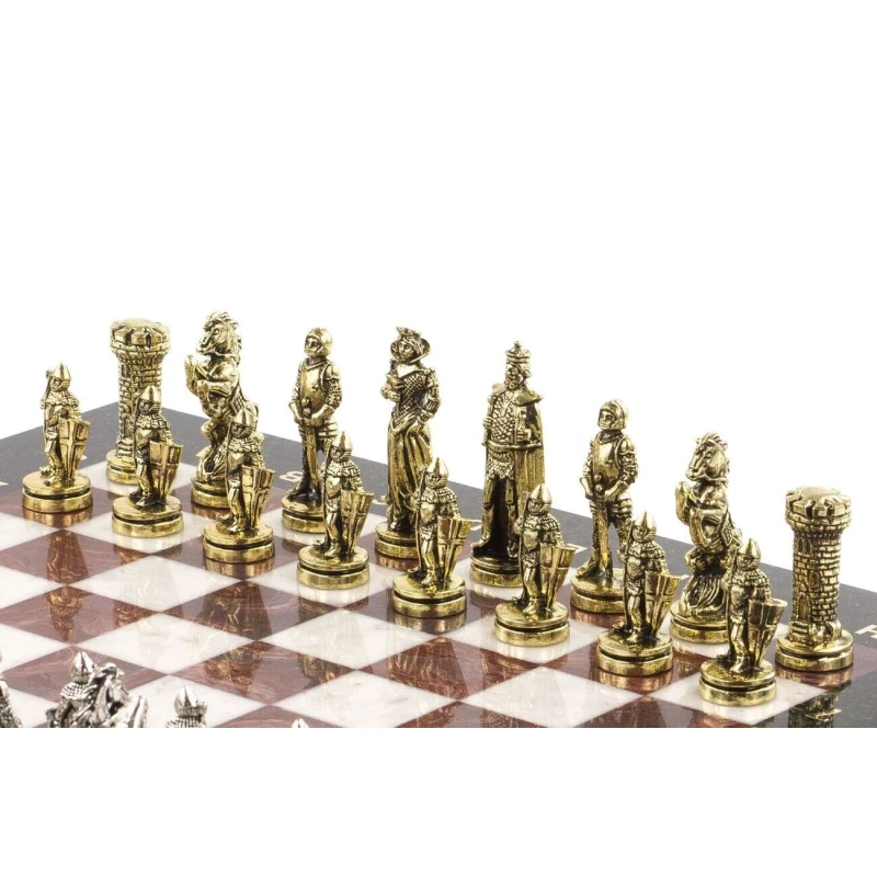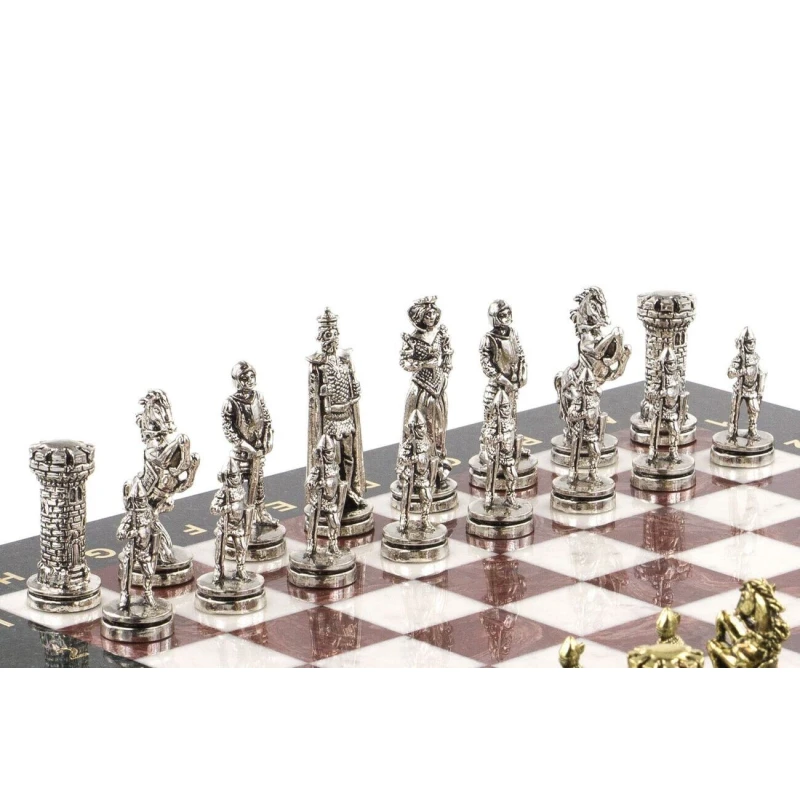 Необычные подарочные шахматы из металла и камня. Размер доски 36 на 36 см. Шахматная доска сделана из камня змеевик, мрамор и лемезит. Шахматные фигуры в стиле средневековых рыцарей изготовлены из металла замак. Шахматы упаковы в чемодан из эко кожи. Высота короля 6.8 см. Шахматная доска цельная и достаточно тяжелая.