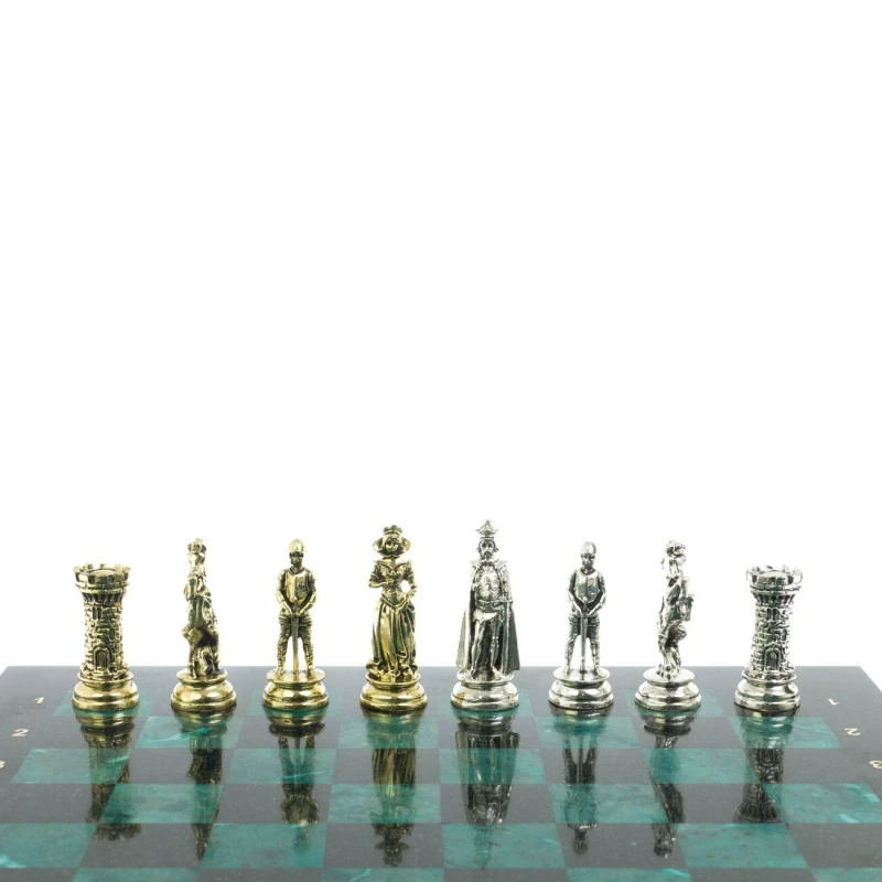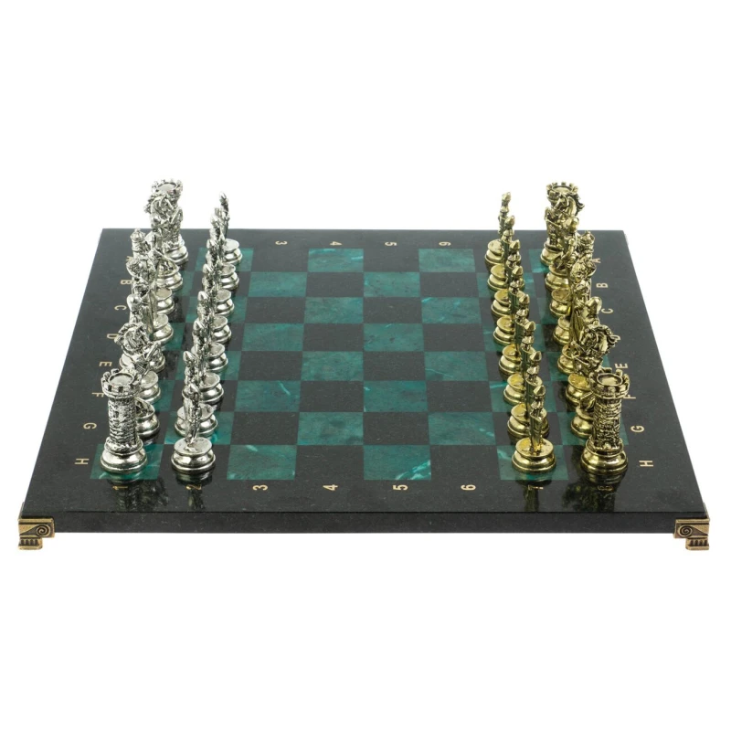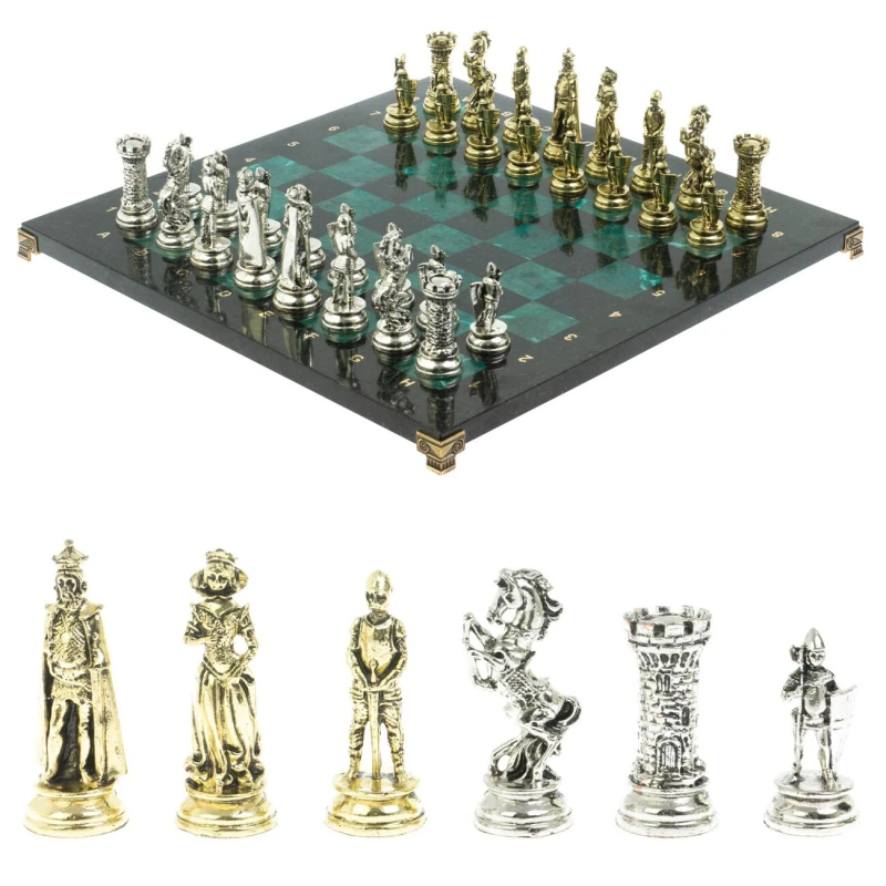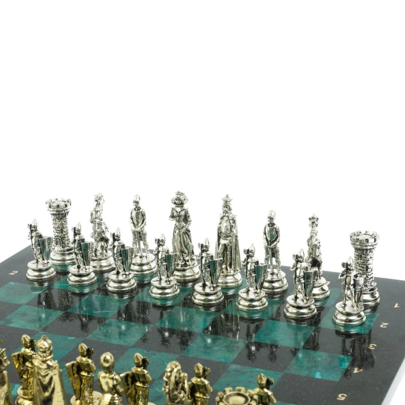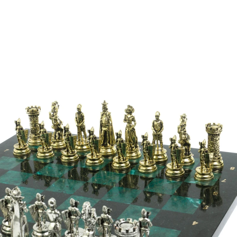 Набор для игры в шахматы "Средневековые рыцари" изготовлен вручную, доска из натурального камня, шахматные фигуры металлические в цвете золото и серебро. Характеристики: • доска 44х44х2,5 см • клетка 4,5х4,5 см • высота фигур: пешка 8 см, король 10 см • упаковка: подарочный кейс из экокожи • вес 14500 г.