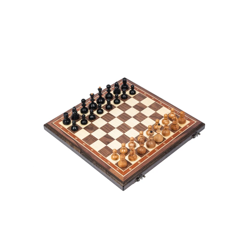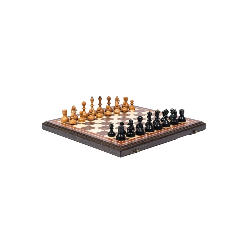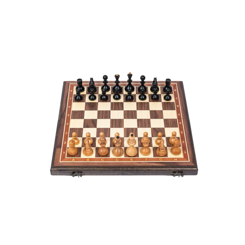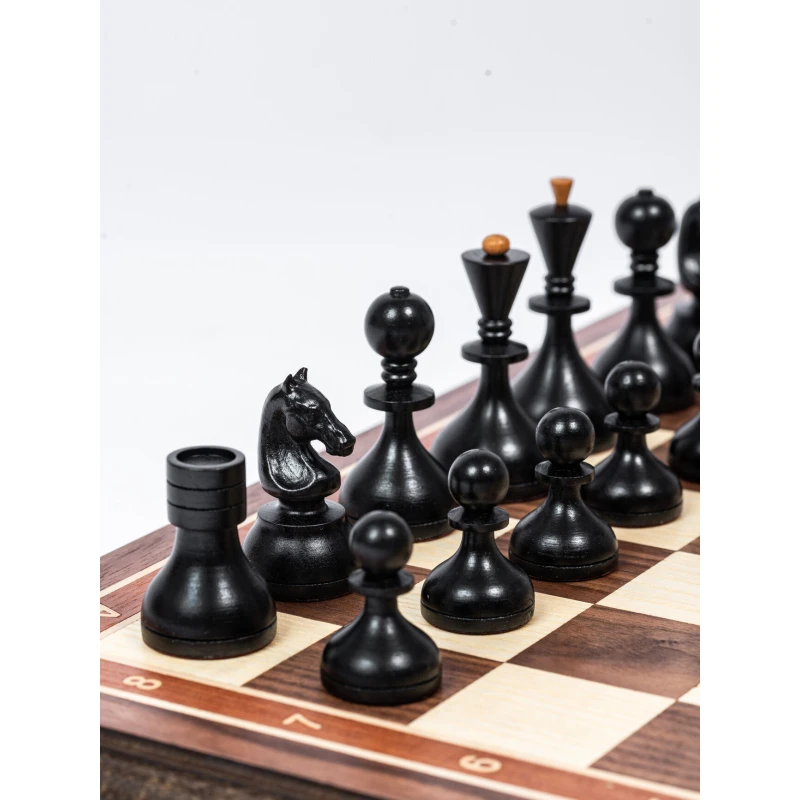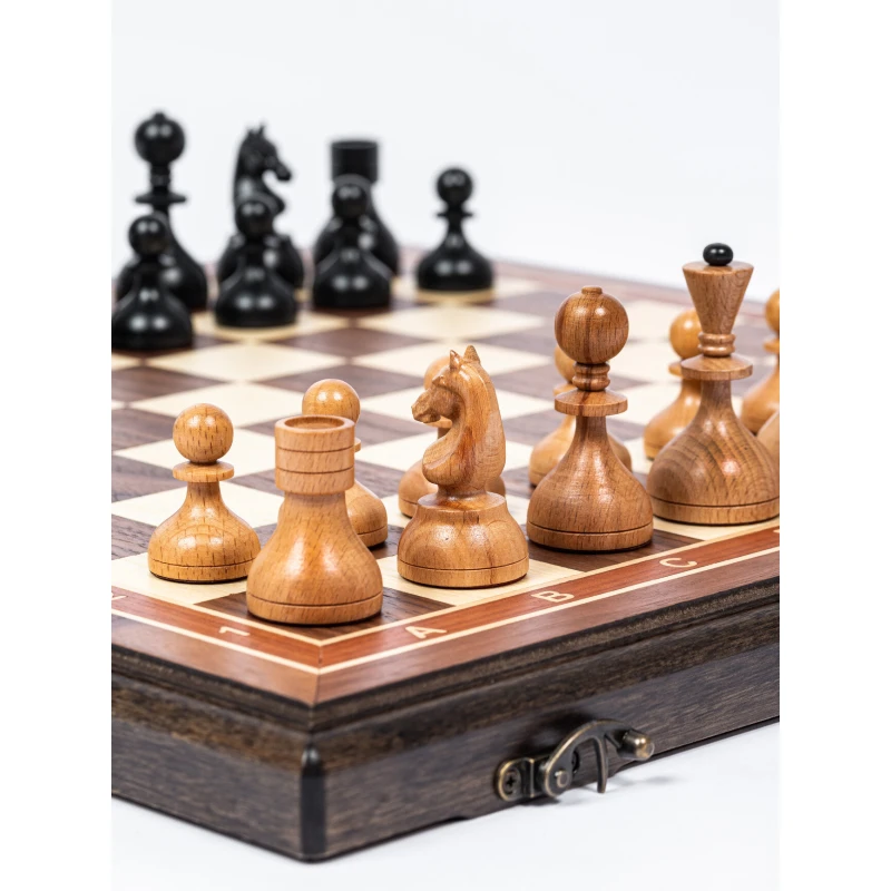 Подарочные шахматы из дерева в ретро стиле Советской эпохи. Размер доски в разложенном виде 45 на 45 см. Шахматные фигуры очень устойчивые за счет утяжеления и диаметра основания. Размер клетки 4.5 см. Поле шахматной доски собирается из разных пород дерева, темная клетка орех, светлая клетка ясень. Внутри доска покрыта бархатом. Сделаны в России.