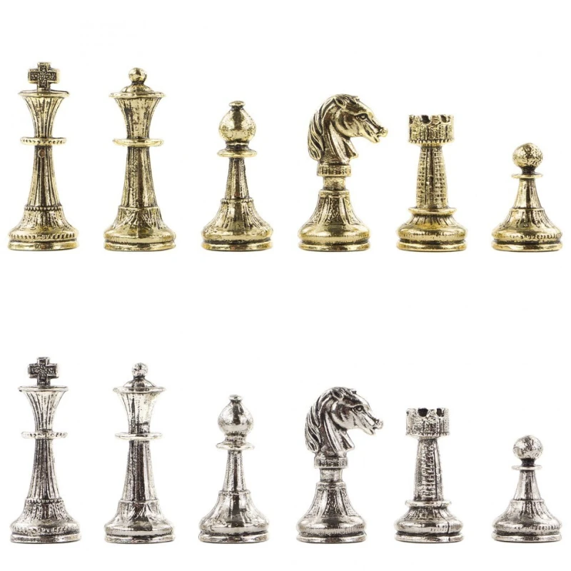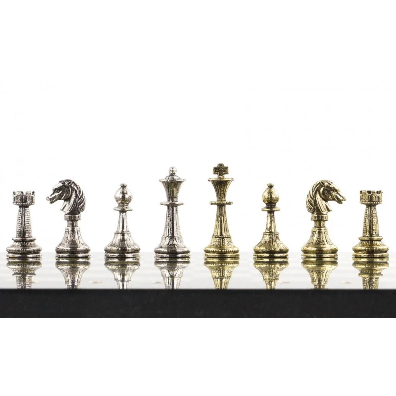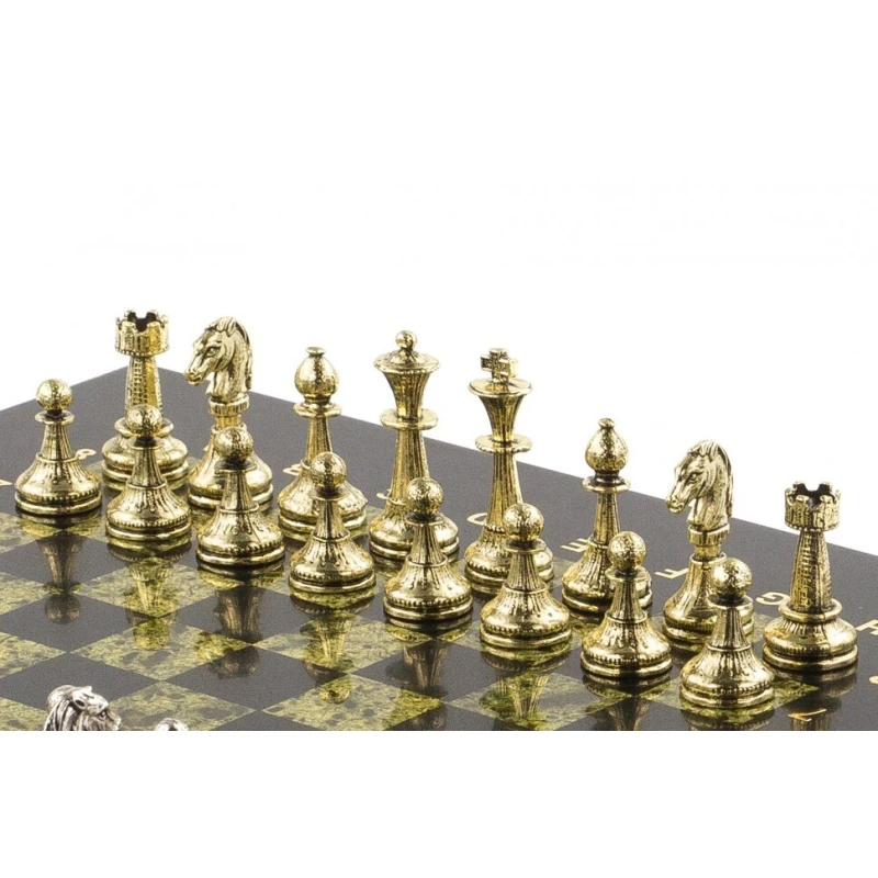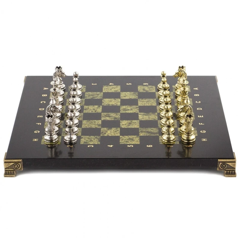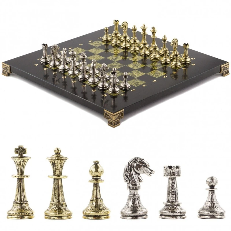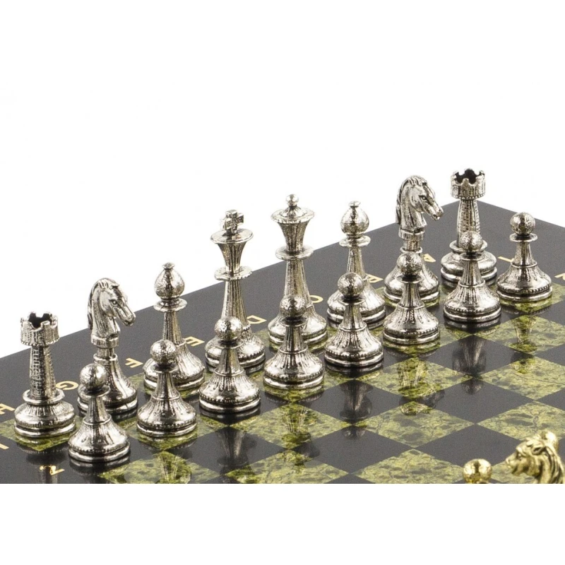 Шахматы изготовлены из природного камня змеевик, фигуры из металла с покрытием под золото и серебро, имеют размеры доски 28х28х2,5 см и весят 6300 г.