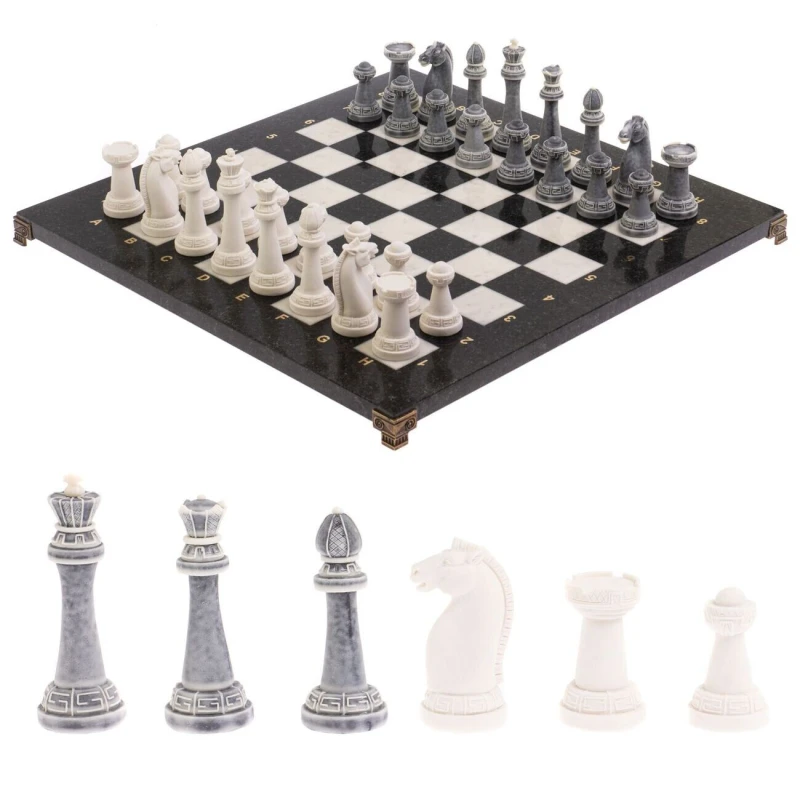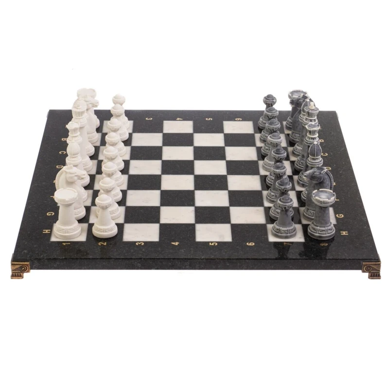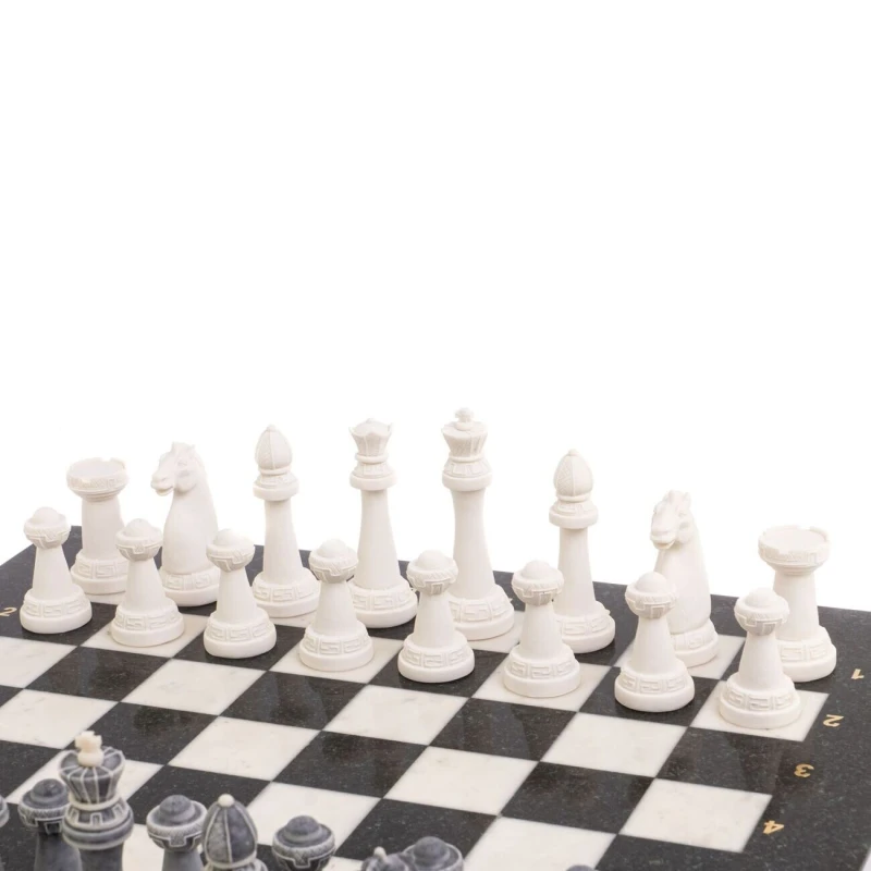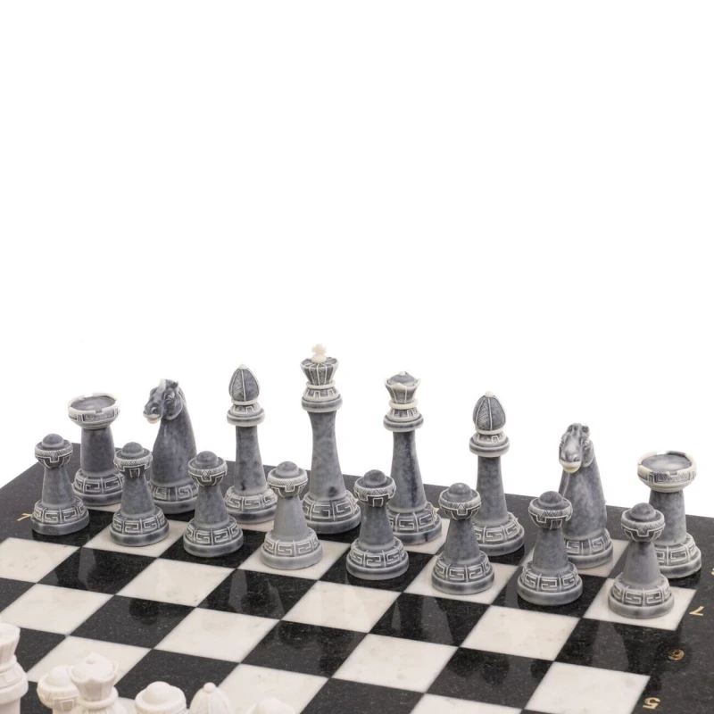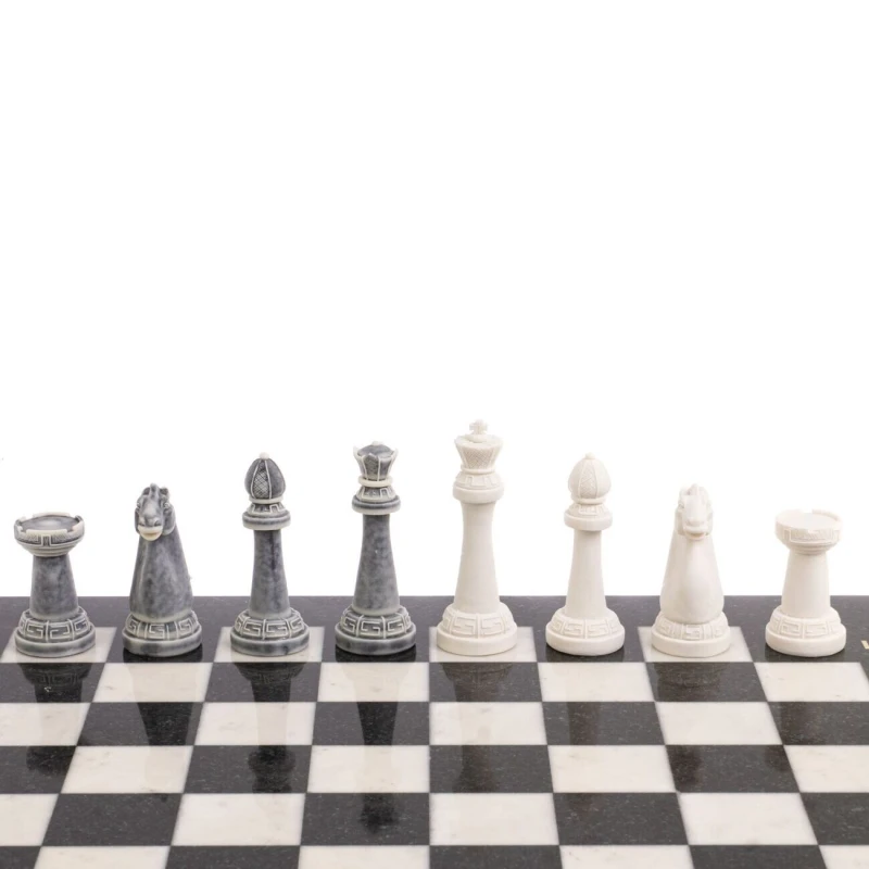 Шахматный набор изготовлен вручную, доска из натурального камня, фигуры из искусственного мрамора. Каждое изделие имеет индивидуальный оттенок и рисунок. Допускается наличие естественных прожилок в камне, размеры могут немного отличаться Размеры: доска 44х44х3 см, клетка 4,5х4,5 см, высота фигур: пешка 5,5 см, король 9,1 см