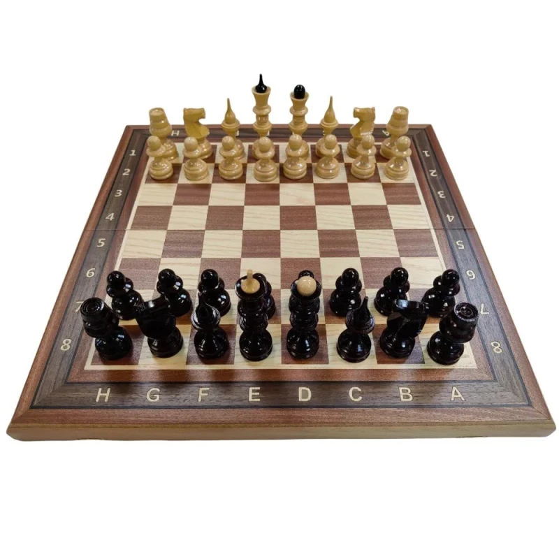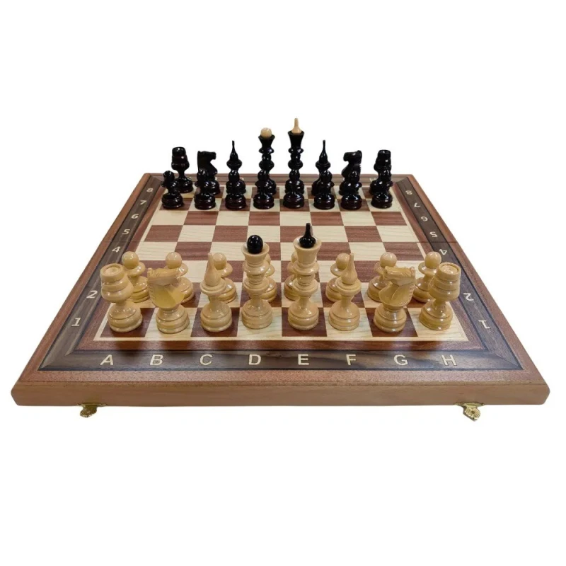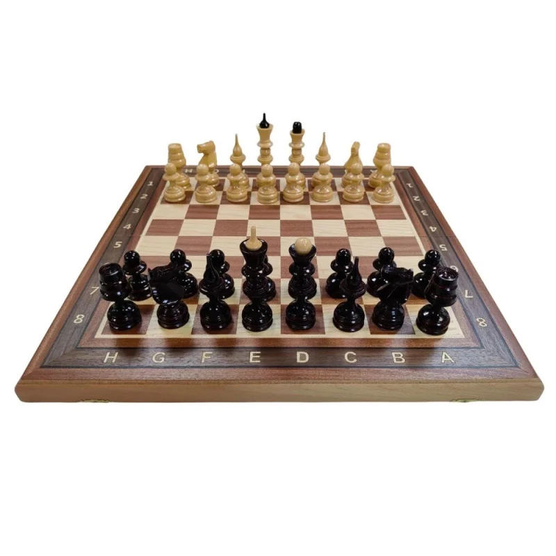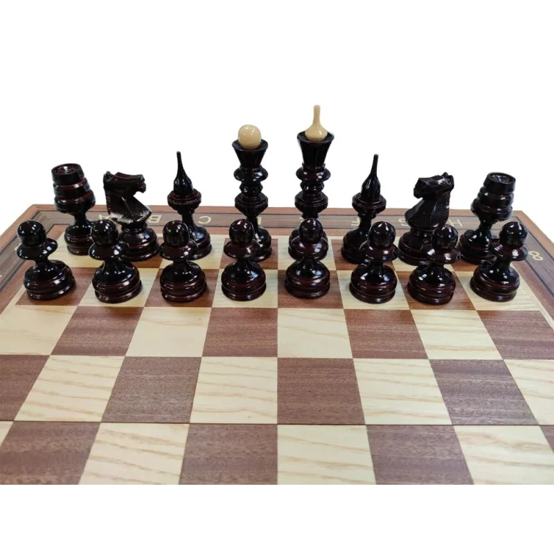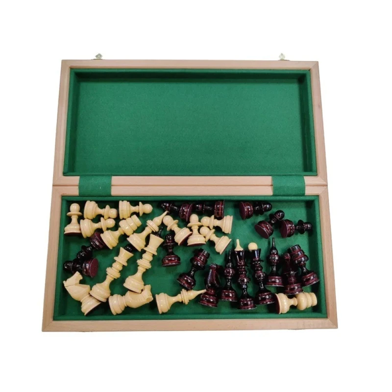 Размер доски в разложенном виде 50 на 50 см. Высота короля 12 см. Высота пешки 6 см. Фигуры с подклейкой, без утяжеления, но при этом достаточно устойчивые за счет широкого диаметра основания фигур. Внутри доска покрыта тканью. Доска закрывается на 2 замочка. Материал фигур липа, материал доски красное дерево, ясень, бук.
