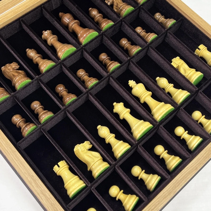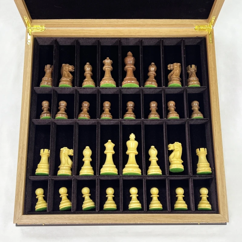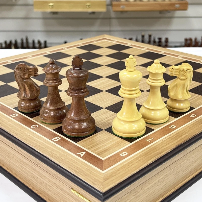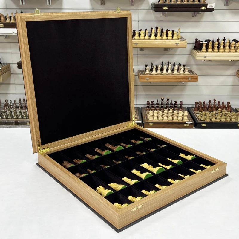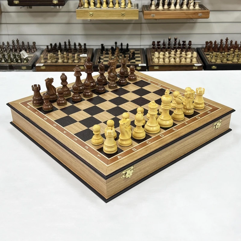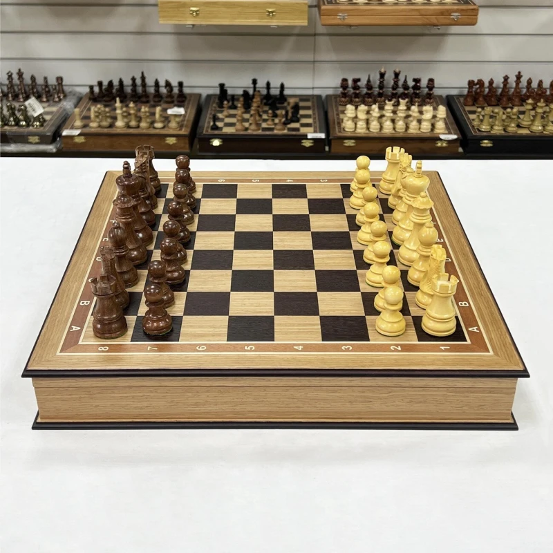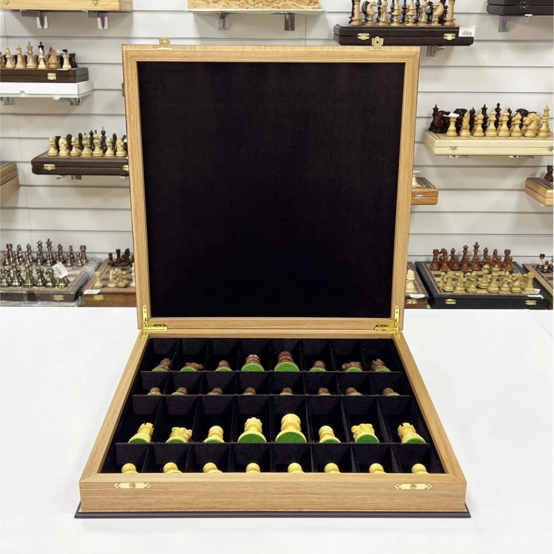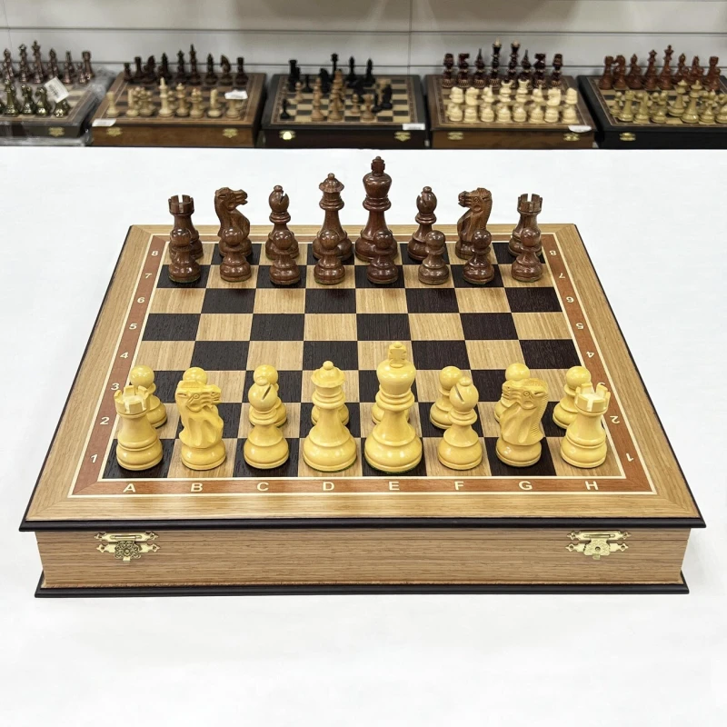 Размер доски 45 на 45 см. Внутри доски есть ячейки для хранения фигур. Форма шахматных фигур классический Стаунтон. Шахматное поле собирается в технике маркетри из дуба и венге. Размер клетки 4.5 см. Внутри ячейки покрыты бархатом. Шахматные фигуры с утяжелением и подклейкой зеленого цвета. Материал светлых фигур самшит, материал темных фигур палисандр. Купить шахматы в ларце, деревянные шахматы, подарочные шахматы, шахматы ручной работы можно в наших магазинах в Москве и в Санкт Петербурге. Получить более подробную информацию о шахматах, доп. видео и фото можно у наших менеджеров по телефону +7 (495) 662-99-14