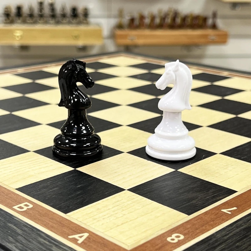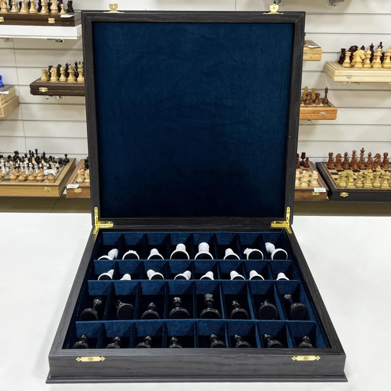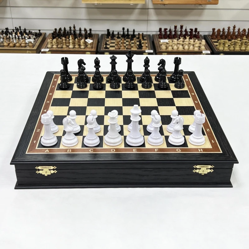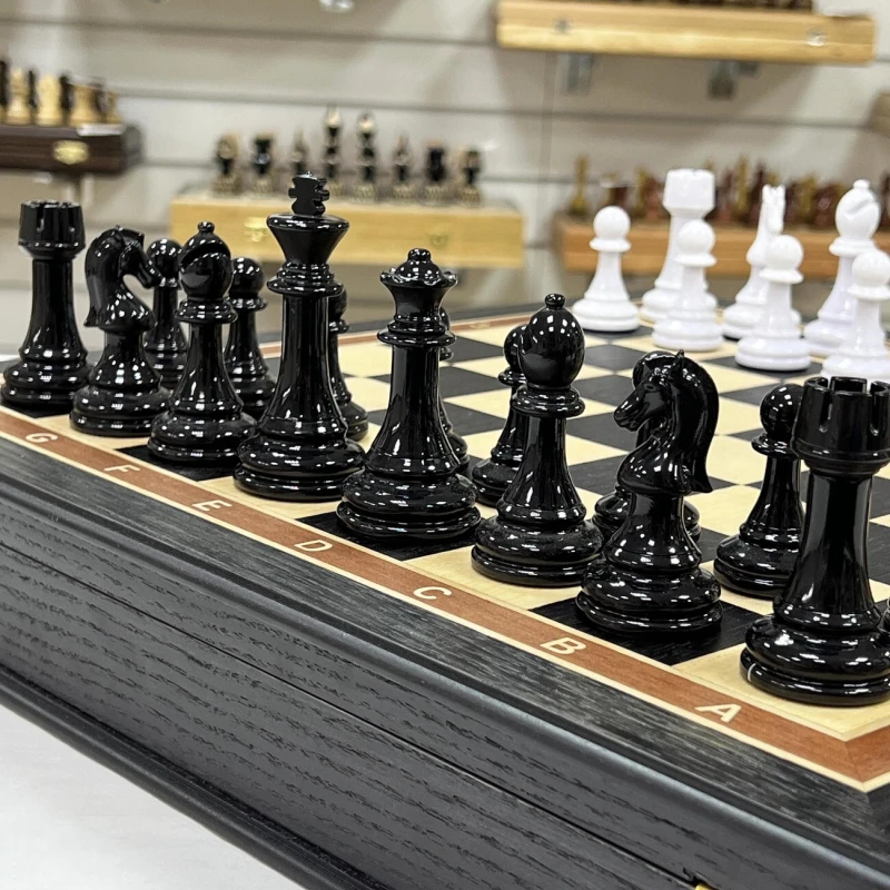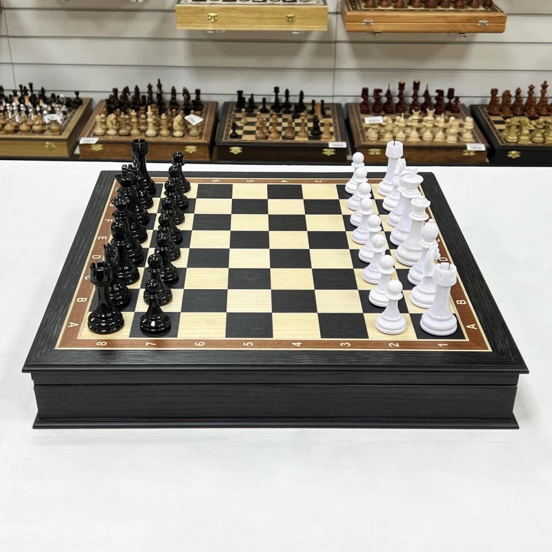Подарочные шахматы из моренного дуба, ясеня с утяжеленными фигурами в необычном стиле из композита. Форма фигур Стаунтон. Размер доски 45 на 45 см, размер клетки 4.5 см. Материал светлой клетки ясень, темной клетки моренный дуб.