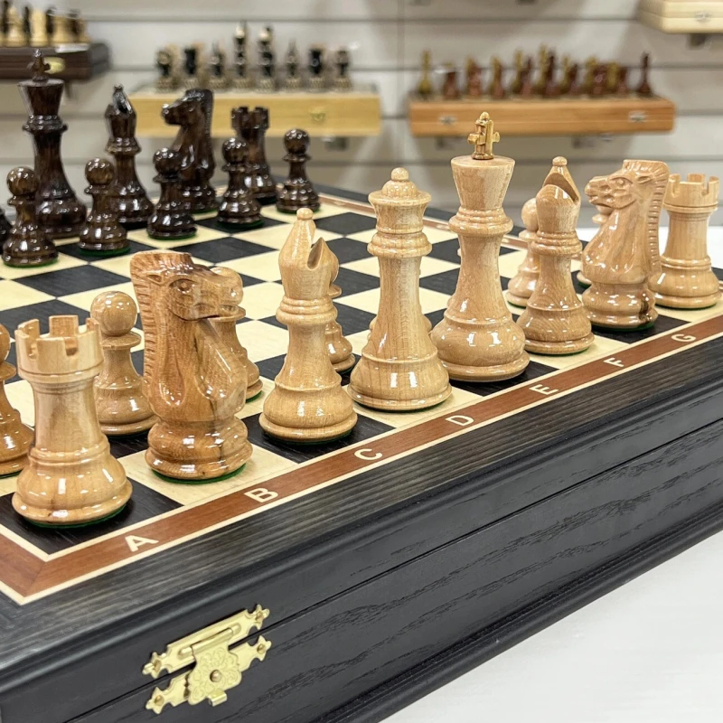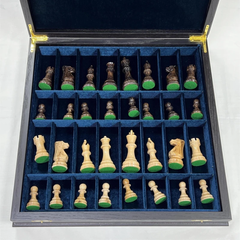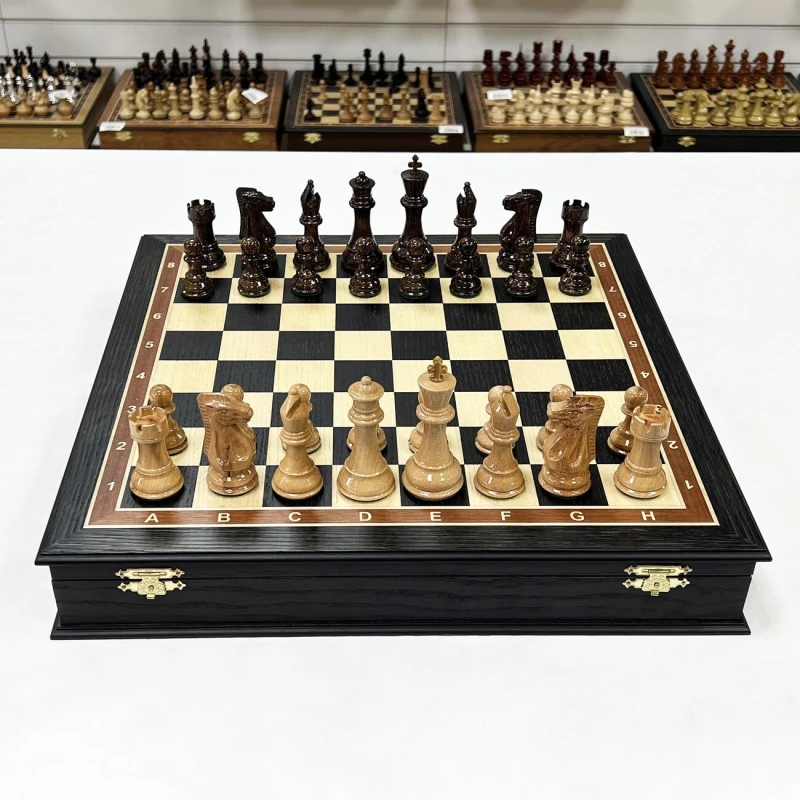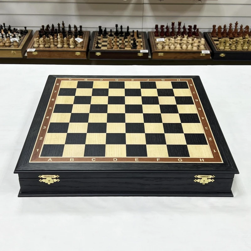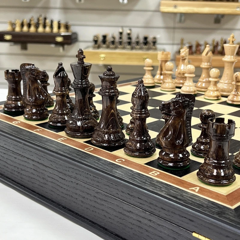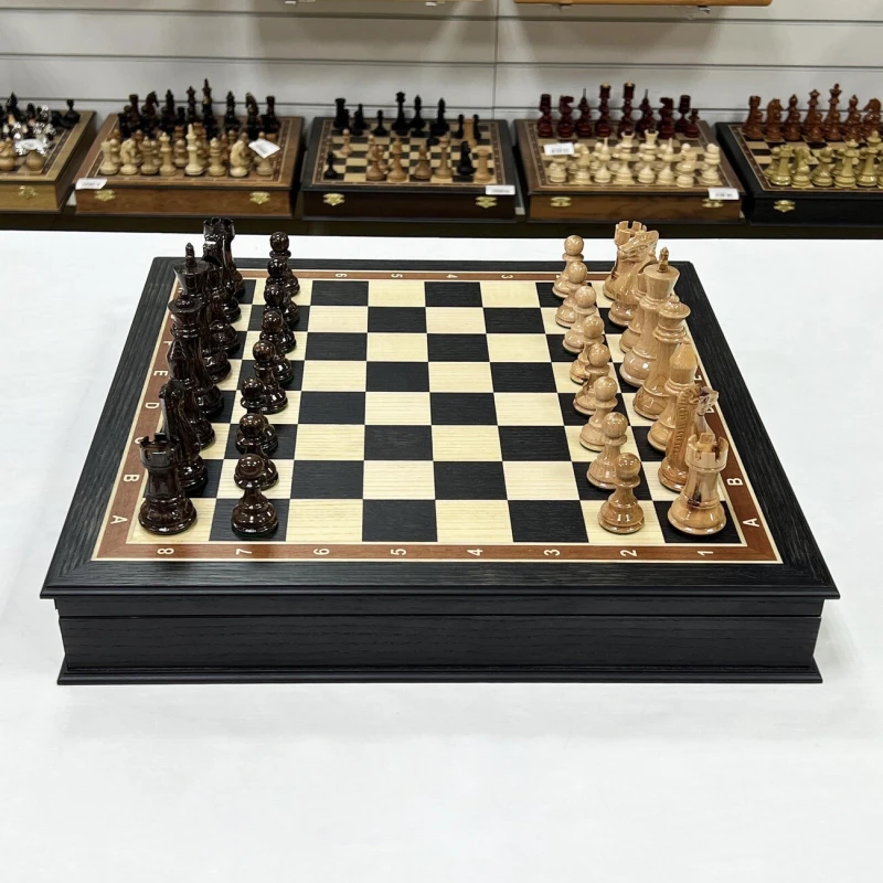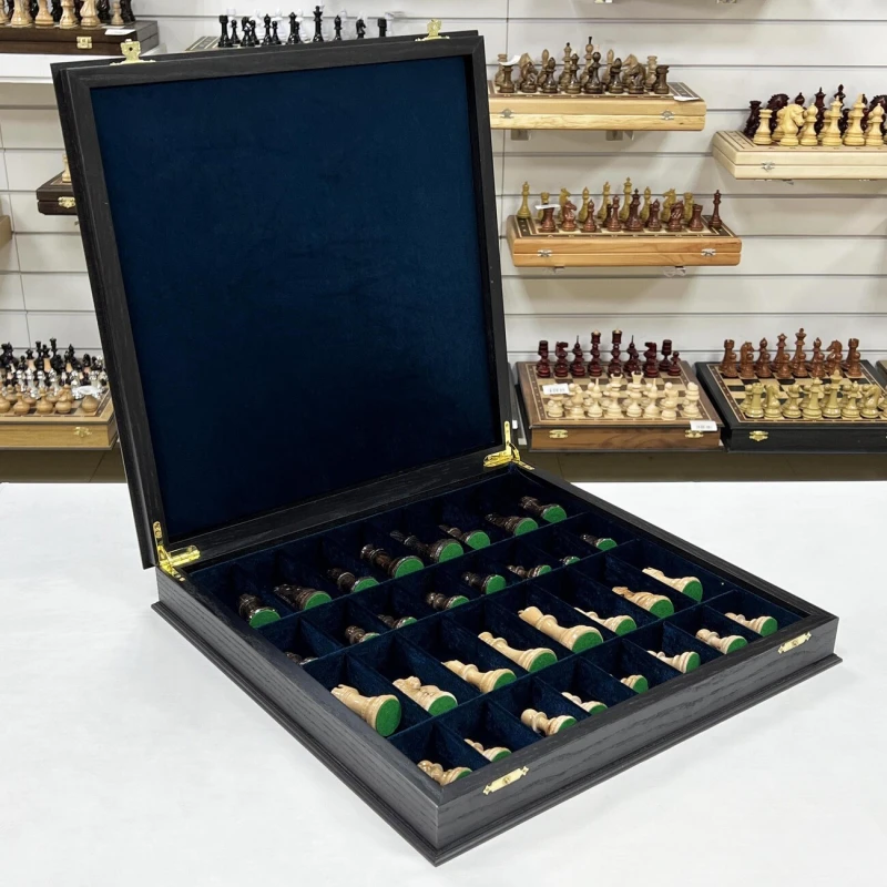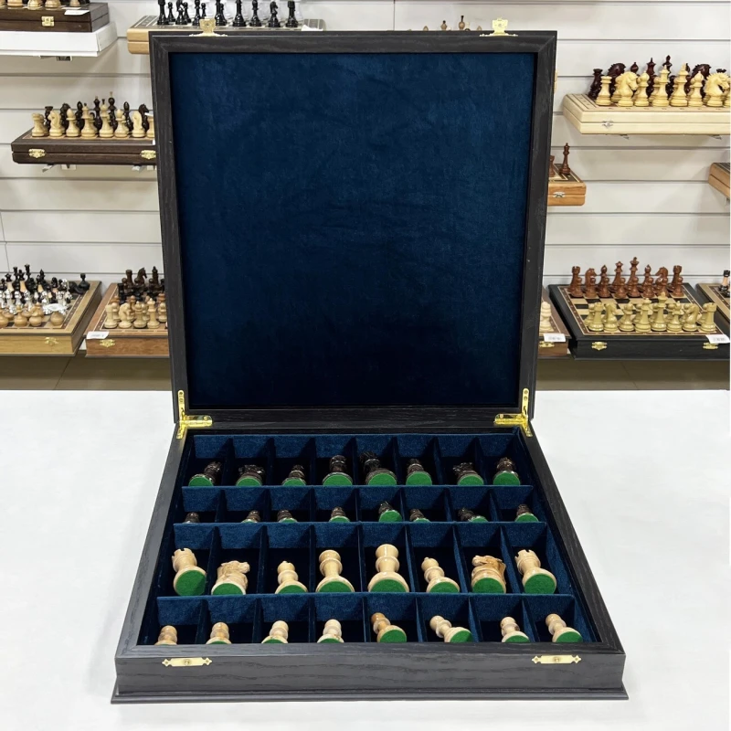 Шахматы турнирные в ларце венге с утяжеленными фигурами Стаунтон из дуба. Ларец имеет размеры 45х45 см, размер клеток 4.5х4.5 см. Внутри ларца имеются специальные ячейки для безопасного хранения фигур Высота Короля - 10 см Высота пешки - 5 см Материал доски - Мореный дуб Материал фигур - дуб\клен