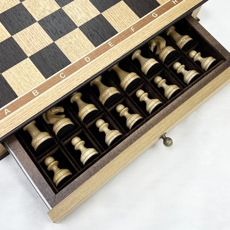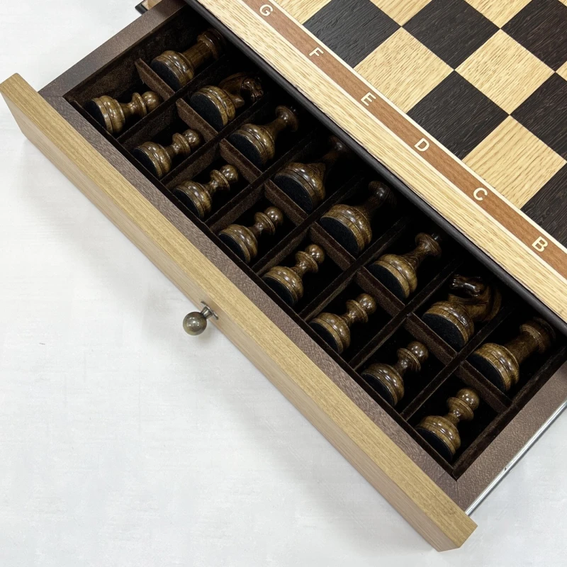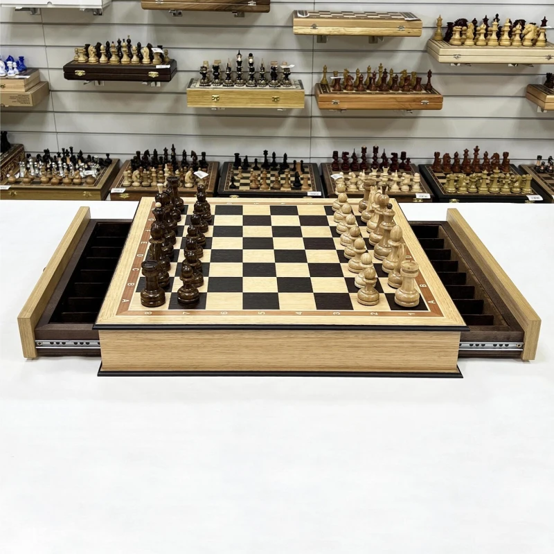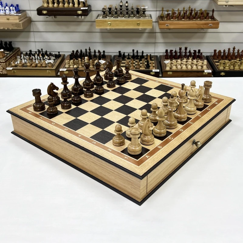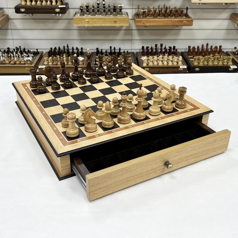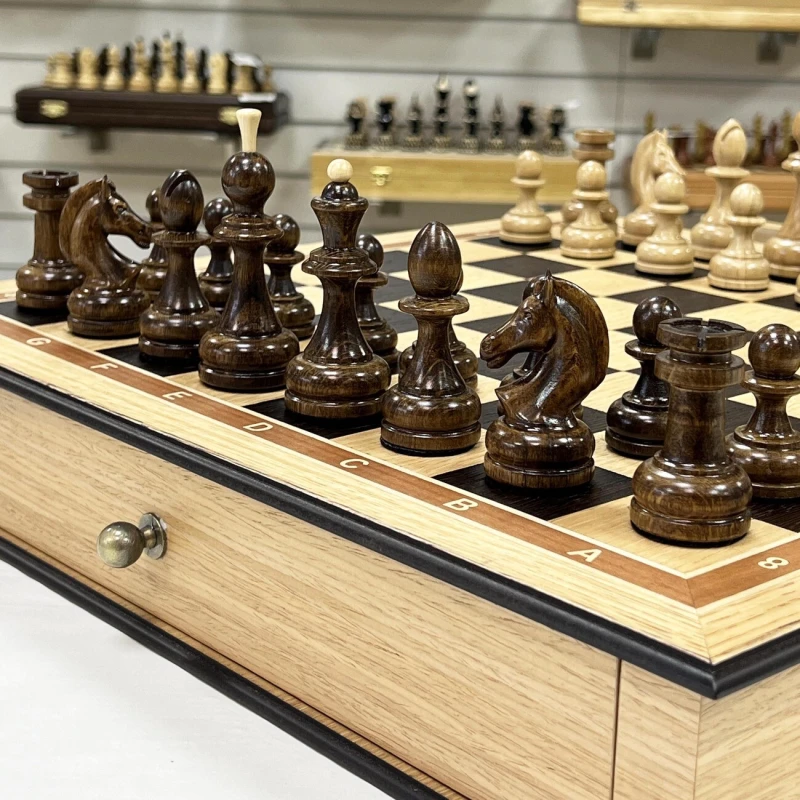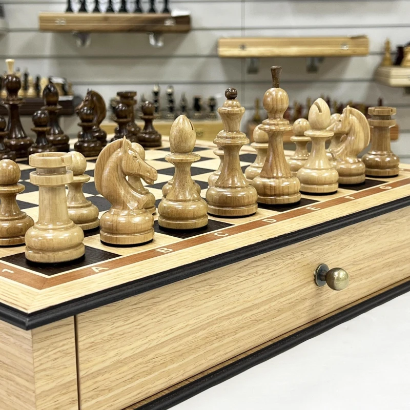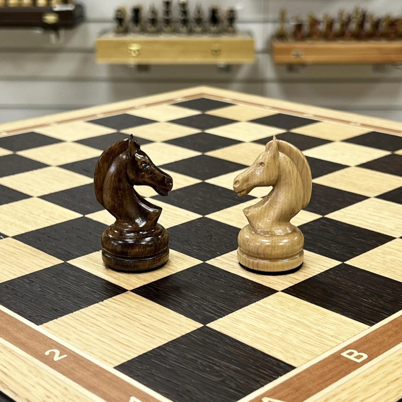 Шахматы с утяжелением. Высота короля 10 см, высота пешки 5 см. Размер доски 48 на 48 см, размер клетки 5 на 5 см. Внутри выдвигающихся ящиков есть ячейки для хранения фигур. Шахматное поле собирается вручную из дуба и венге в технике марткетри. Подойдут в подарок для детей и взрослых. Рекомендуем обратить внимание на красивых объемных коней.