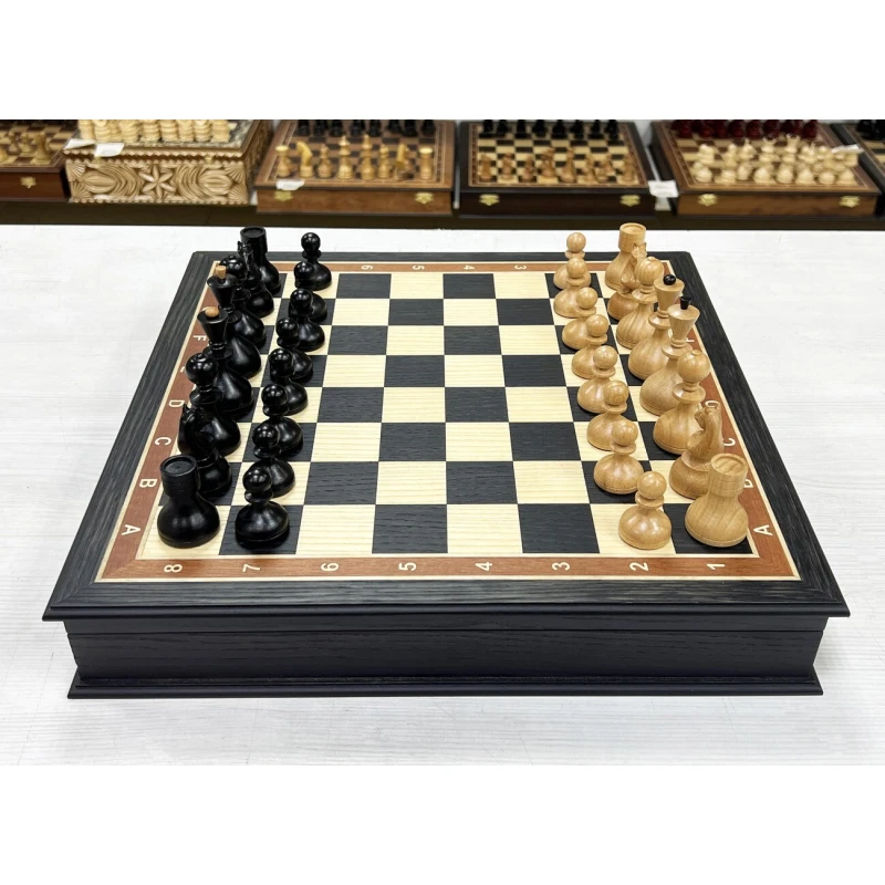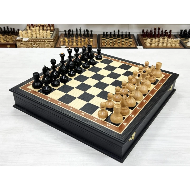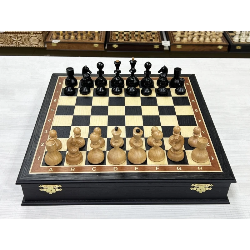 Шахматы в ларце из мореного дуба с утяжеленными фигурами из бука. Форма фигур советской эпохи 60-х годов. Шахматные фигуры с утяжелением для повышенной устойчивости. Размер доски 40 на 40 см.