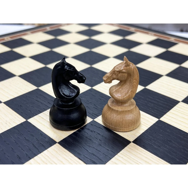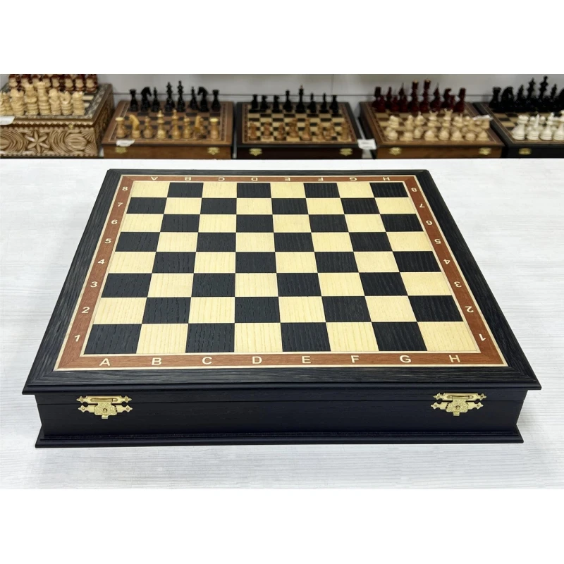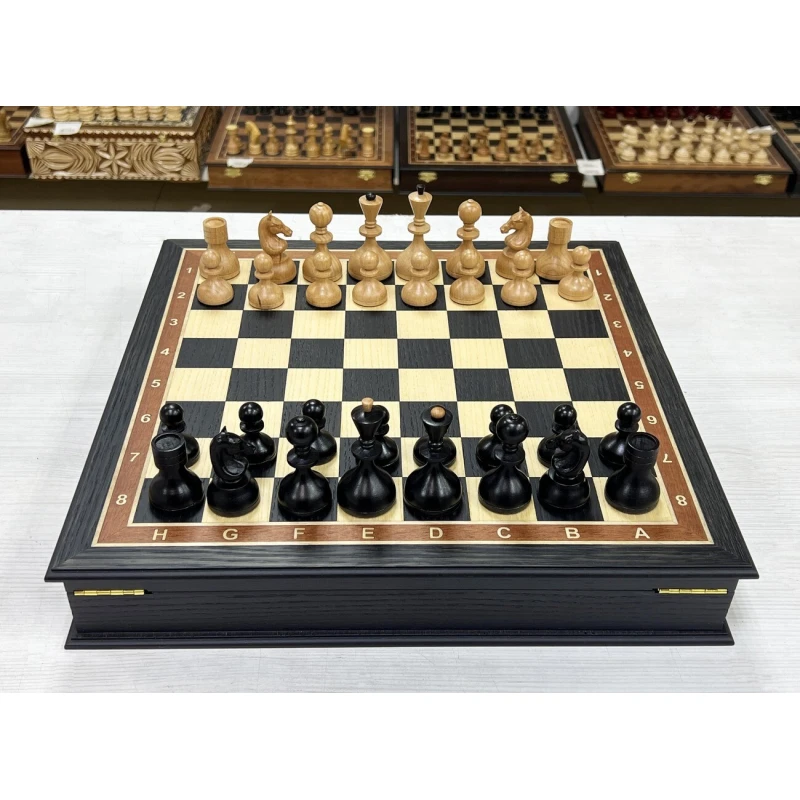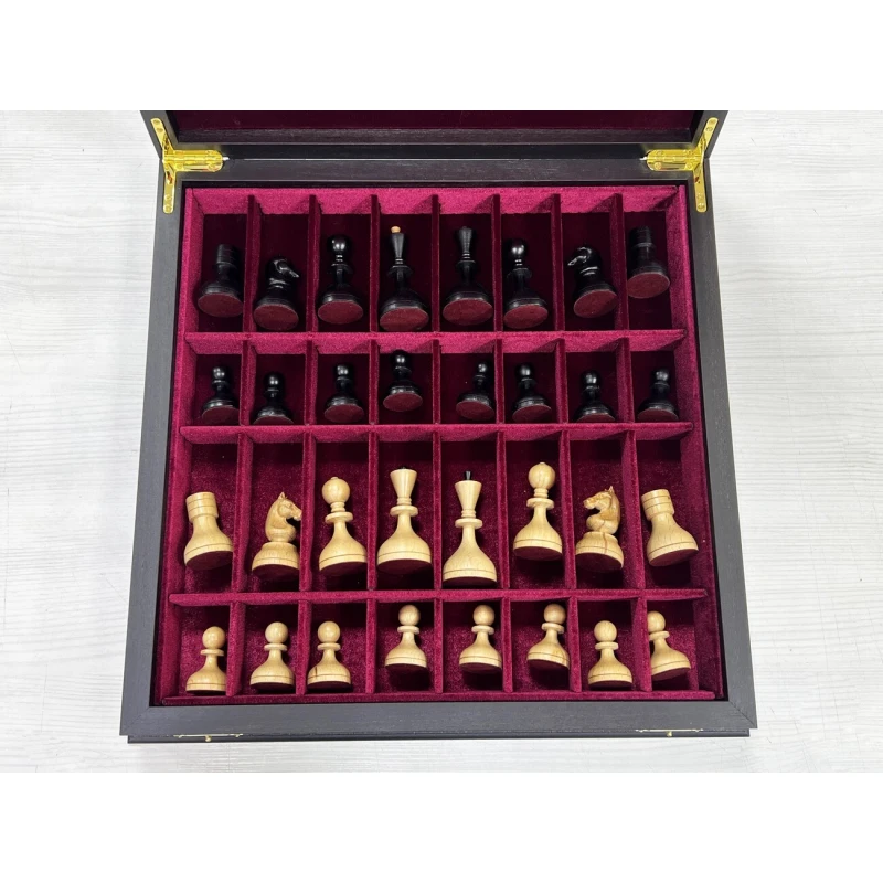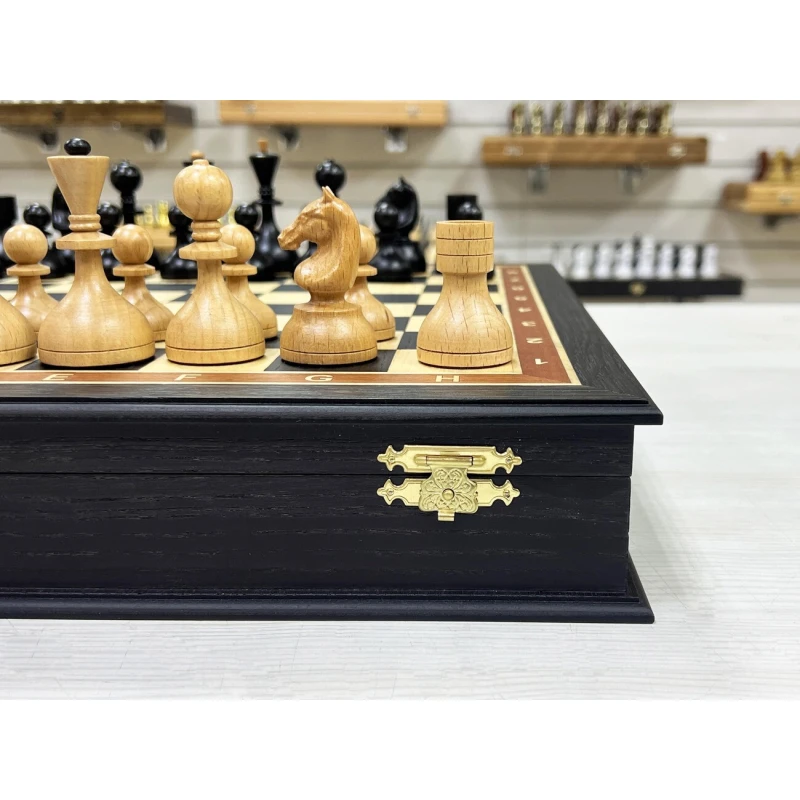 Внутри доски есть индивидуальные ячейки для хранения каждой фигуры. Шахматное поле собирается вручную в технике маркетри.