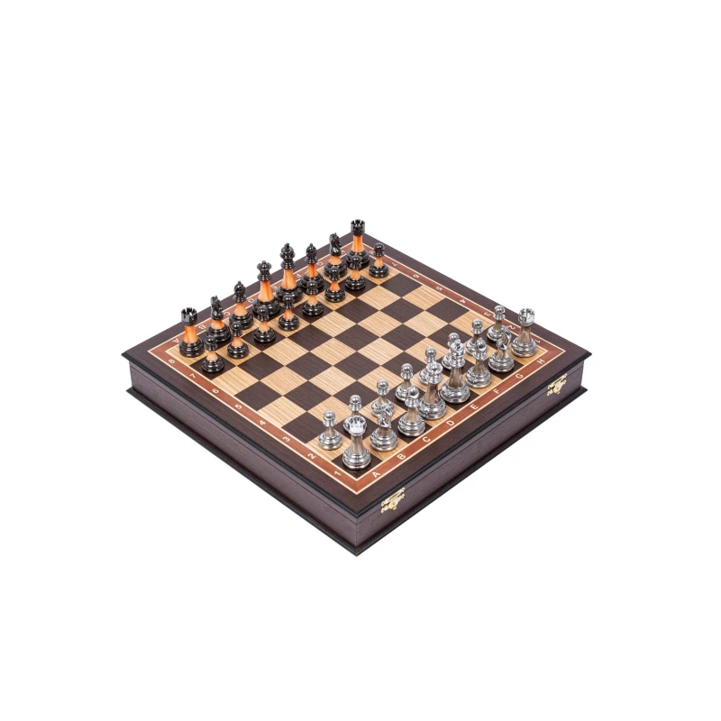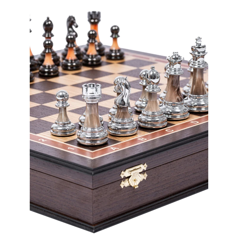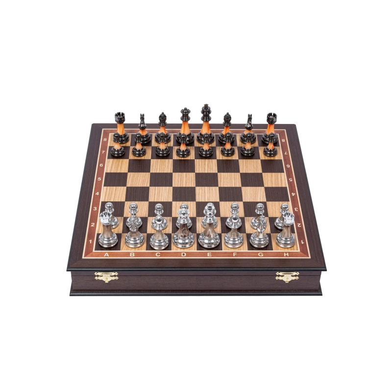 Большие стационарные шахматы в классическом стиле Стаунтон. Шахматная доска ларец сделана в ручную из ценных пород дерева. Темная часть доски сделана из венге, светлая часть сделана из дуба. Размер клетки 4.5 на 4.5 см. Размер доски 45 на 45 см. Материал фигур композит. Шахматные фигуры с утяжелением. Дизайн фигур Стаунтон, но со своей изюменкой. Фигуры состоят из 3 частей, что придает особого визаульного и тактильного ощущения при игре. Внутри доски есть бархатные ячейки для бережного хранения фигур. Шахматное поле собирается вручную в технике маркетри. Упакованы в транспортировочную коробку. Шахматная доска сделана в России, шахматные фигуры сделаны в Китае. Снизу фигур есть подклейка.