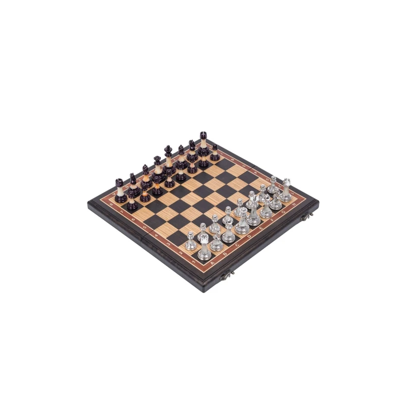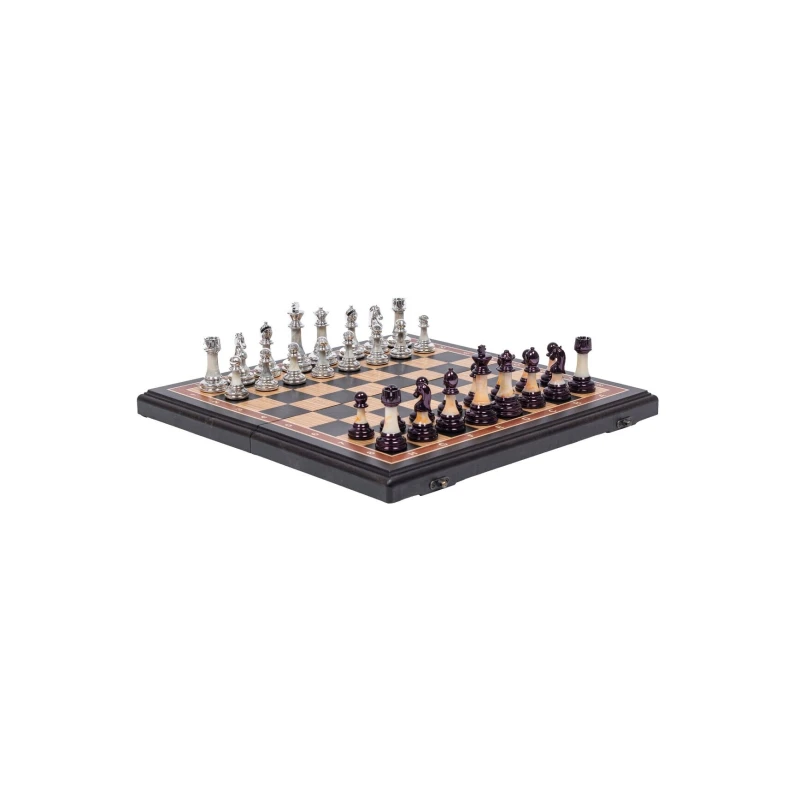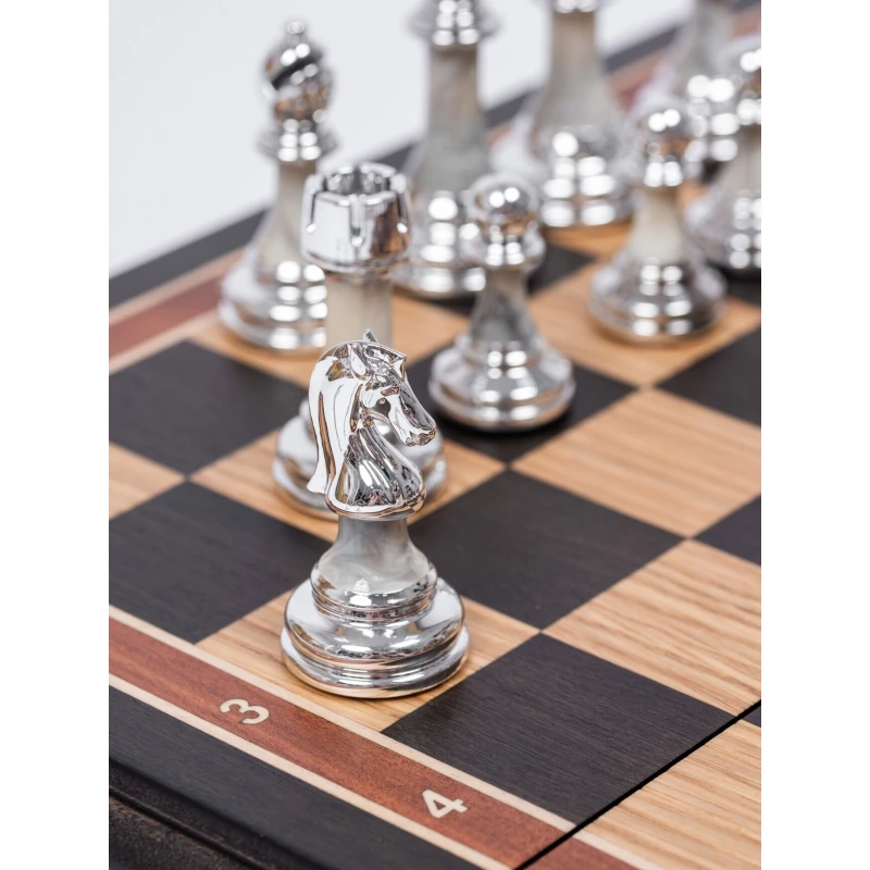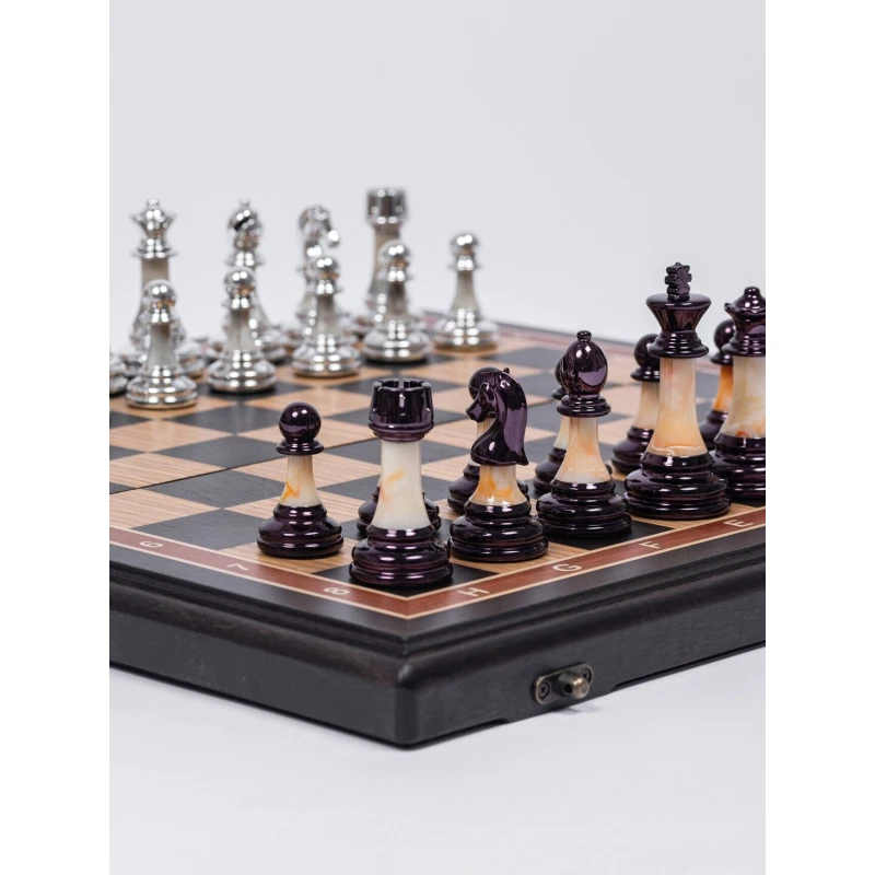 Подарочные шахматы с утяжеленными фигурами в необычном стиле схожим с классическим Стаунтон, но при этом имеют уникальные особенности ввиде декоративных вставок. Шахматное поле собирается вручную в технике маркетри. Размер доски в разложенном виде 45 на 45 см. Фигуры очень устойчивы на доске за счет утяжеления. Размер клетки 4.5 на 4.5 см. Внутри доска покрыта бархатом с защитой петель, что бы не царапать стол. Подойдут в подарок для детей и взрослых, шахматы можно выбрать у нас в магазине в живую и оценить качество исполнения ручной работы.