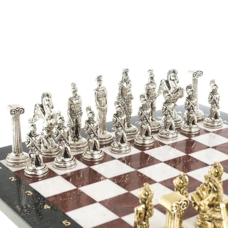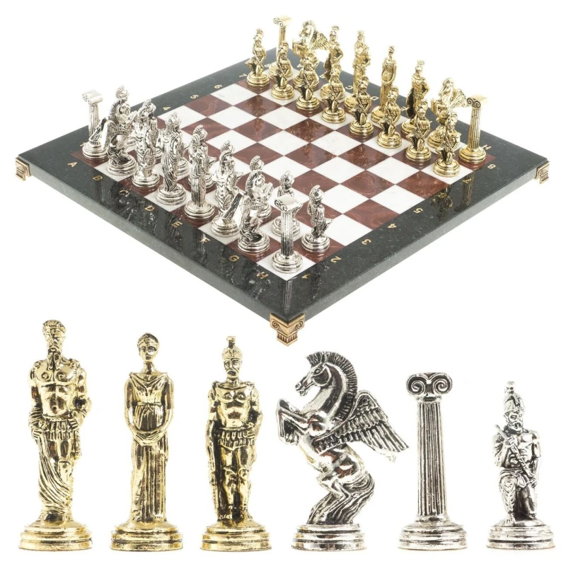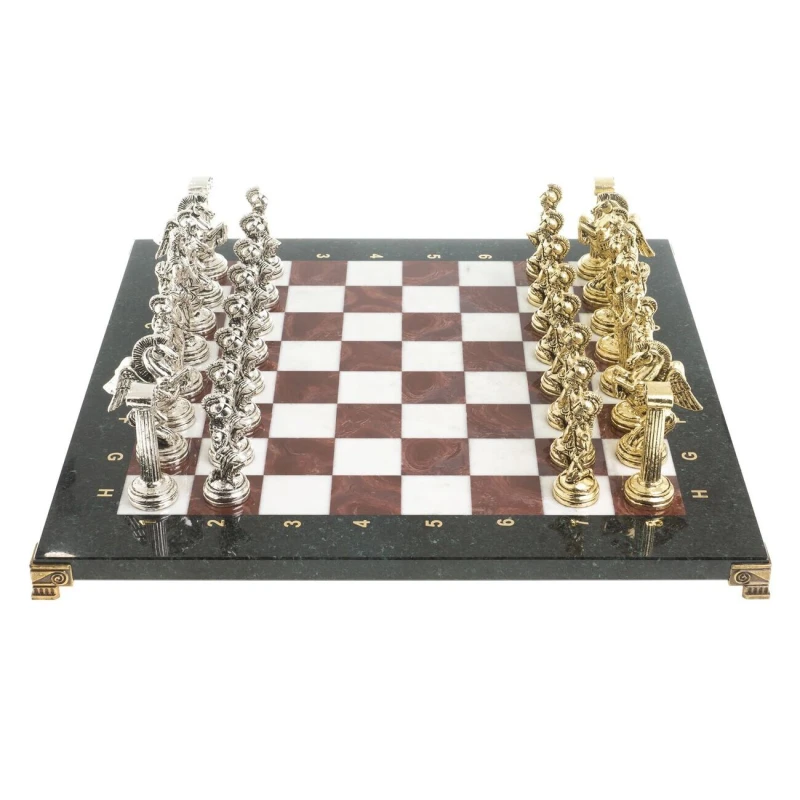 Размер доски 40 на 40 см. Высота короля 9.5 см, высота пешки 7 см. Материал светлой клетки мрамор, материал темной клетки лемезит, материал оконтовки змеевик. Шахматы упакованы в транспортировочный чемодан. Размер клетки 4 на 4 см. Шахматы подойдут в подарок для взрослых и детей. Шахматные фигуры с подклейкой, что бы не царапать доску.