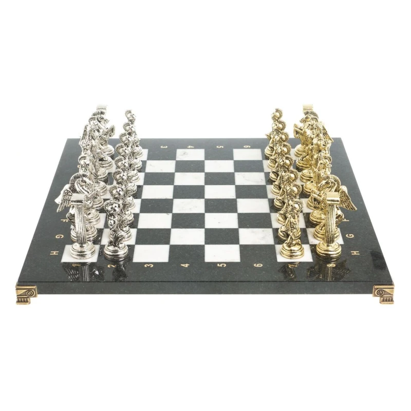 Большие шахматы с металлическими фигурами на каменной доске. Размер доски 40 на 40 см, упакованы шахматы в чемодан. Материал доски мрамор, змеевик. Темная клетка змеевки, светлая клетка мрамор. Сделаны в России. Шахматная доска нескладная. Структура камня имеет уникальный рисунок и оттенок. Шахматы очень тяжелые, это нужно учитывать. Подойдут в подарок для взрослых и детей.