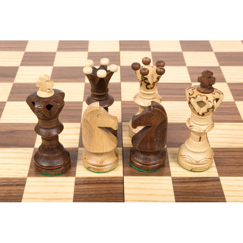 Шахматные фигуры серии «Престиж» сделаны в Польше. Исполнение данных фигур крайне нестандартное и богатое на дополнительные элементы: корона на фигуре «Ферзь», различные выжженные элементы, контрастный крест у фигуры «Король».