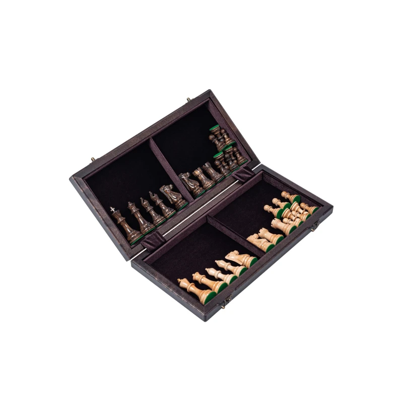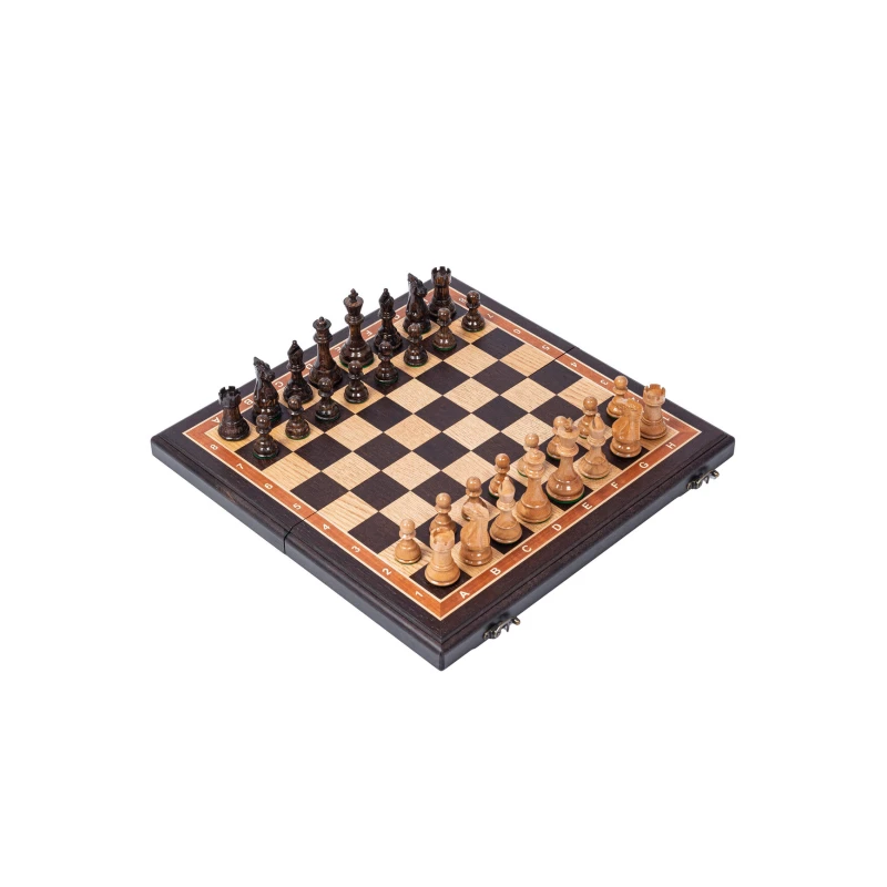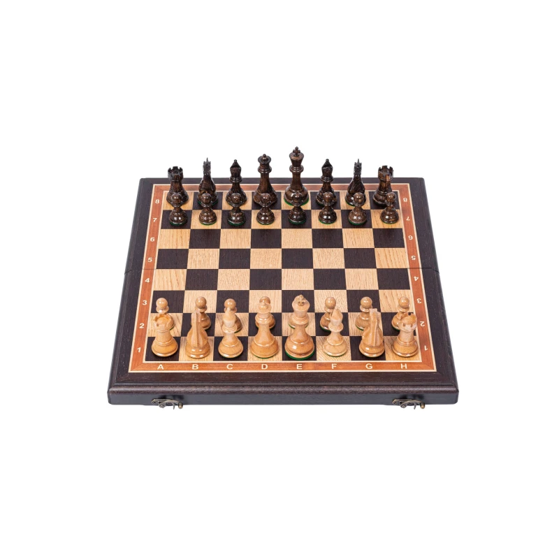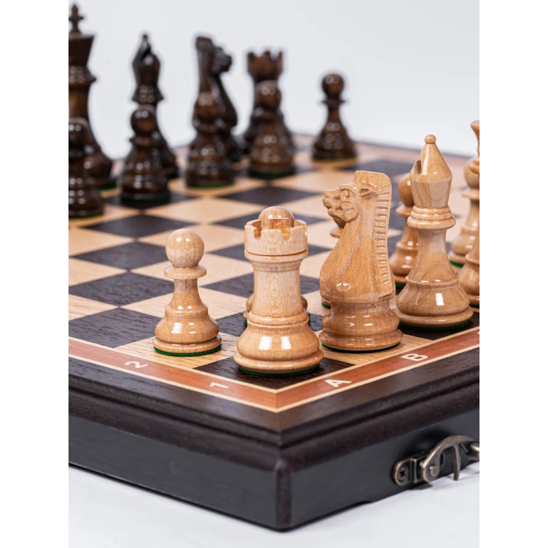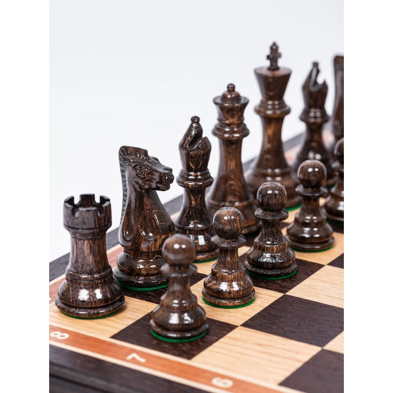 Красивые подарочные шахматы из ценных пород дерева. Материал светлых фигур клен, материал темных фигур дуб. Размер доски 45 на 45 см в разложенном виде. Высота короля 10 см, высота пешки 5 см. Шахматные фигуры с утяжелением. Материал доски венге темная клетка, дуб светлая клетка. Шахматное поле собирается вручную в технике маркетри. Размер клетки 4.5 на 4.5 см. Шахматные фигуры в стиле Стаунтон покрыты глянцевым лаком.
