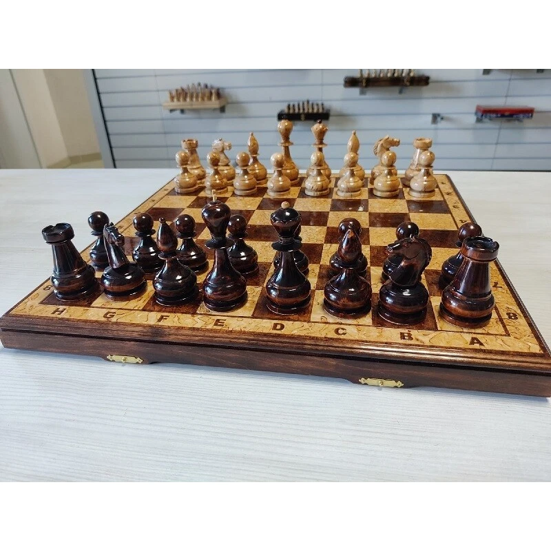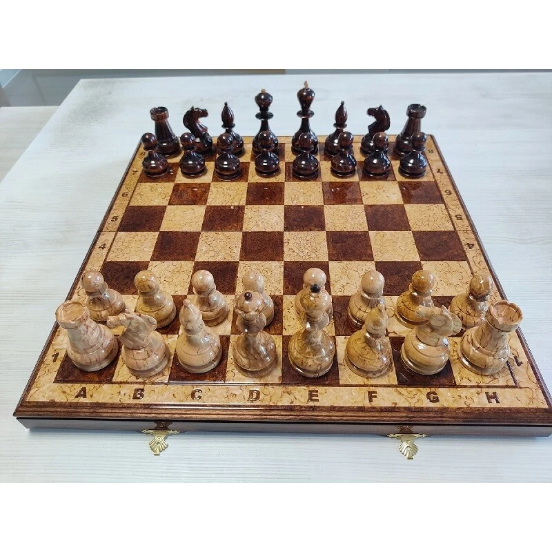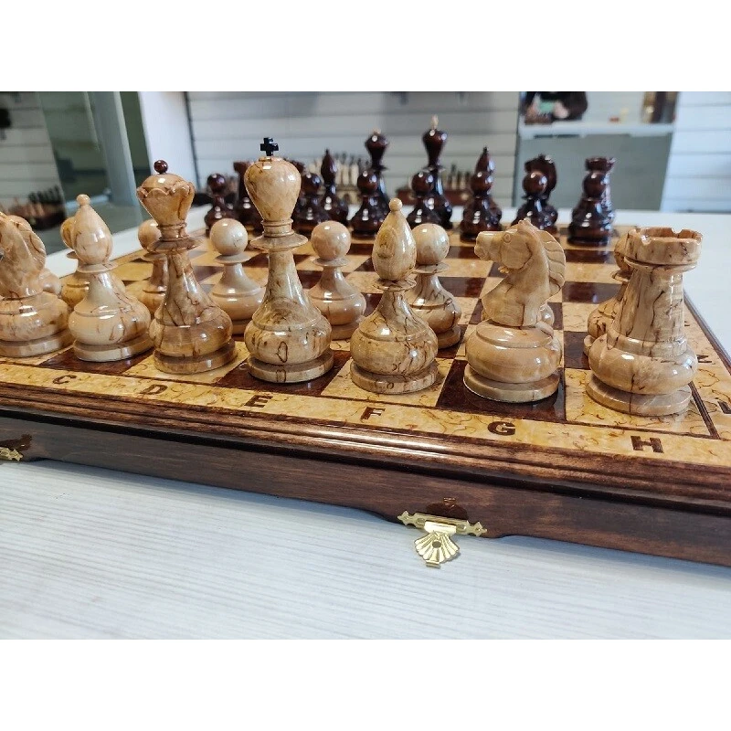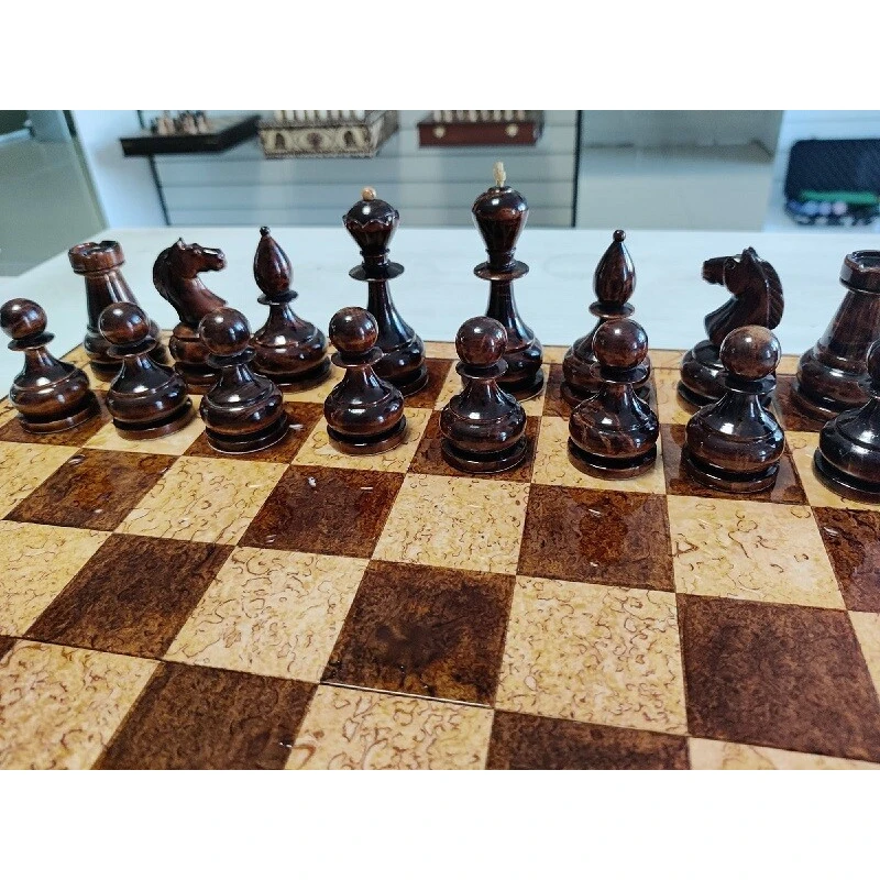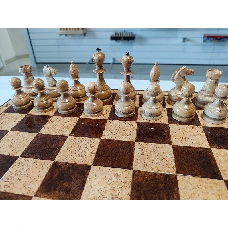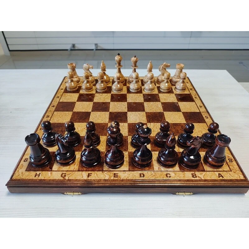 Эксклюзивные шахматы ручной работы из карельской березы. Доска и фигуры покрыты рояльным лаком. Размер доски 45 на 45 см. Производство Росси. Мастерская IVAN ROMANOV.