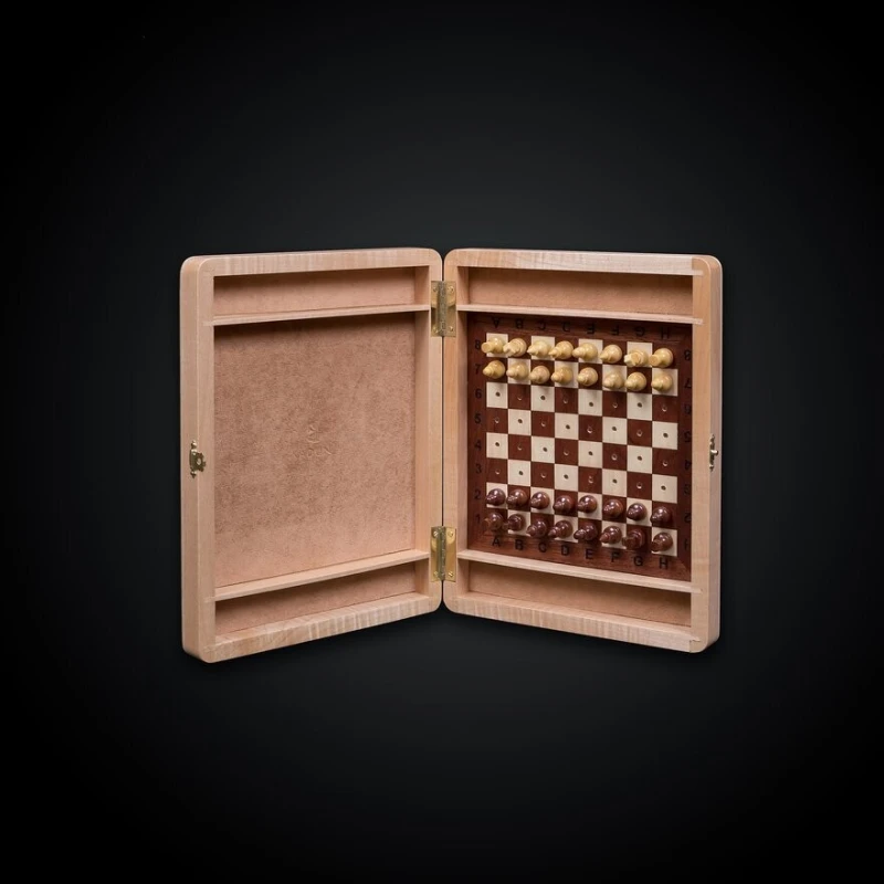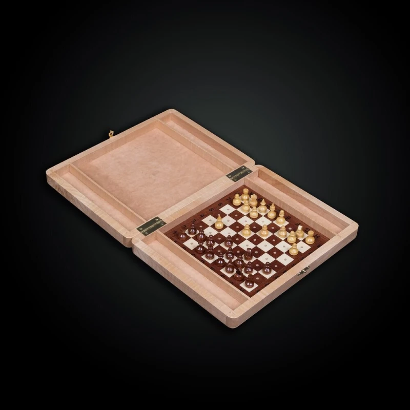 - Корпус:Массив бук, конструкция складной доски на петлях и замочках, фигурки крепятся непосредственно на шахматном поле.