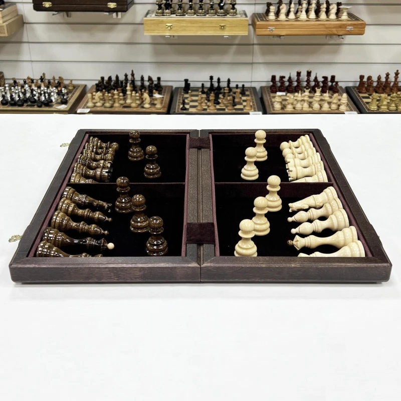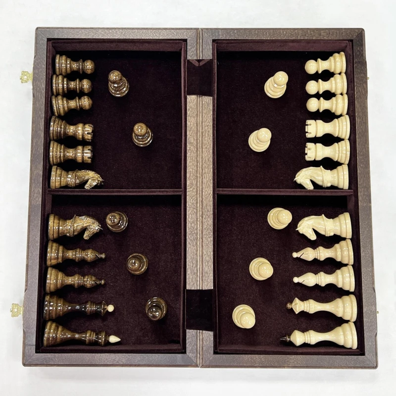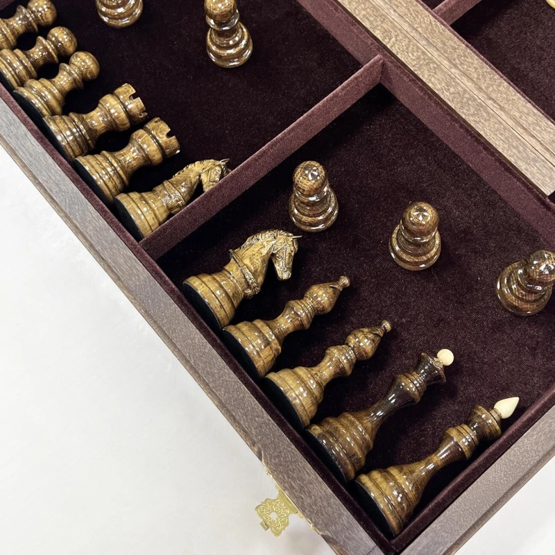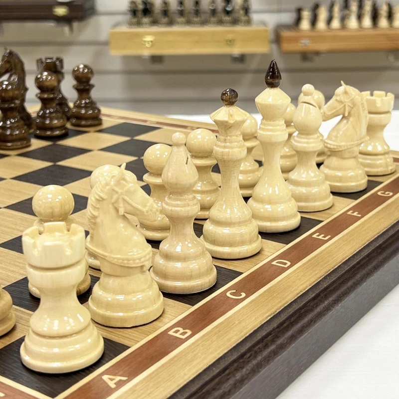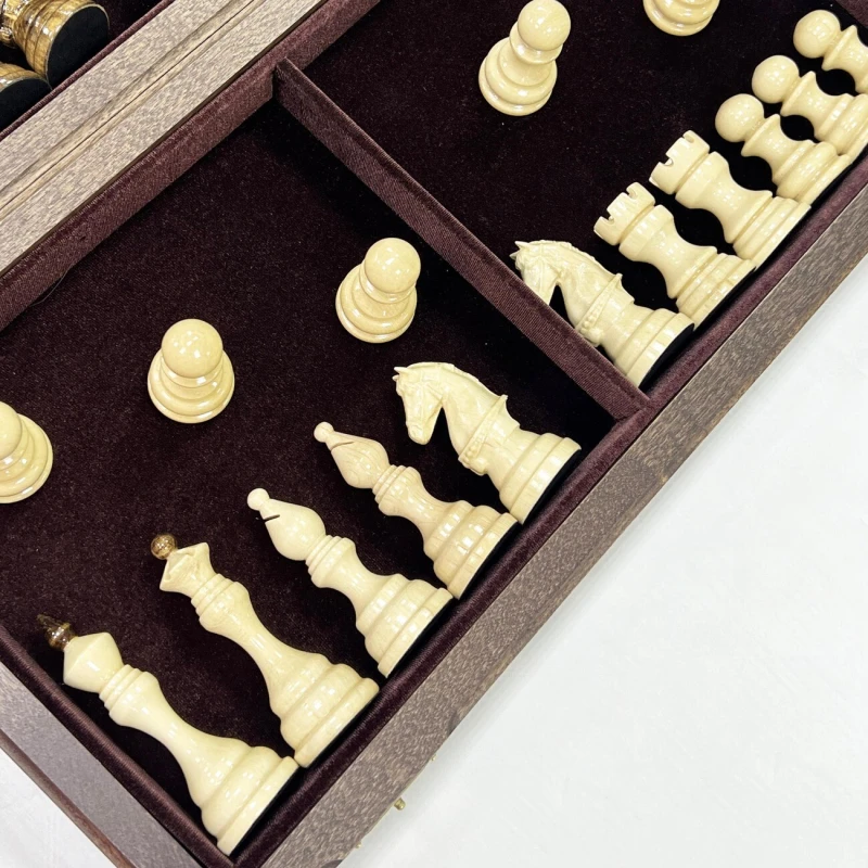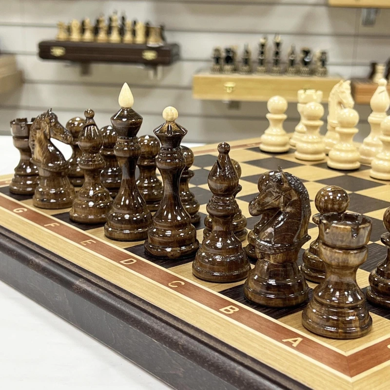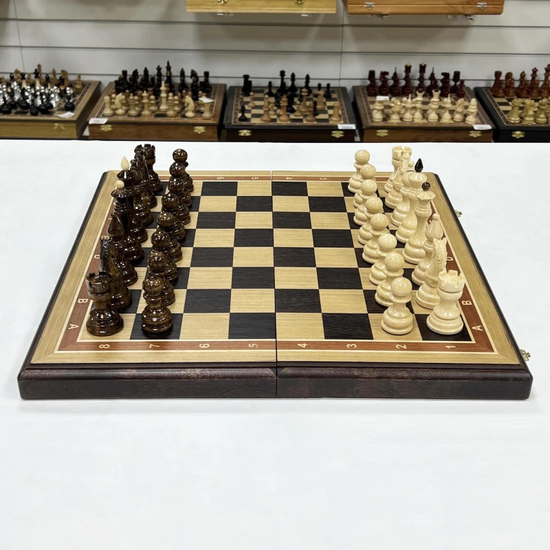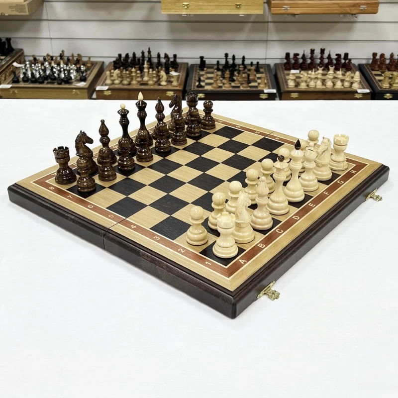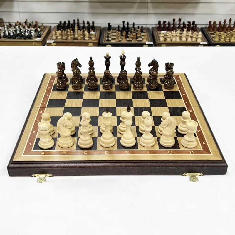 Шахматы ручной работы из ценных пород дерева. Доска размером 45 на 45 см сделана из дуба, черного дерева и березы. Фигуры сделаны из граба. Каждая фигуры с утяжелением и подклейкой. Доска закрывается на 2 замочка. Внутри доска покрыта бархатом для бережного хранения фигур. Высота короля 9.5 см, высота пешки 5 см.