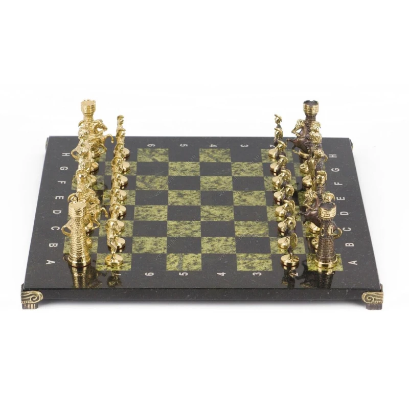 Доска из змеевика, фигуры из бронзы. Размер: доска 400х400х30 мм, клетка 40х40 мм, высота фигур 56-90 мм.