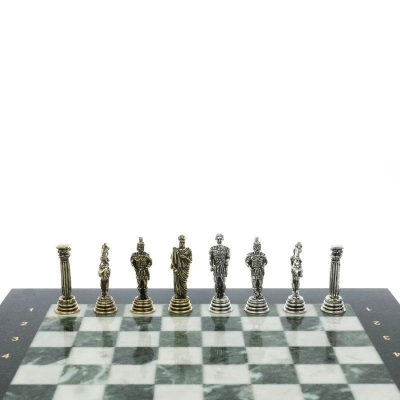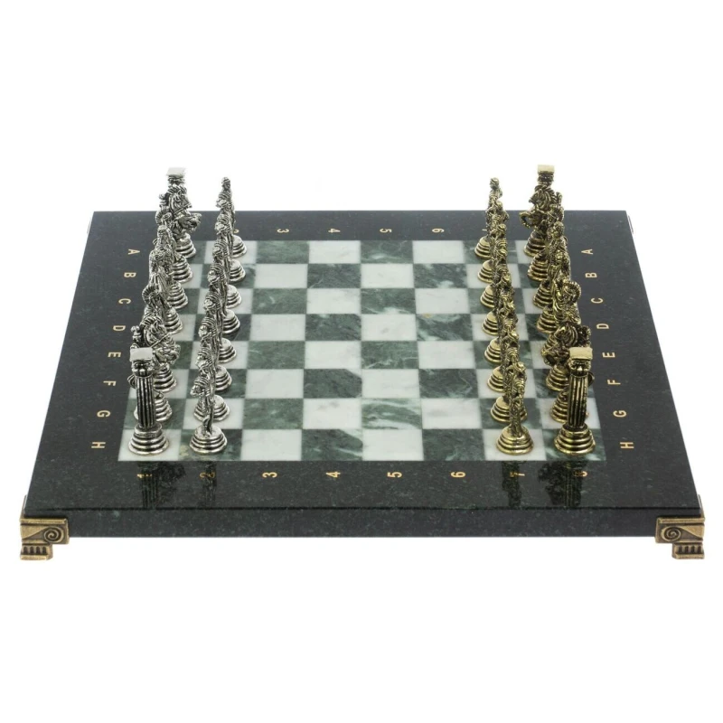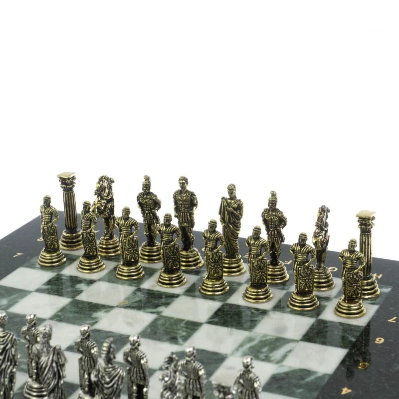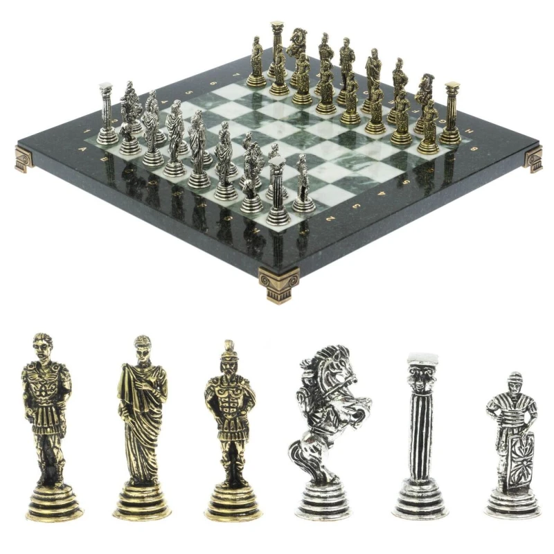 Набор для игры в шахматы "Римские лучники" изготовлен вручную, доска из натурального камня, фигуры из металла в цвете золото и серебро.