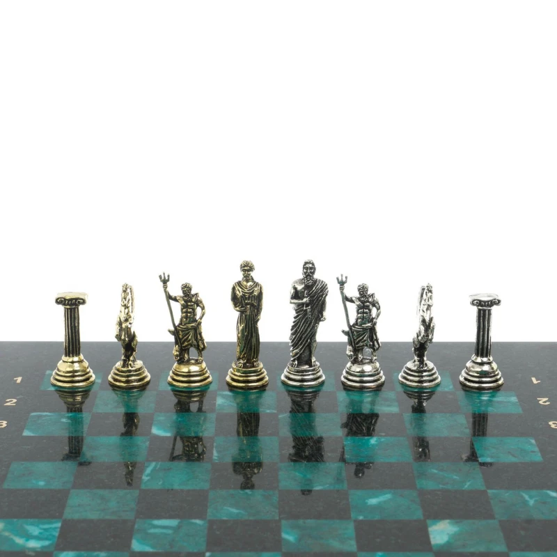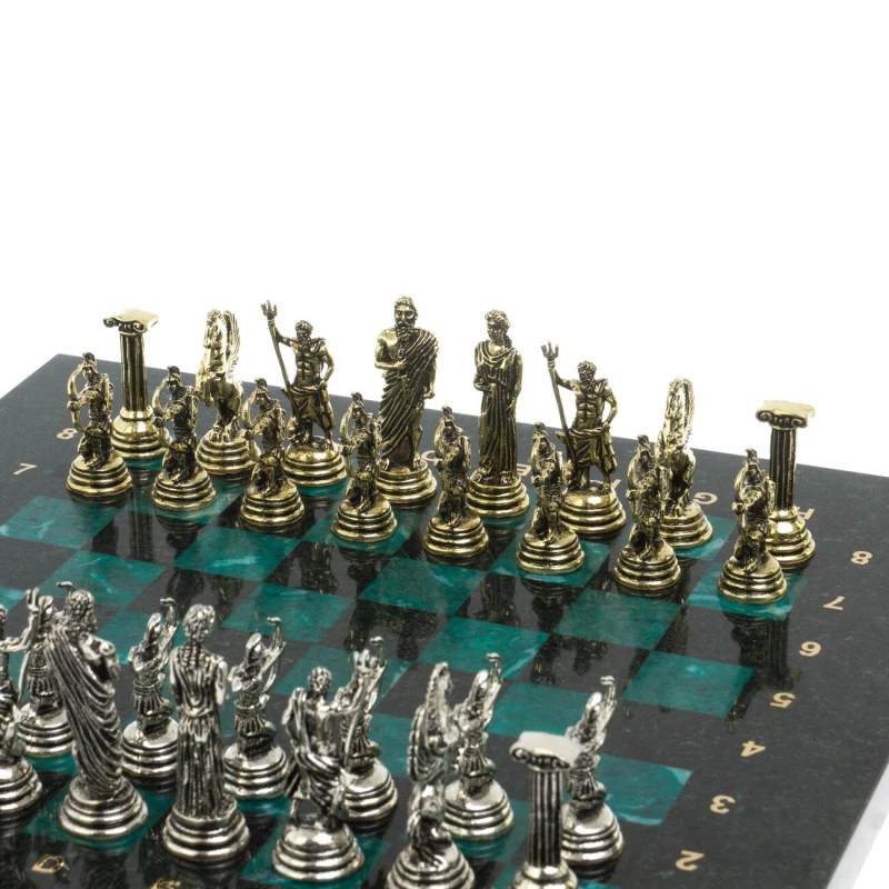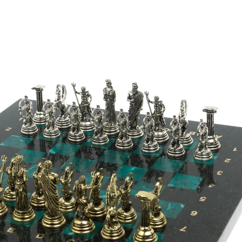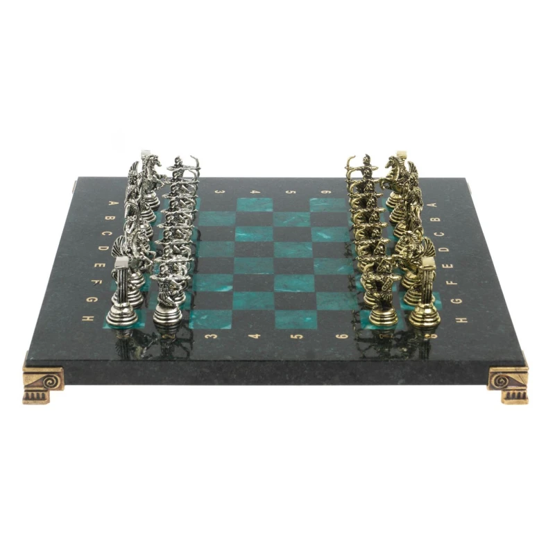 Набор для игры в шахматы "Римские лучники" изготовлен вручную, доска из натурального камня, фигуры из металла в цвете золото и серебро.