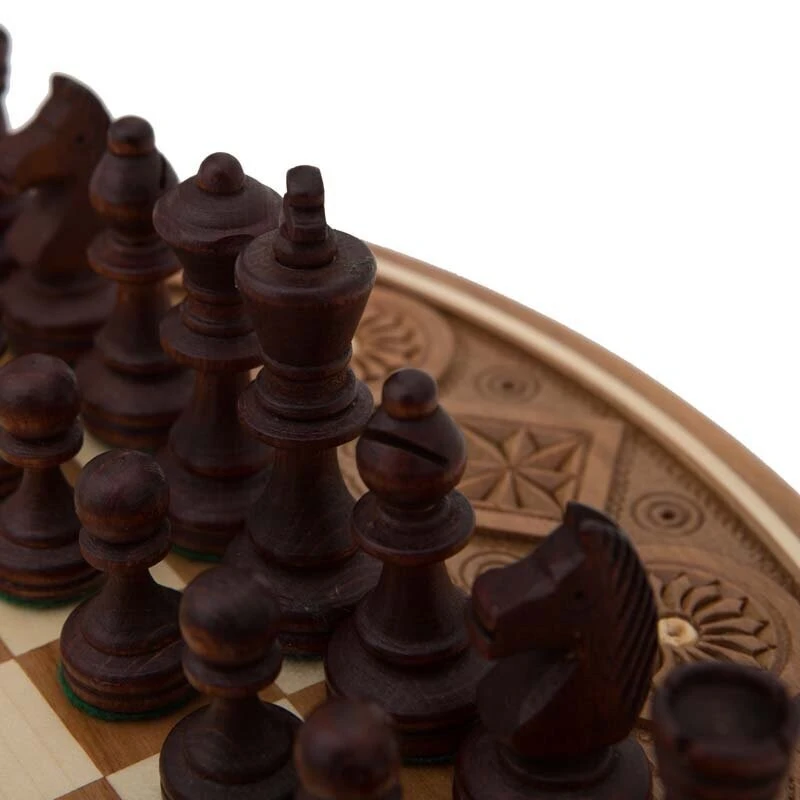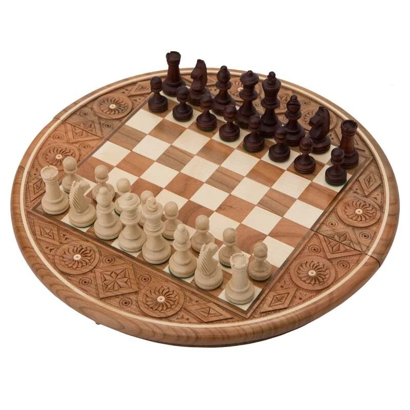 Шахматы по праву могут носить звание древнейшей настольной игры. Они и по сей день не утратили своей актуальности – по всему миру количество игроков исчисляется миллионами, а чемпионаты проводятся повсеместно. Этому способствует продуманность игрового процесса, хотя ученые так и не выяснили имя того, кто изобрел это уникальное развлечение. Известно лишь то, что они появились в индии, еще до нашей эры. Сначала они представляли собой «игрушку» для самых богатых людей, которые хотели коротать время с интересом. Они решали с помощью шахмат различные споры, а есть легенда, что удалось избежать войны между правителями, так как сражение было перенесено на доску. Можно ли быстро сыграть в шахматы Конечно, можно. Для этого достаточно лишь установить на 1 ход, например – 1 минуту. Если противник не успел подумать и передвинуть фигурку, то он просто пропускает ход. Таким образом можно сократить продолжительность одной партии до 1 часа, а может и меньше. В этом случае приходится проявлять не только «чудеса мысли», но и реакцию, ведь за короткий промежуток необходимо просчитать варианты и возможные передвижения, учитывая, что и соперник не дремлет. Что-то тут не так Вы наверняка заметили, что это не классическая квадратная доска, к коим мы привыкли, а круглая. Это не оказывает никакого влияния на сам процесс, однако внешний вид становиться намного лучше. Поле, на котором происходит сражение, стандартное, с контрастными клетками, а вот вокруг него расположились многочисленные геометрические узоры. Это не просто рисунок, а резьба, выполненная опытными руками, поэтому она и получилась настолько красивой. Кстати, как и полагается, тут всё изготовлено из прочной древесины.
