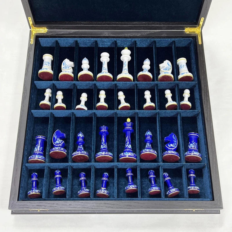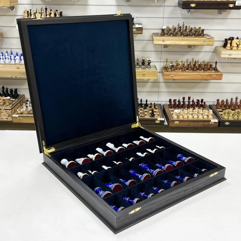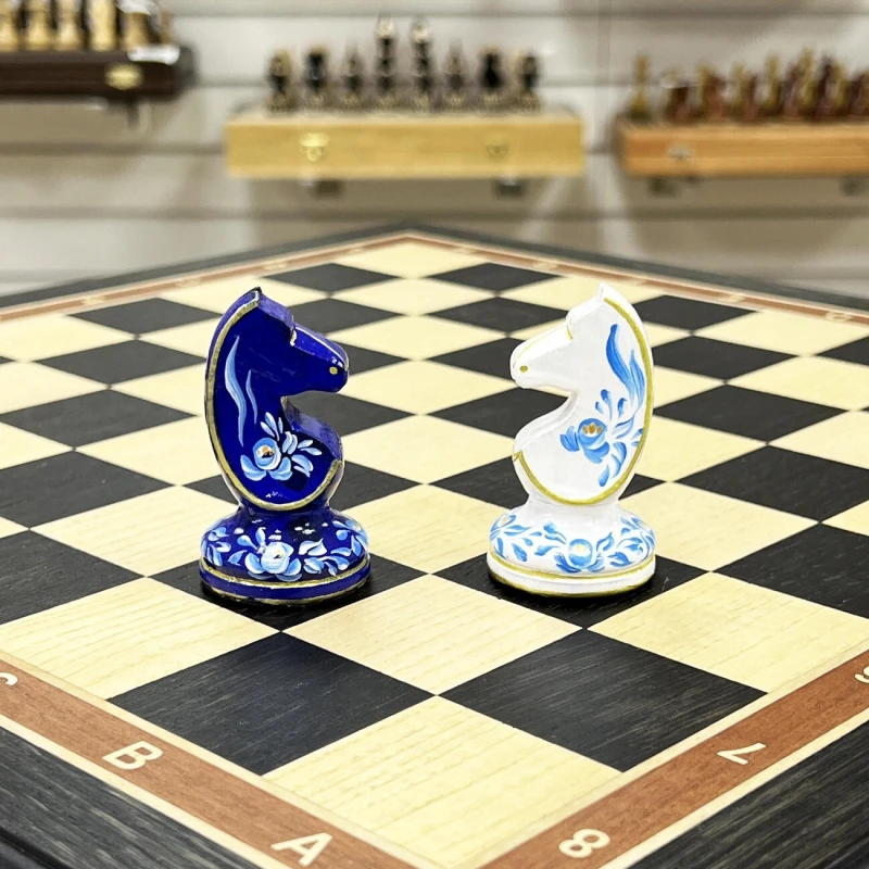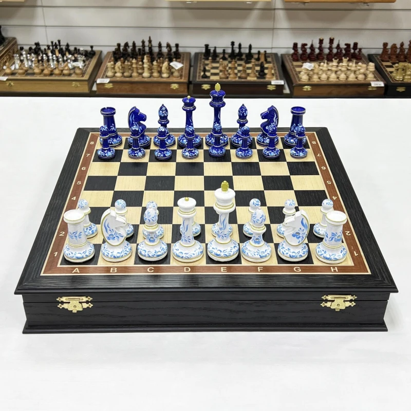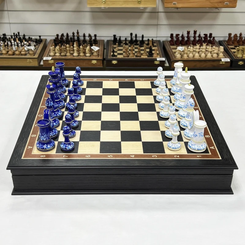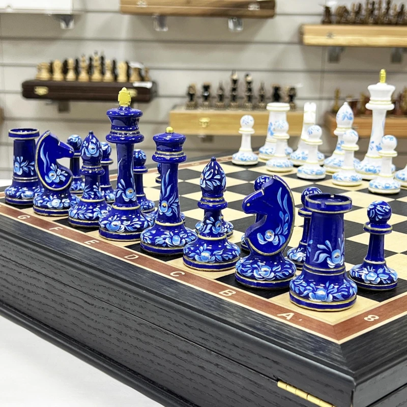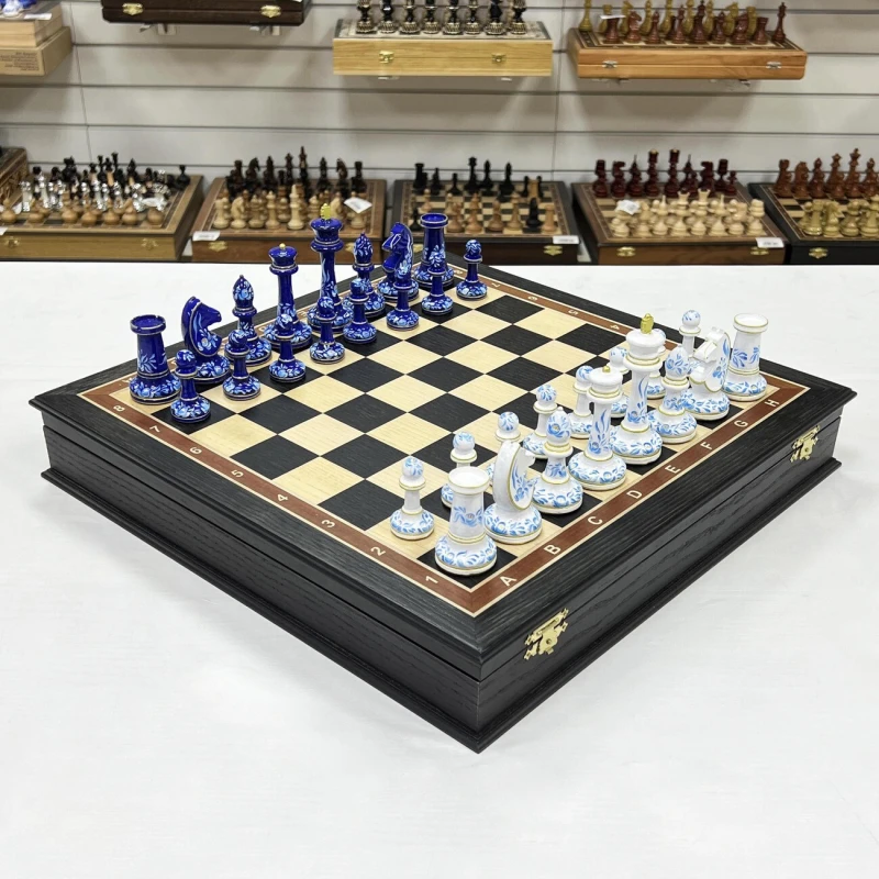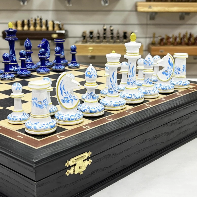 Большие подарочные шахматы ручной работы из дерева. Размер доски 45 на 45 см. Внутри доски есть ячейки для бережного хранения фигур. Высота короля 10.5 см. Фигуры с утяжелением, материал фигур бук. Шахматные фигуры росписаны вручную художником в стиле гжель. Подойдут в подарок иностранцам, сделаны в России. Шахматное поле собирается в технике маркетри из моренного дуба и ясеня.