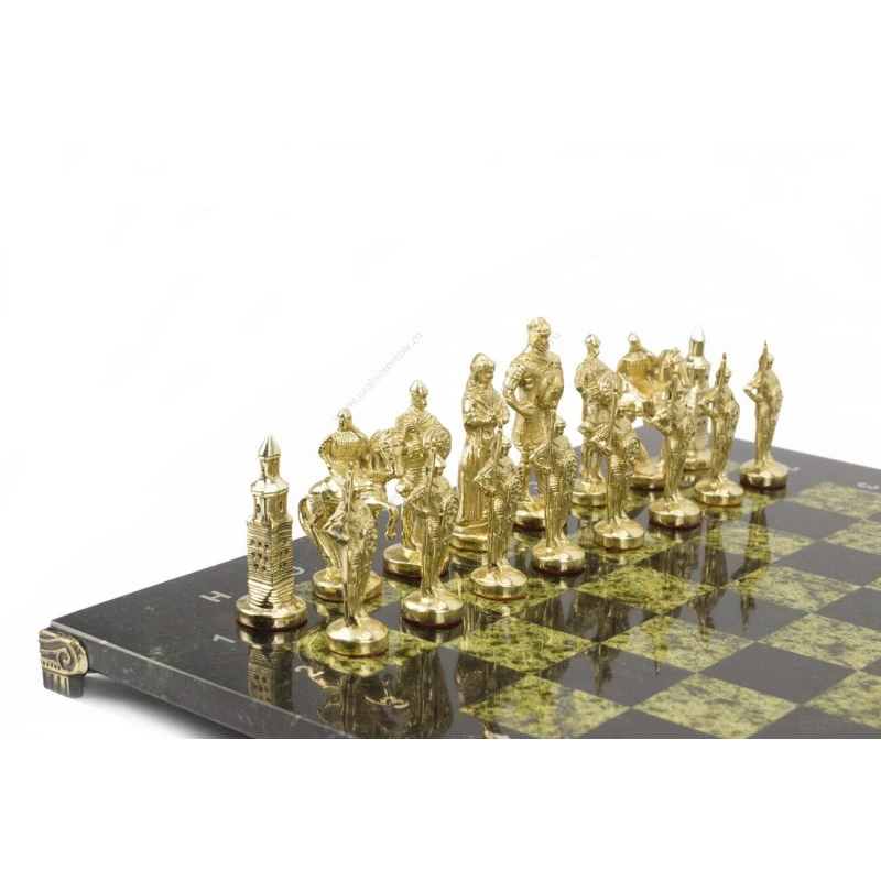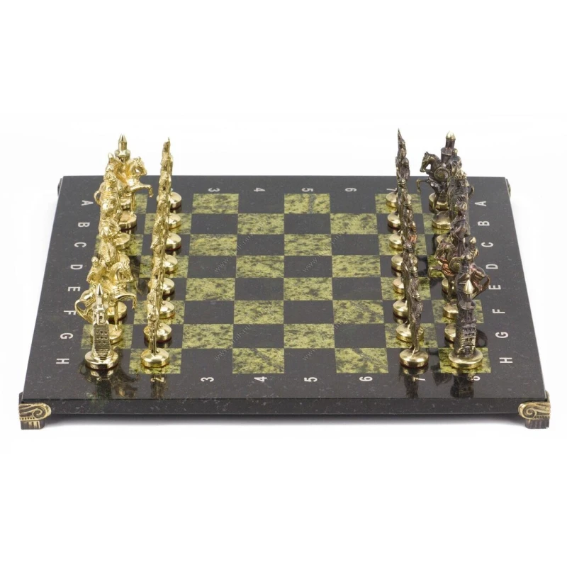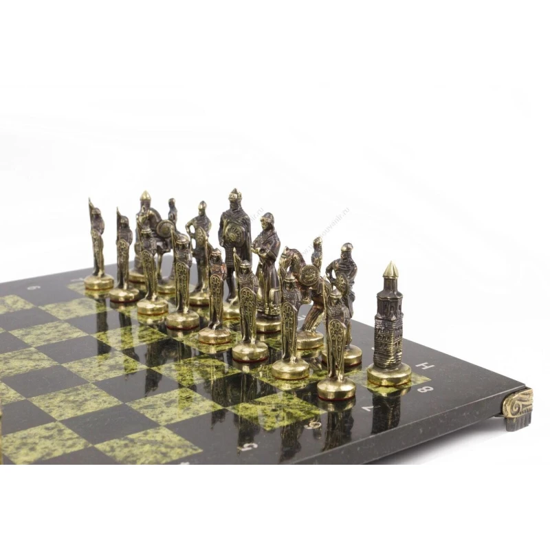 Доска из змеевика, фигуры из бронзы. Размер: доска 400х400х30 мм, клетка 40х40 мм, высота фигур 75-95 мм.