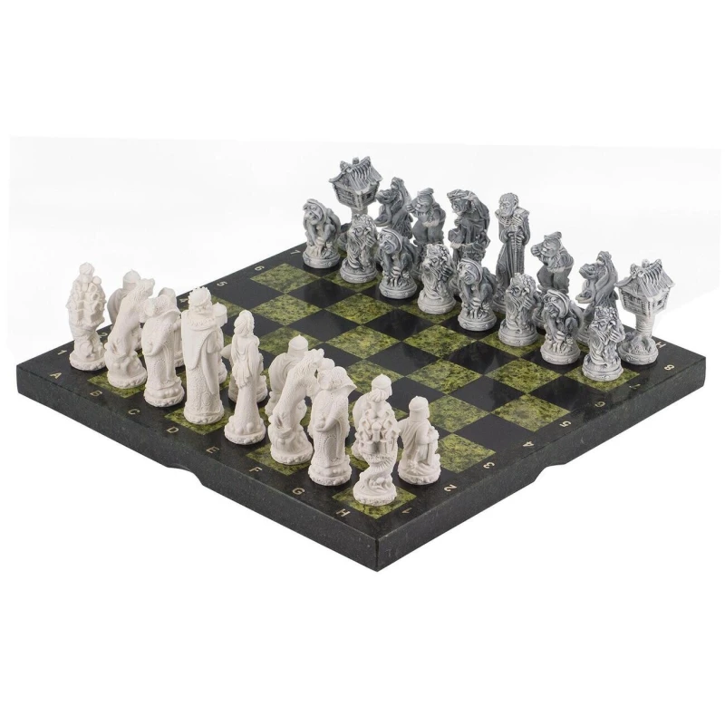 Доска из змеевика, фигуры из литьевого мрамора. Размер: доска 400х400х30 мм, клетка 45х45 мм, высота фигур 60-115 мм.