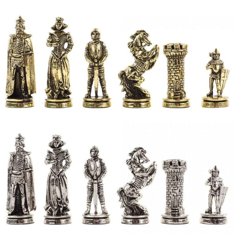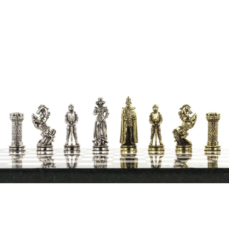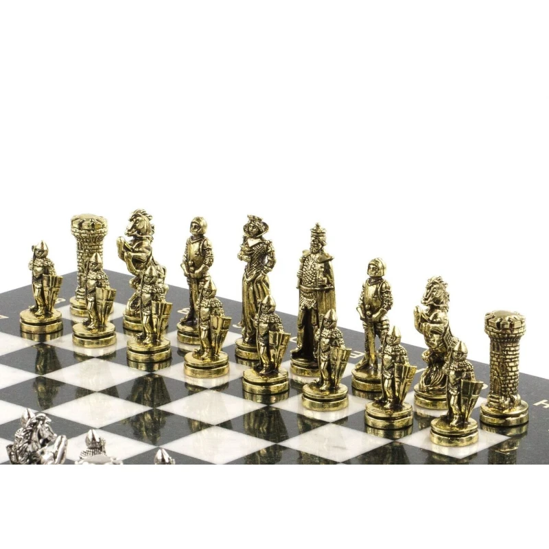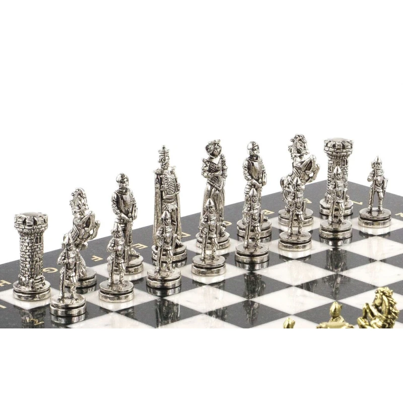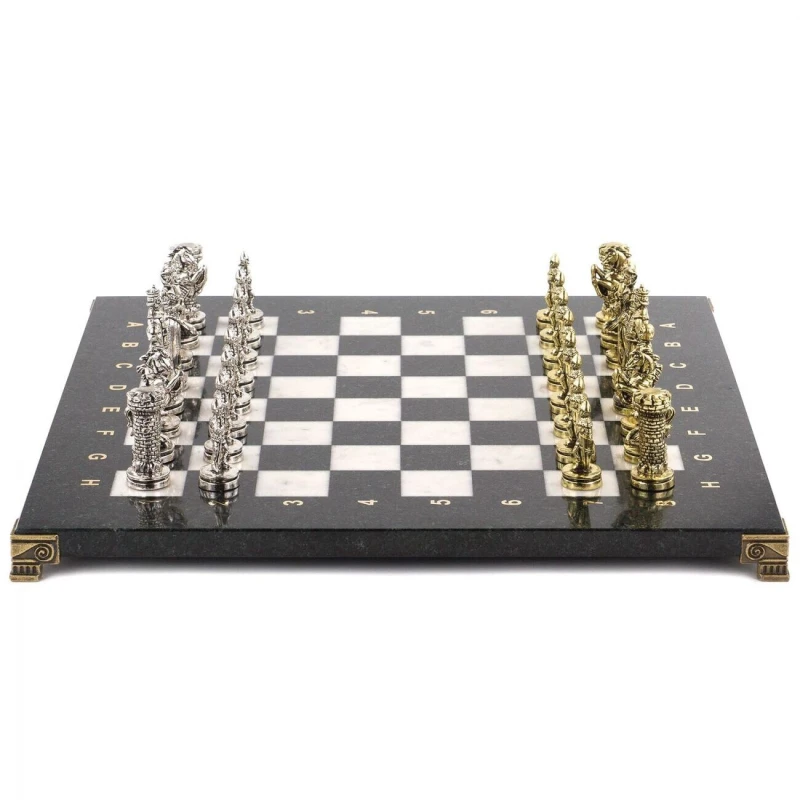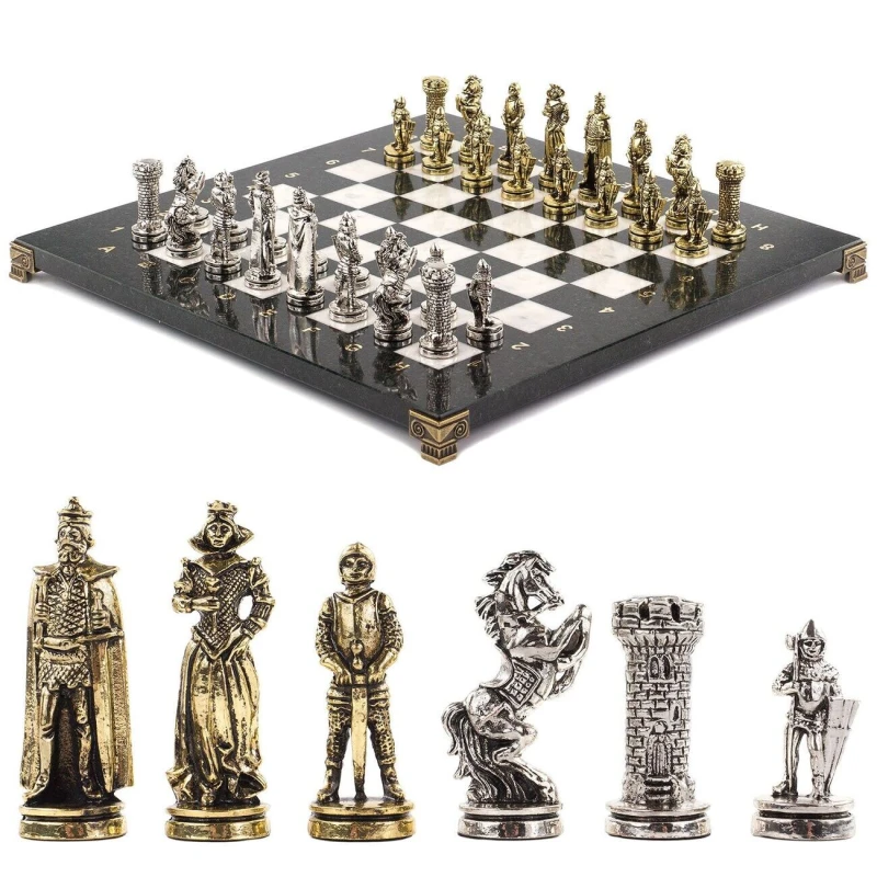 Подарочные каменные шахматы - Рыцари. Размер доски 36 на 36 см. Размер клетки -3.5 см. Доска имеет 4 устойчивые ножки из бронзы. Фигуры выполнены в античной тематике. Размер короля - 6.8 см, пешки - 4.4 см. Шахматы изготовлены вручную из натурального камня, каждое изделие имеет индивидуальный оттенок и рисунок. Допускается наличие прожилок и внутренних трещин в камне, размеры могут немного отличаться. Комплект шахмат продается вместе с подарочным кейсом из экокожи. Сделано в России.