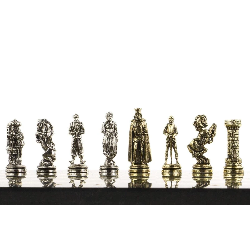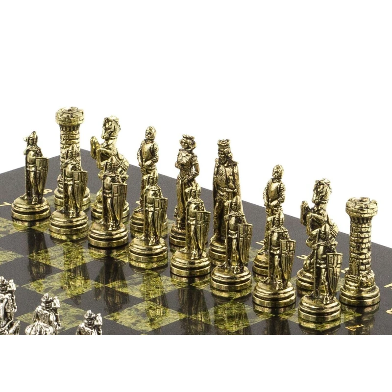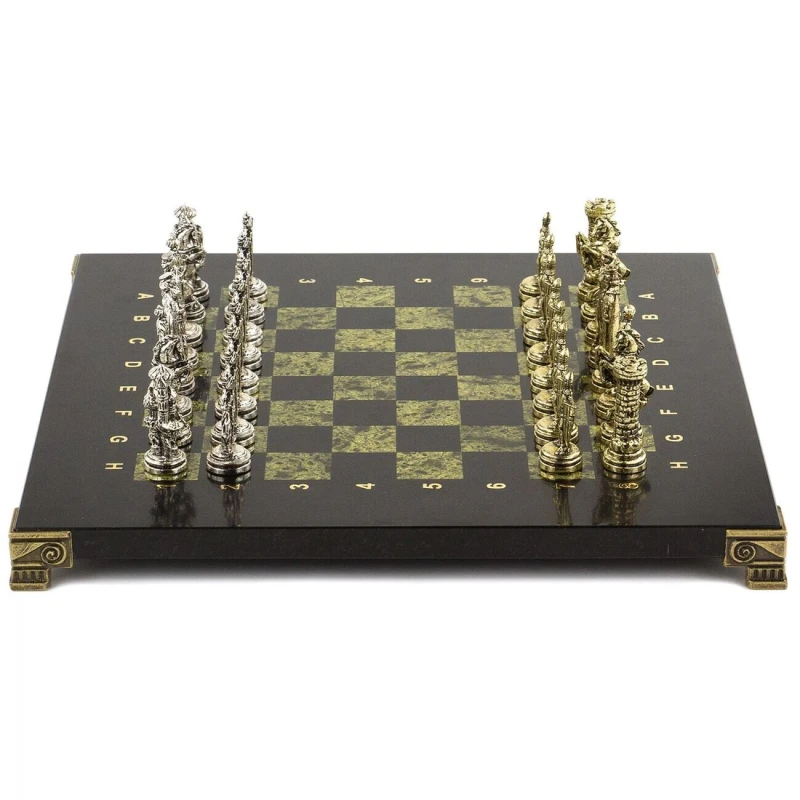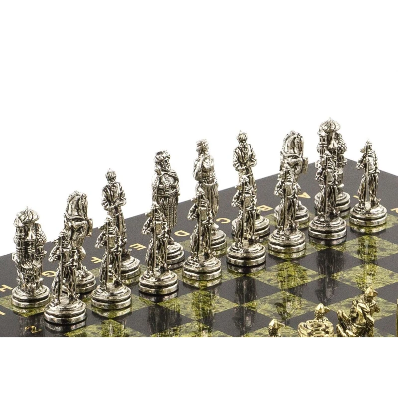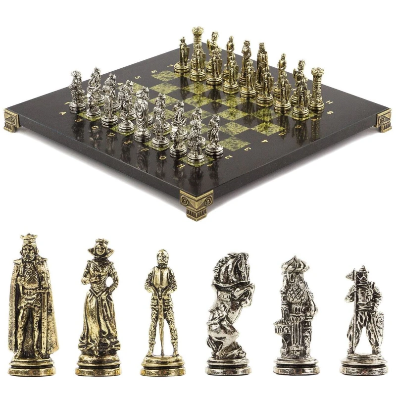 Шахматы выполнены из натурального змеевика с металлическими фигурами, покрытыми под золотом и серебром. Размеры доски составляют 28х28х2,5 см, а вес – 6,3 кг.