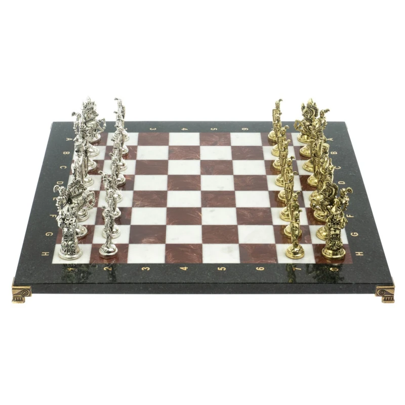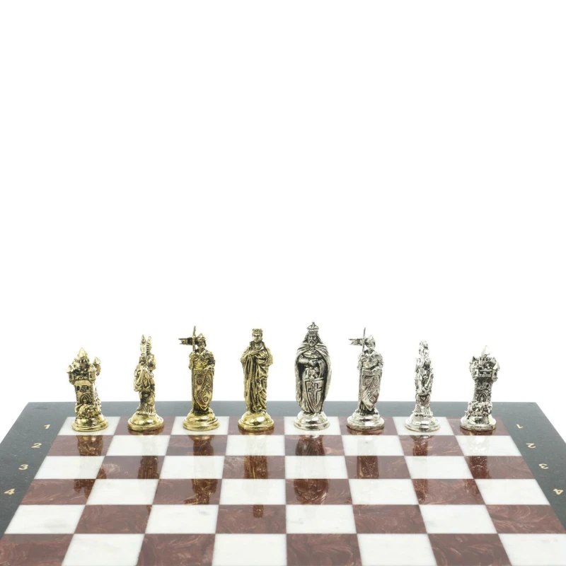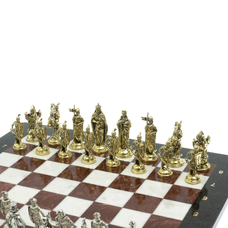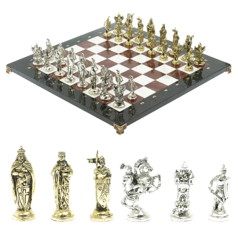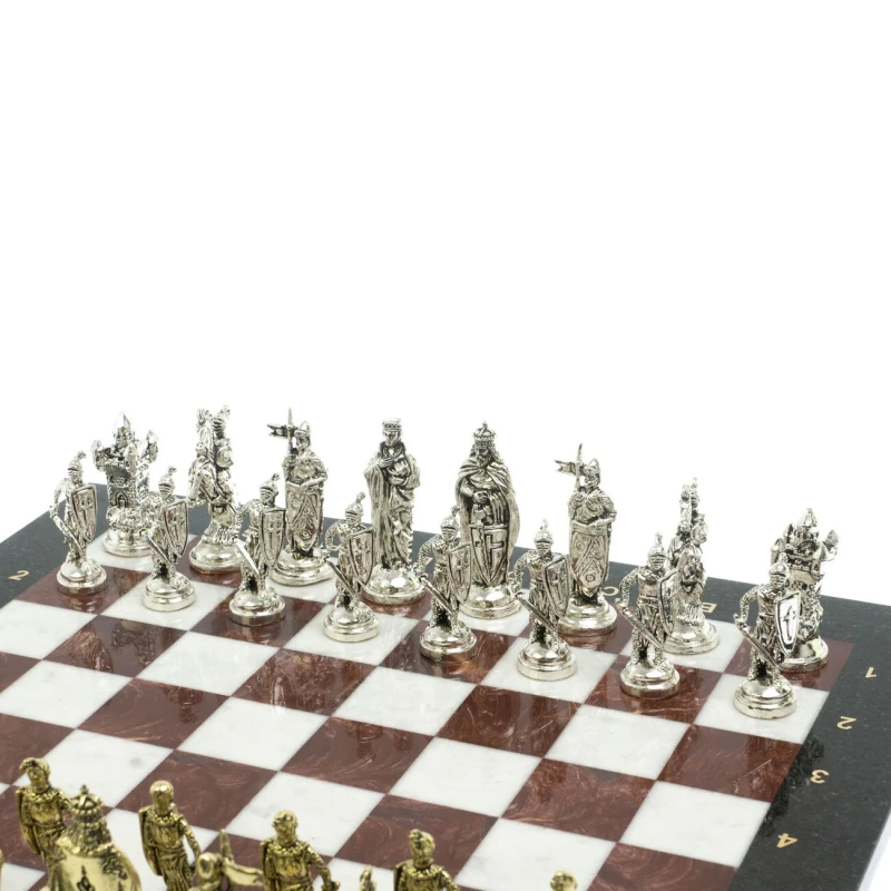 Набор для игры в шахматы "Рыцари крестоносцы" изготовлен вручную, доска из натурального камня, шахматные фигуры металлические в цвете золото и серебро.