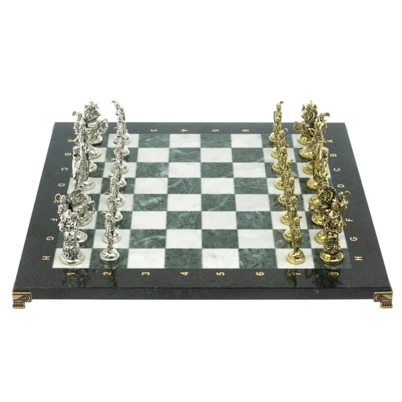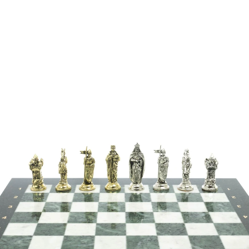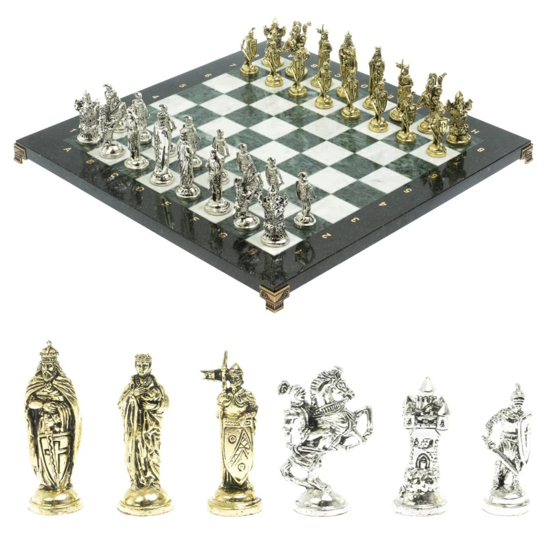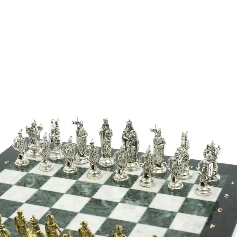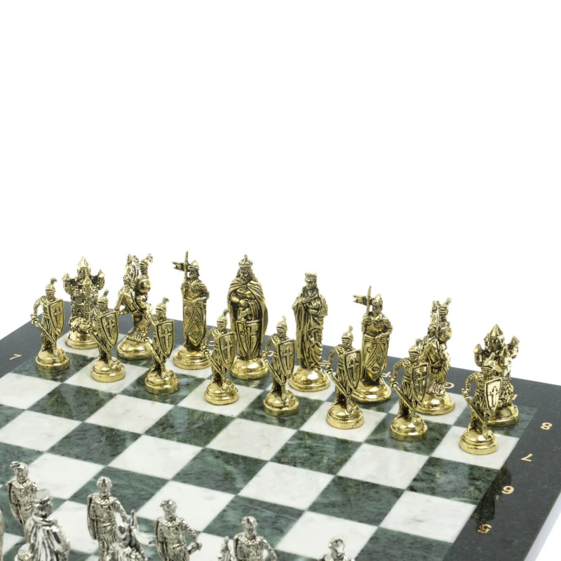 Набор для игры в шахматы "Рыцари крестоносцы" изготовлен вручную, доска из натурального камня, шахматные фигуры металлические в цвете золото и серебро.