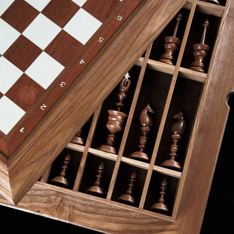 конструкция доски со съемной верхней крышкой, в нижней части доски сделаны ячейки для каждой фигурки